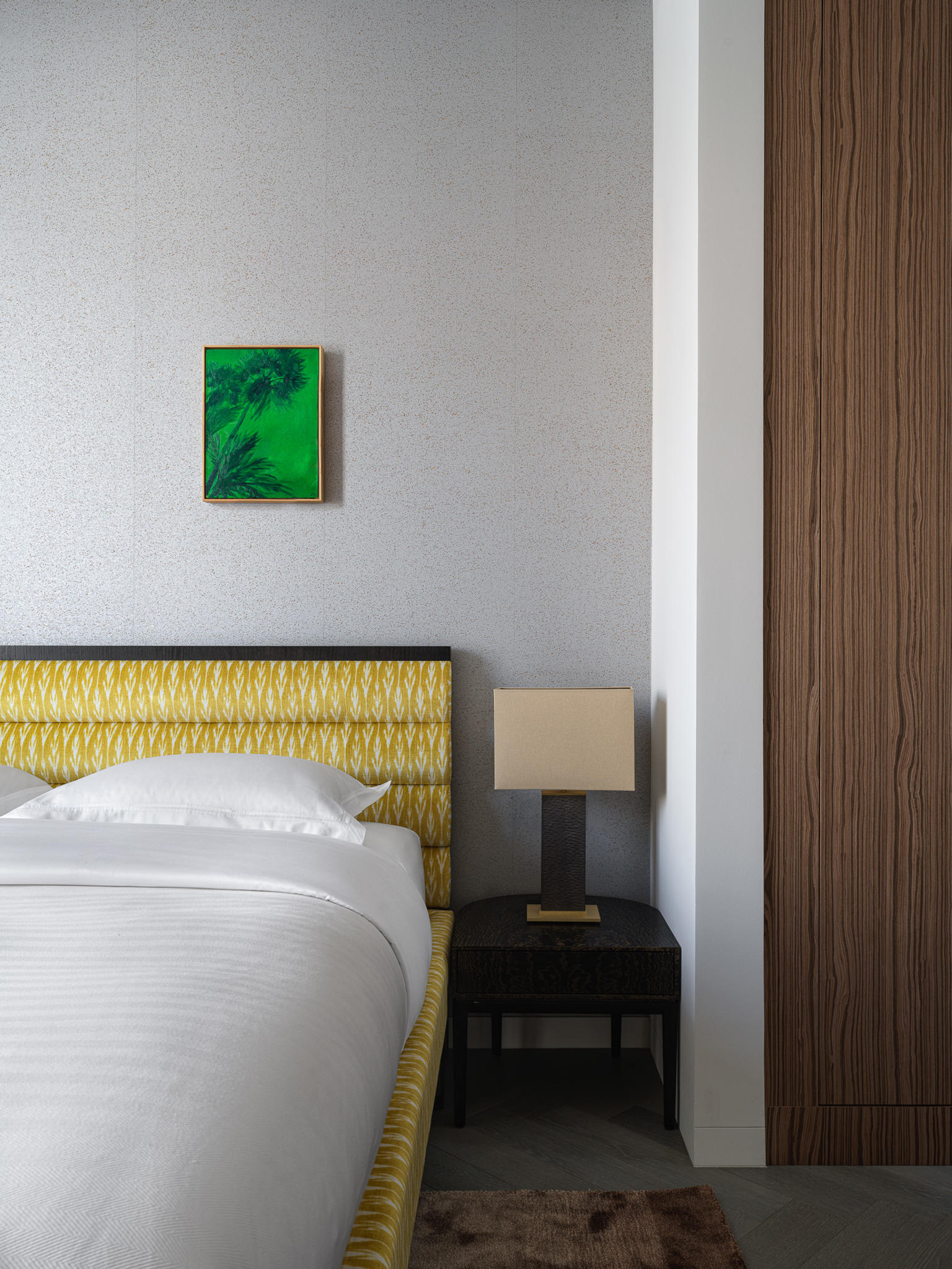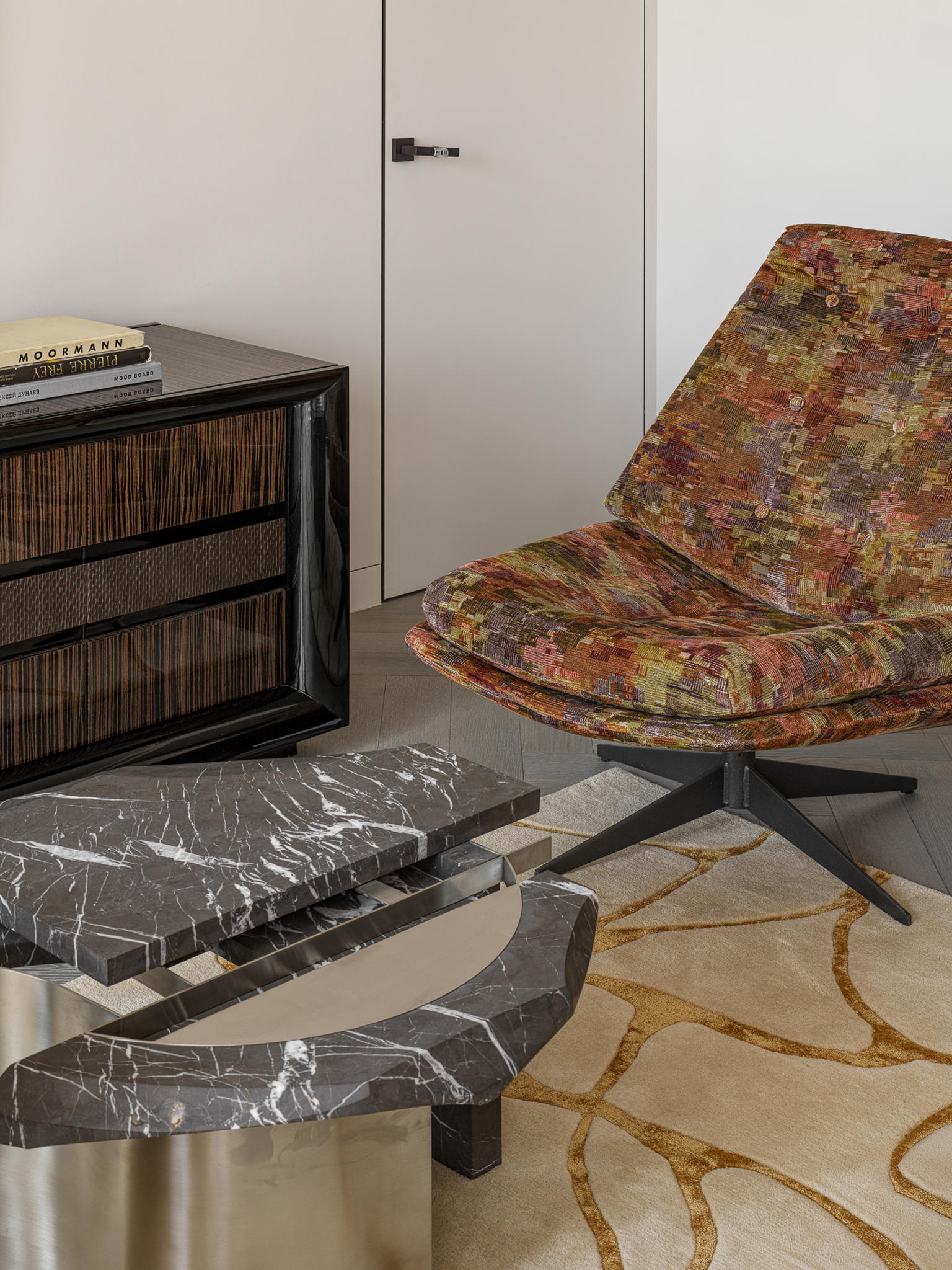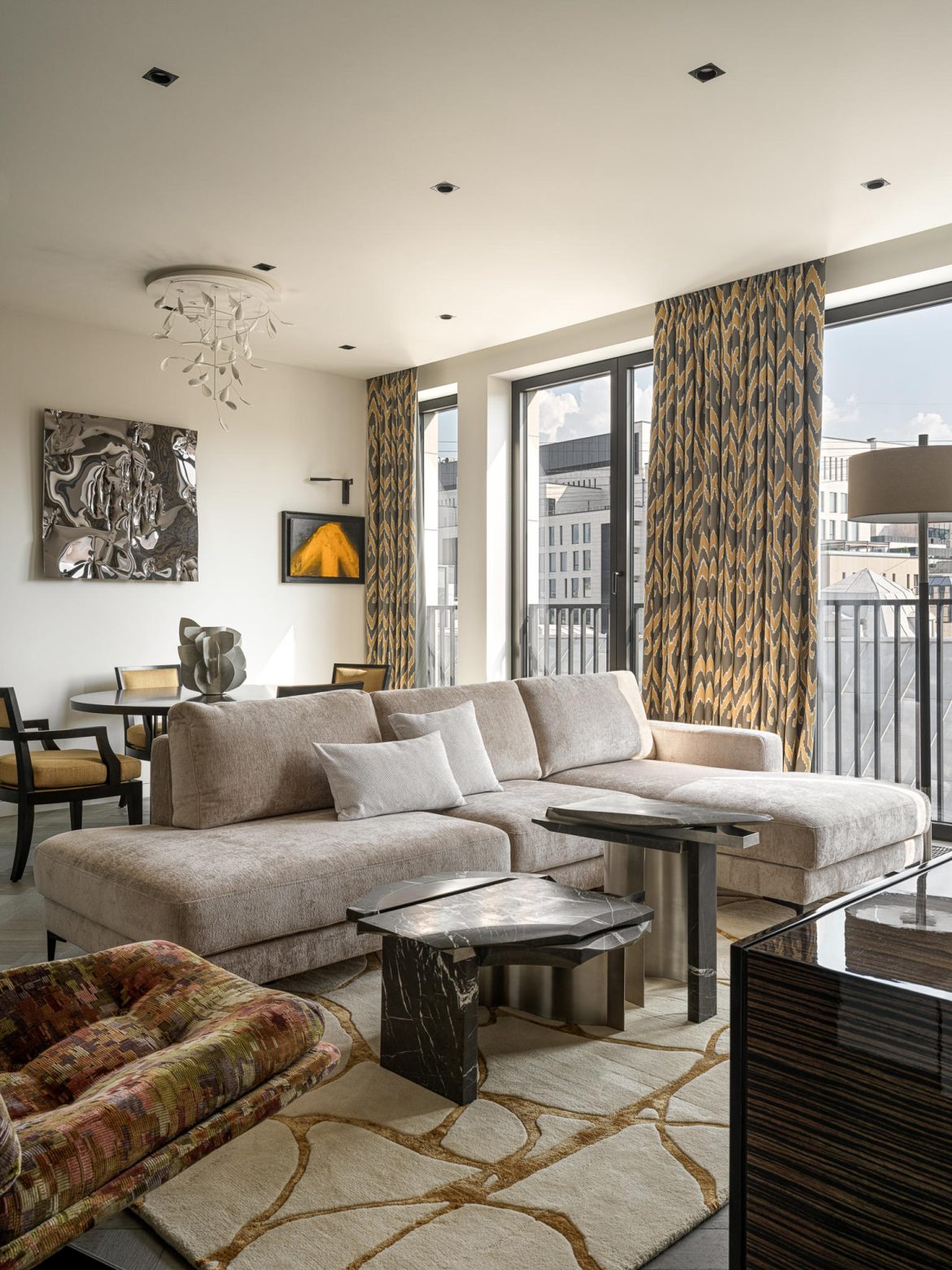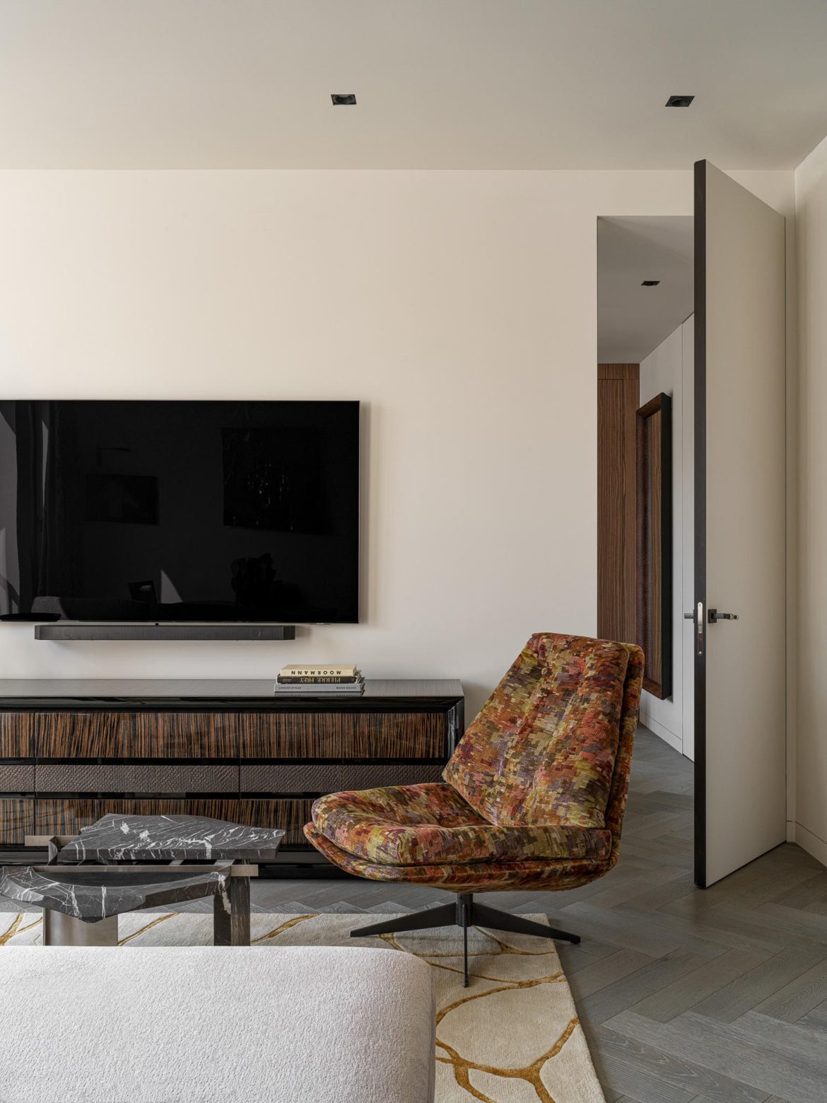 Materiality plays a central role. A calm architectural base — refined wall finishes, measured geometry, and natural wood — is balanced by layered textures and curated statement pieces. Pierre Frey textiles introduce movement and depth, while collectible tables by Spanish studio Todomuta function as sculptural anchors within the living area. Lighting by Porta Romana was selected not merely as illumination, but as architectural punctuation — shaping atmosphere through soft gradients rather than direct emphasis.
