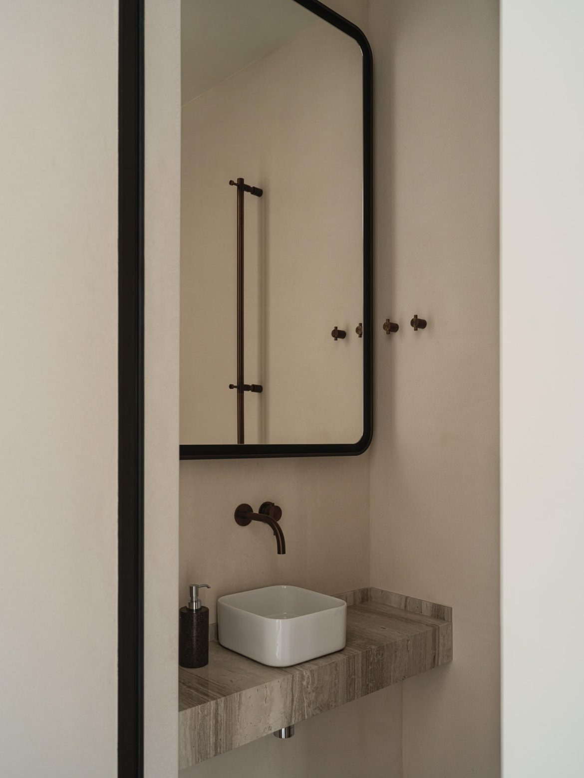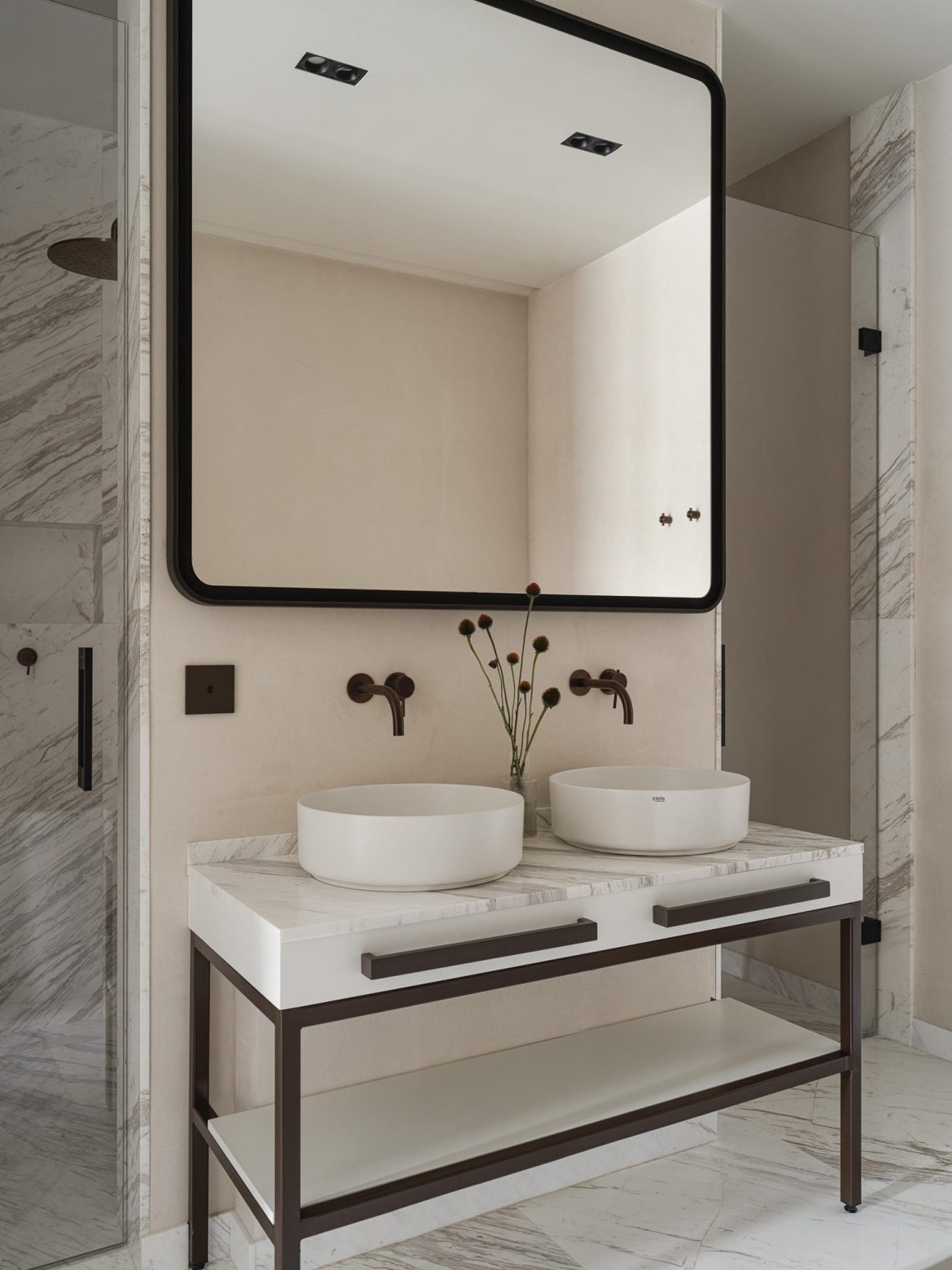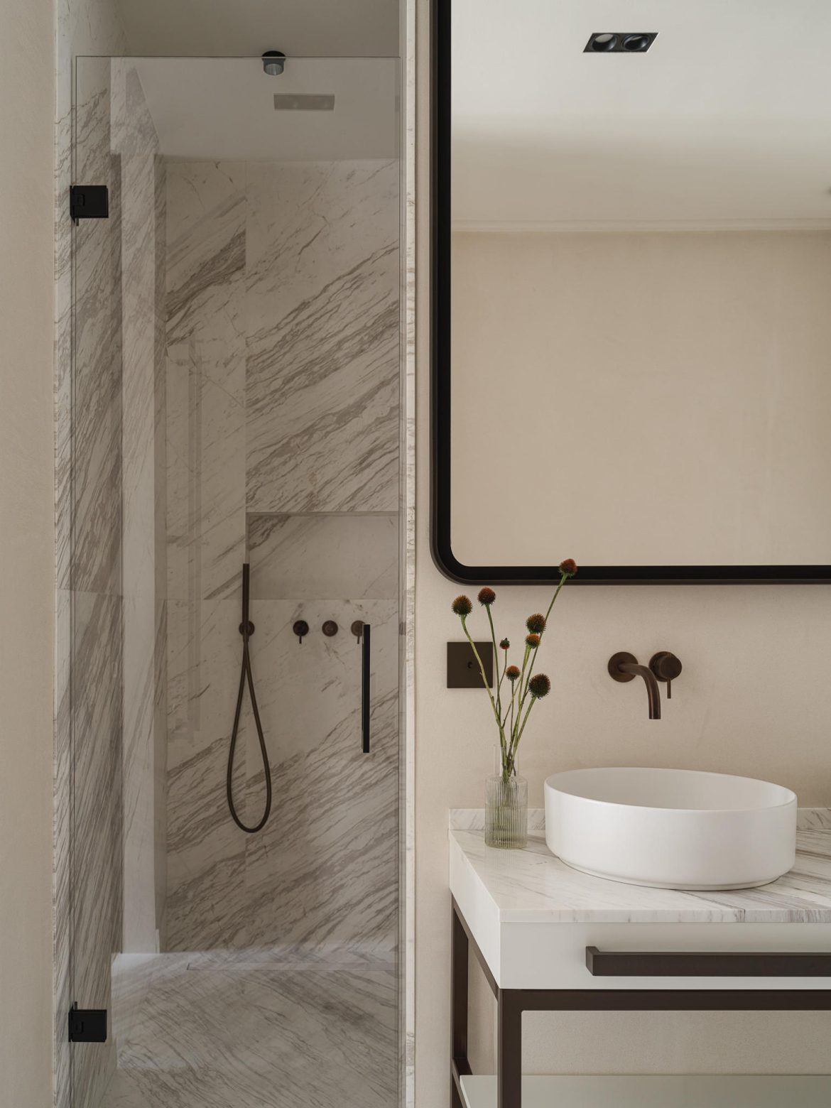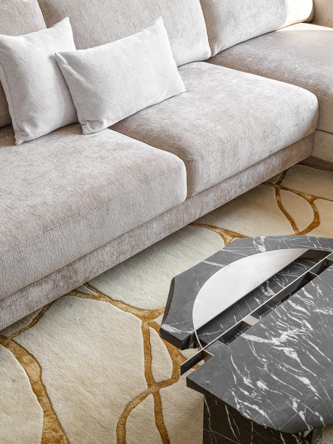 Materiality plays a central role. A calm architectural base — refined wall finishes, measured geometry, and natural wood — is balanced by layered textures and curated statement pieces. Pierre Frey textiles introduce movement and depth, while collectible tables by Spanish studio Todomuta function as sculptural anchors within the living area. Lighting by Porta Romana was selected not merely as illumination, but as architectural punctuation — shaping atmosphere through soft gradients rather than direct emphasis.