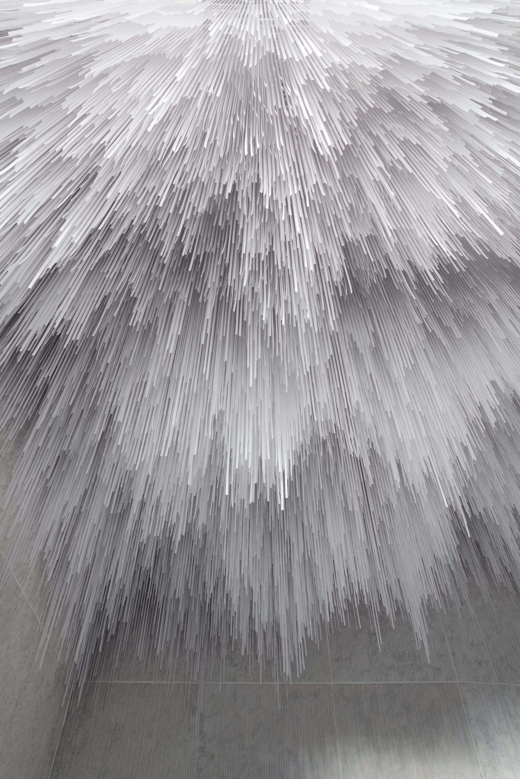 Recalls the passage of water through calcium, slowly growing organic forms that evoke the persistence of gravity, time, and weathering. The ceiling installation consists of densely packed tyvek filaments which glow as they diffuse light through their varying depths.
