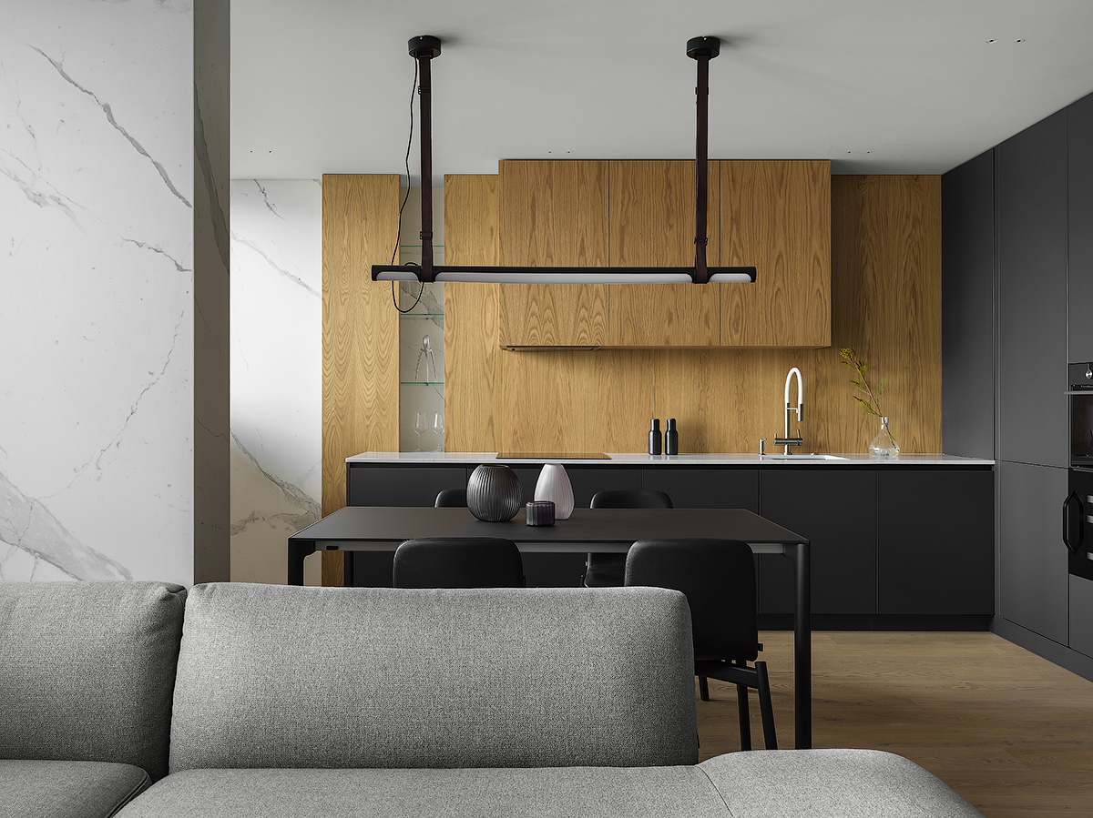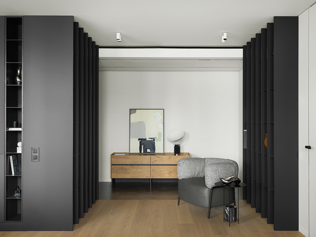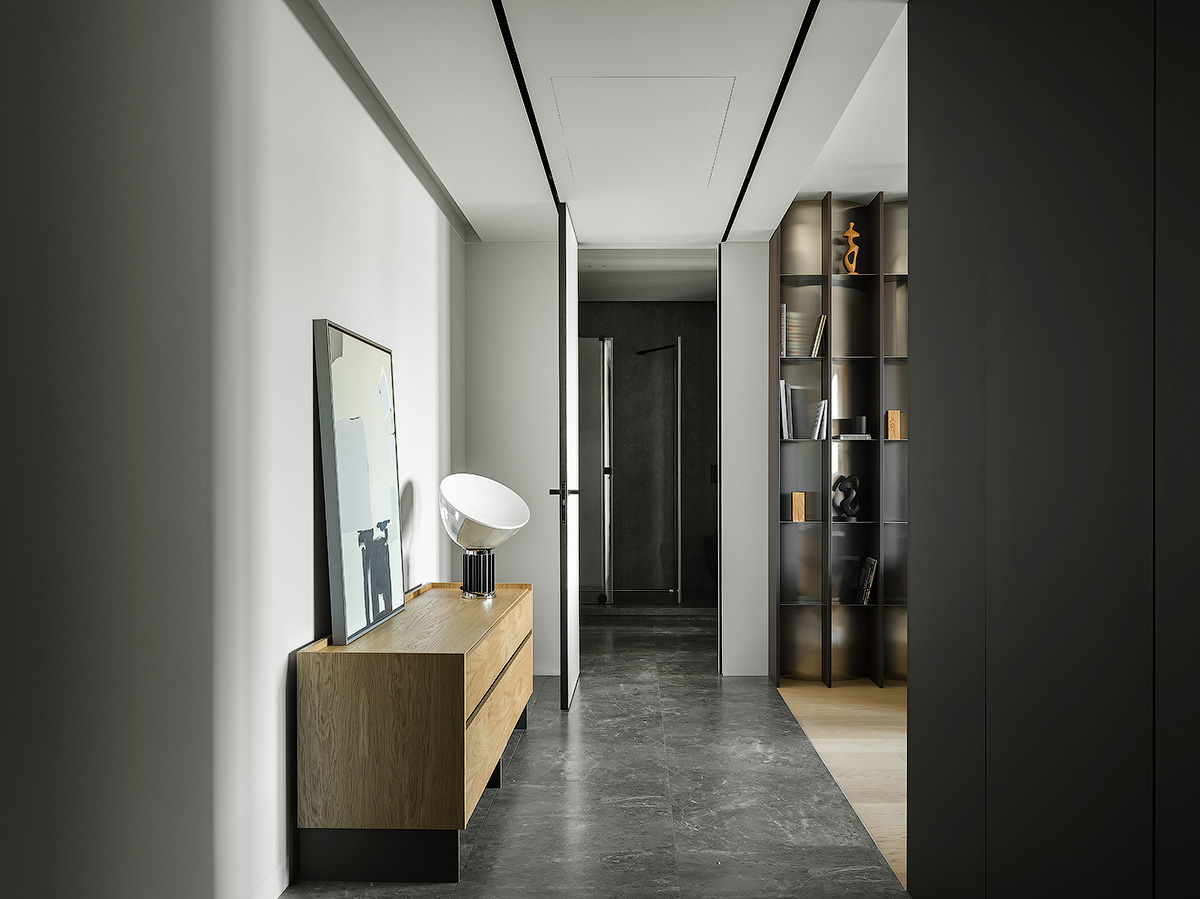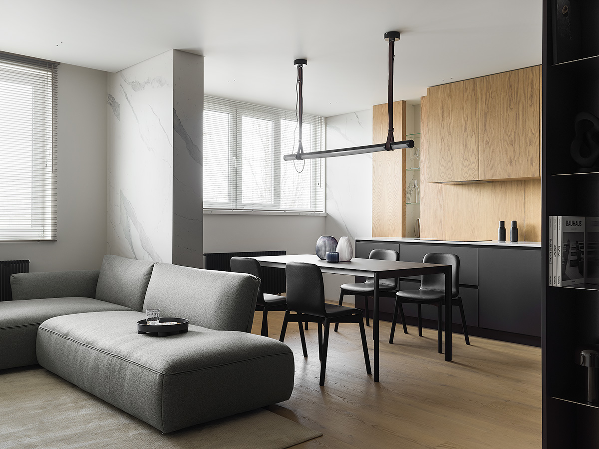 The monolithic pylon in the living room is finished with large-format porcelain stoneware, as is the niche in the kitchen.