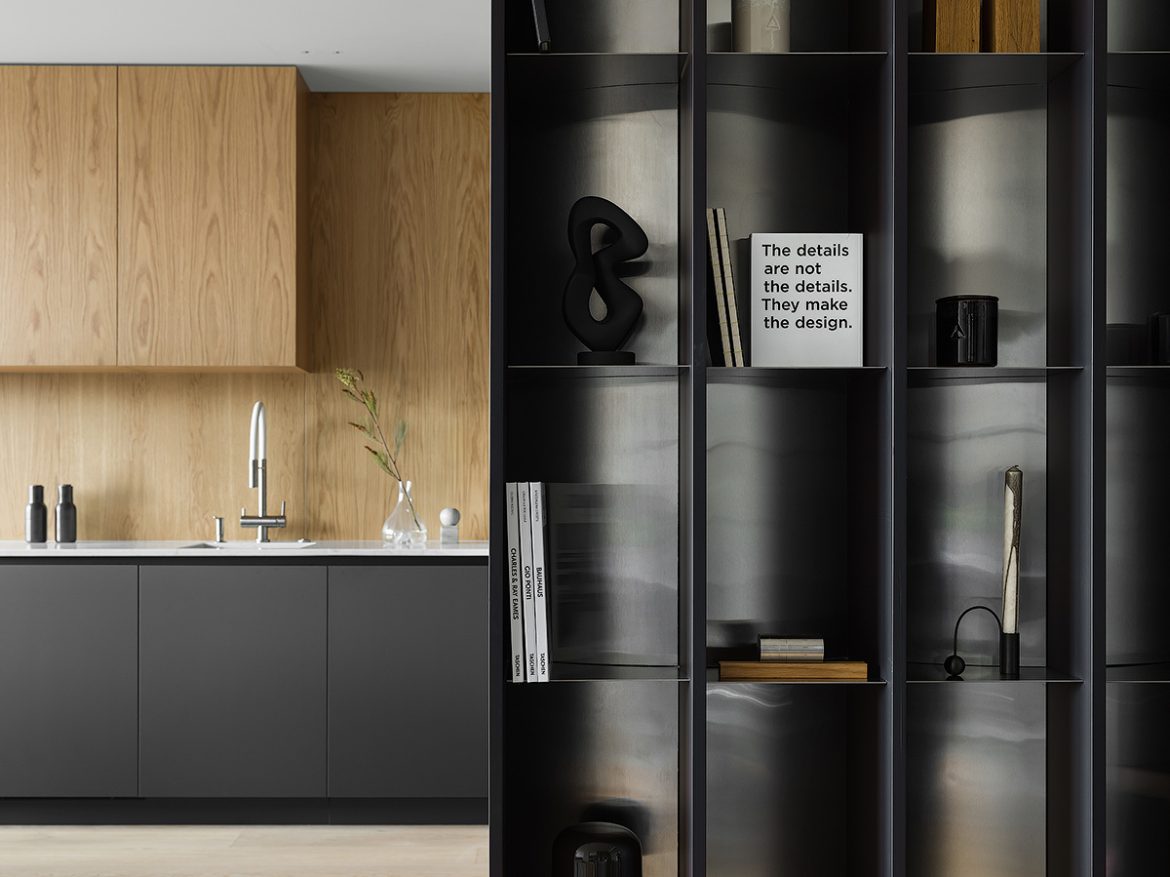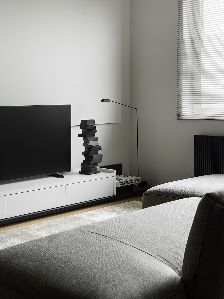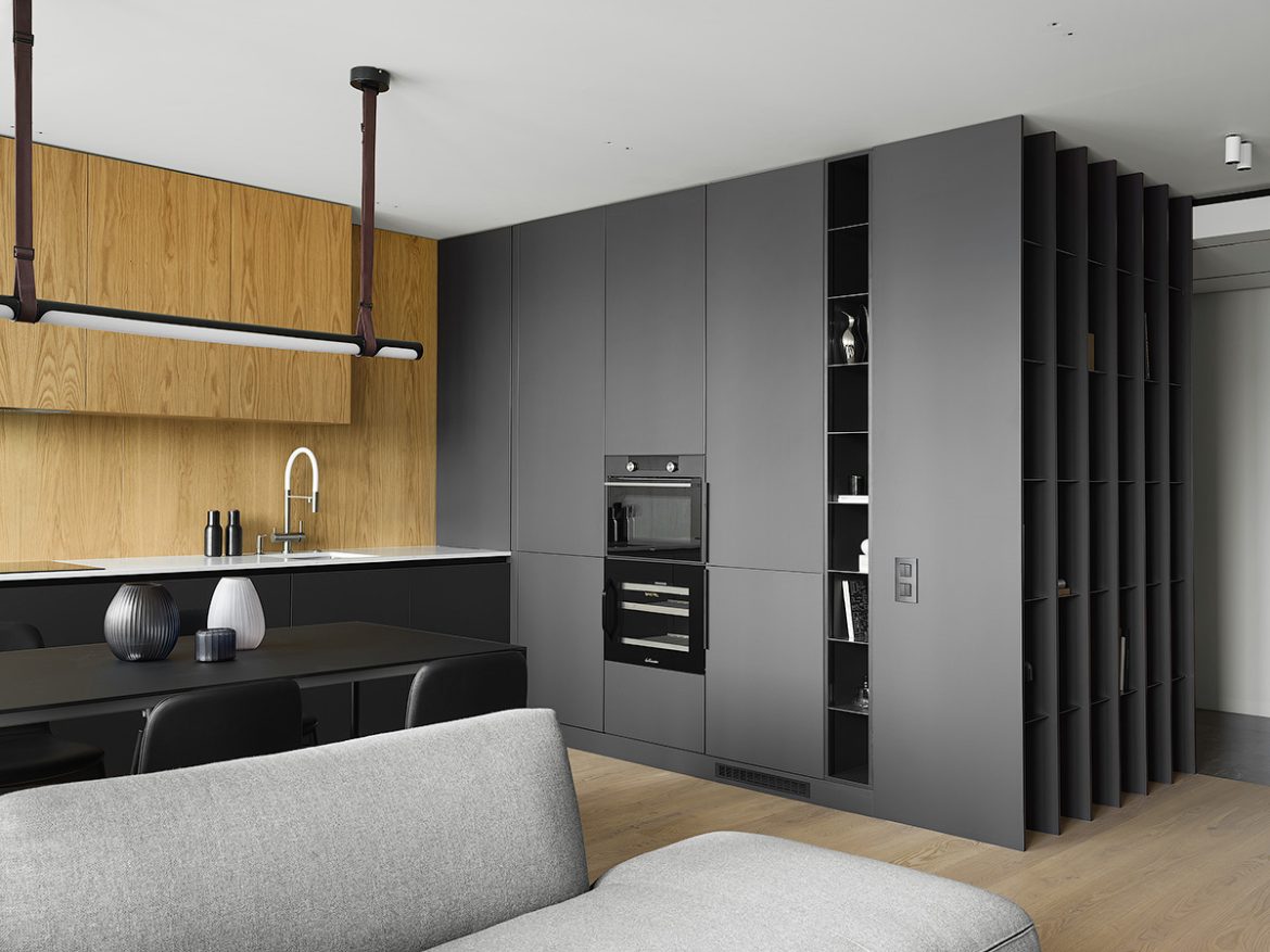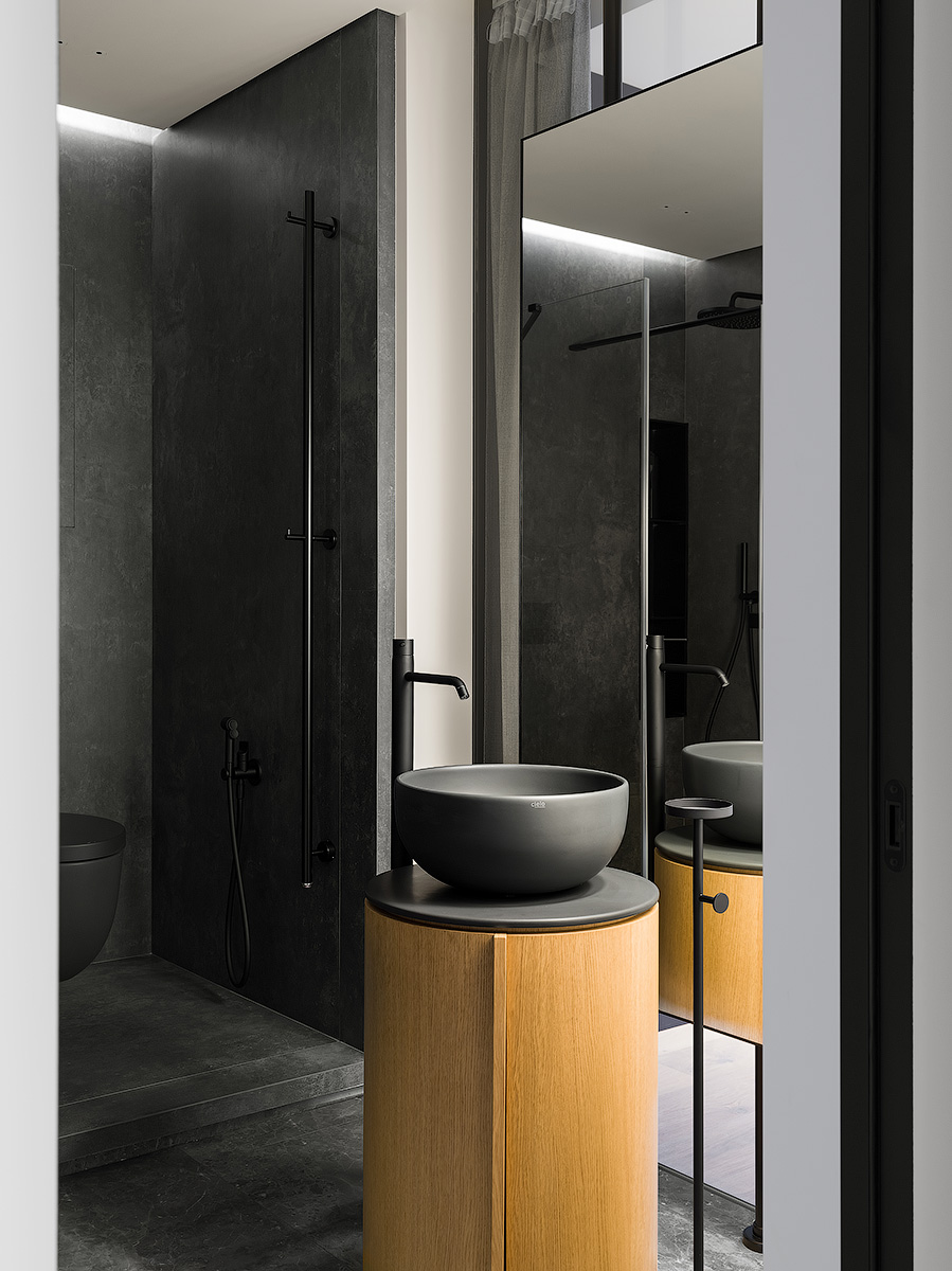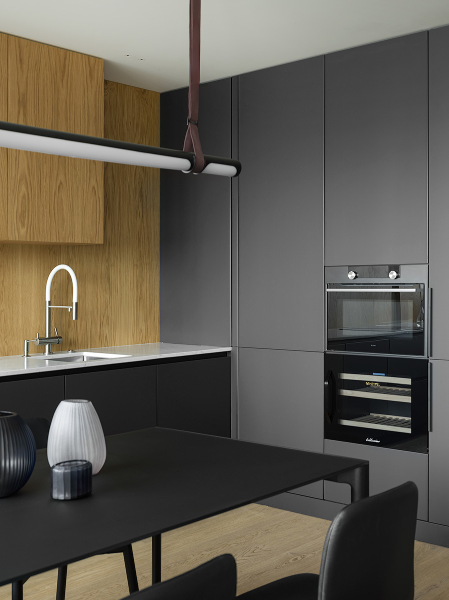 The monolithic pylon in the living room is finished with large-format porcelain stoneware, as is the niche in the kitchen.