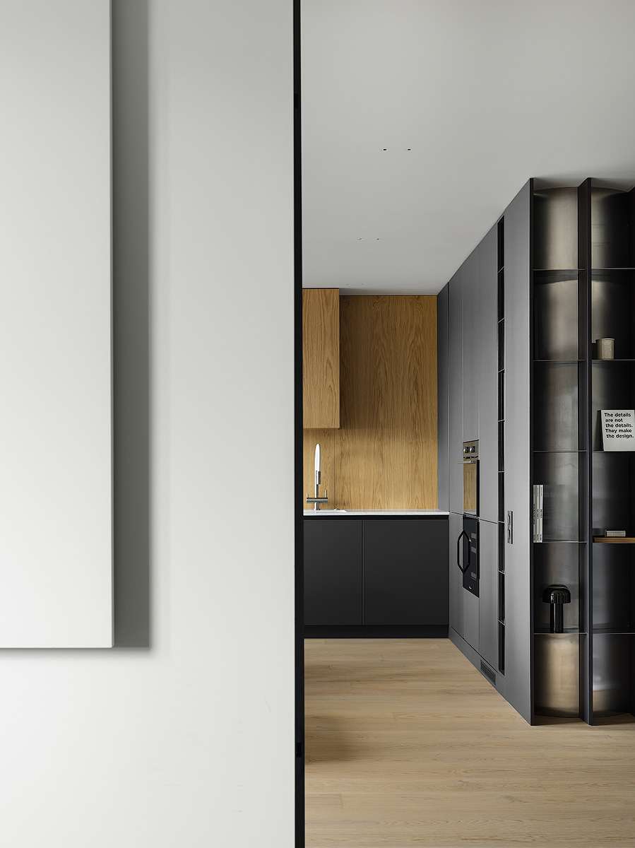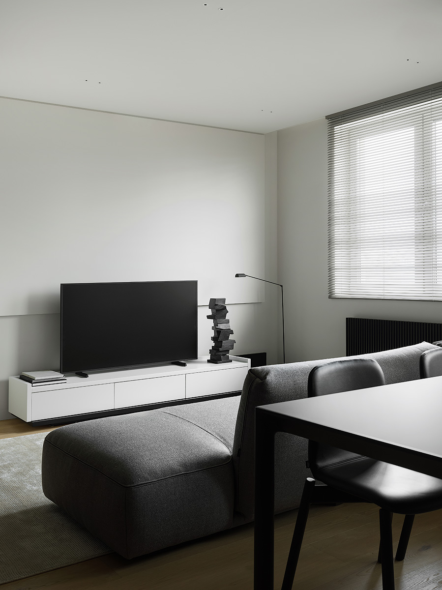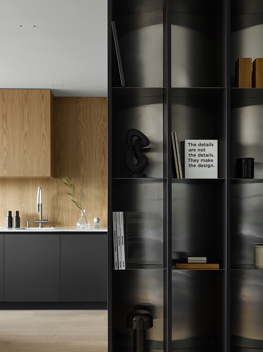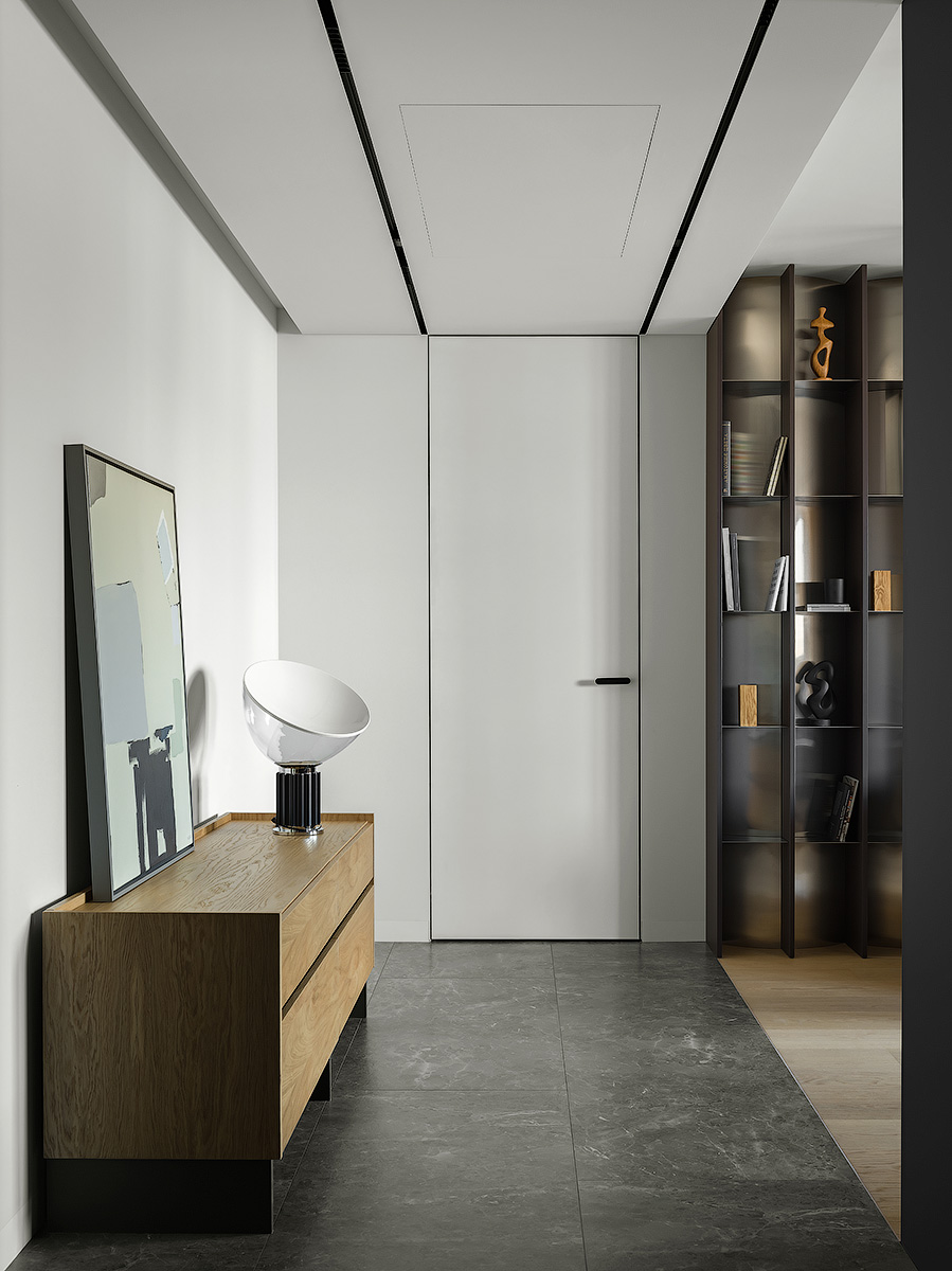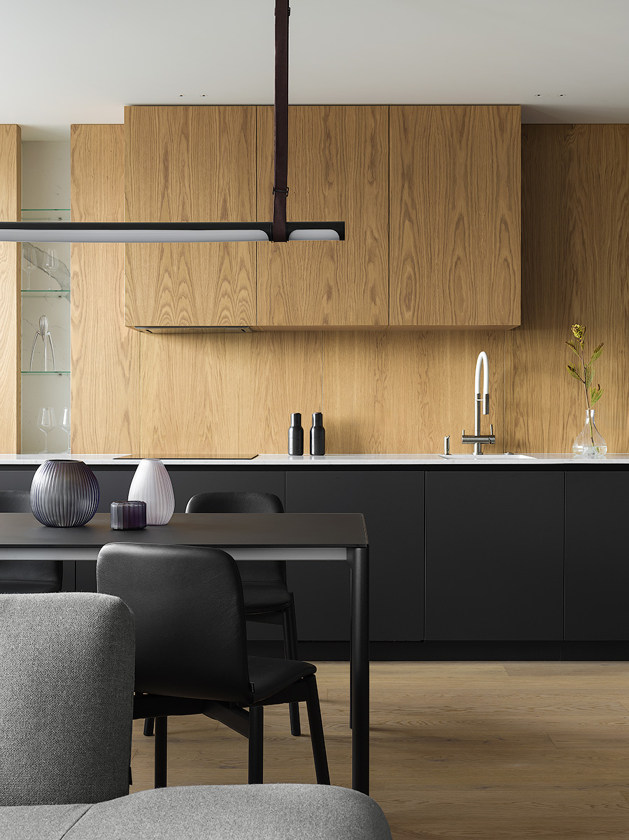 The monolithic pylon in the living room is finished with large-format porcelain stoneware, as is the niche in the kitchen.