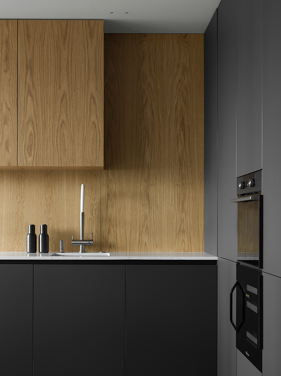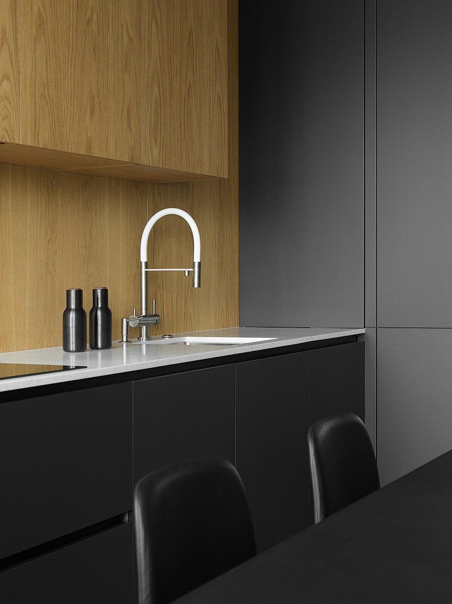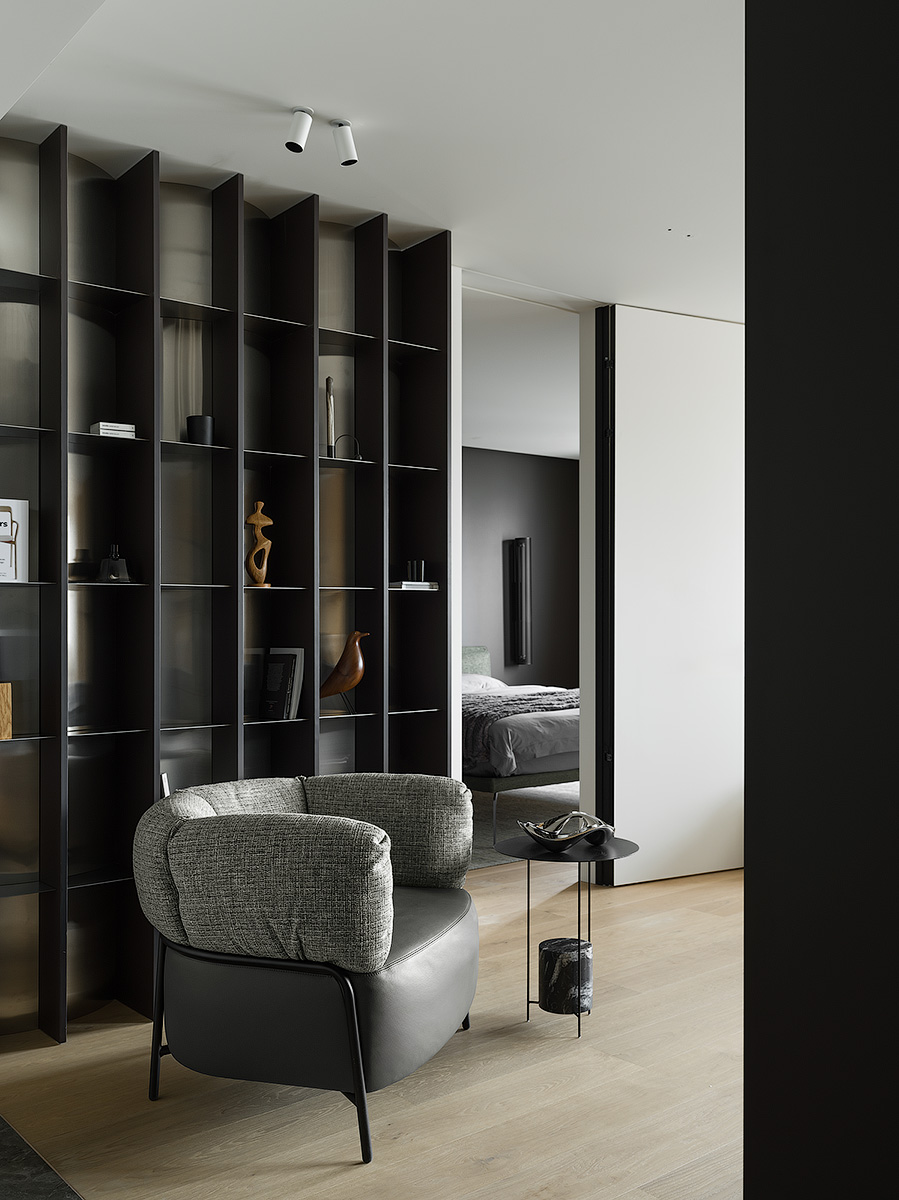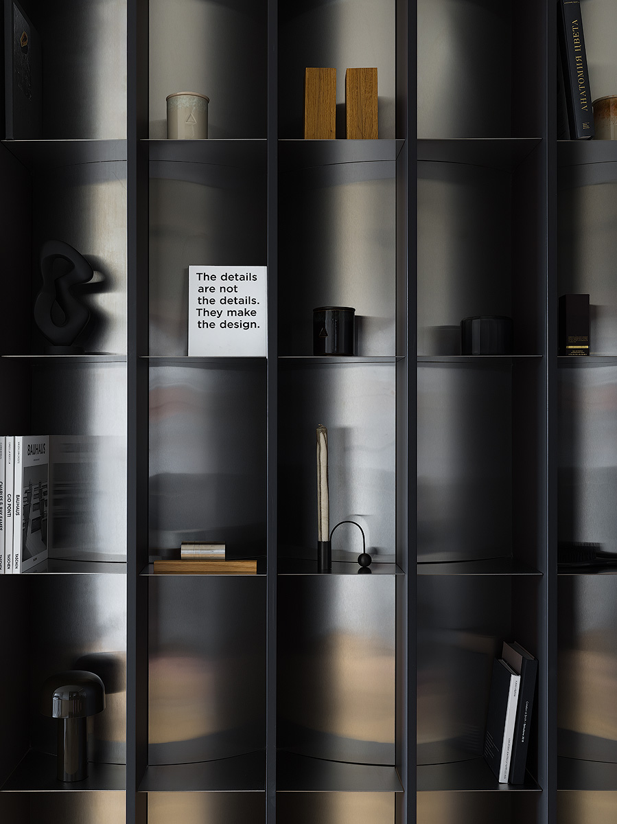 The monolithic pylon in the living room is finished with large-format porcelain stoneware, as is the niche in the kitchen.
