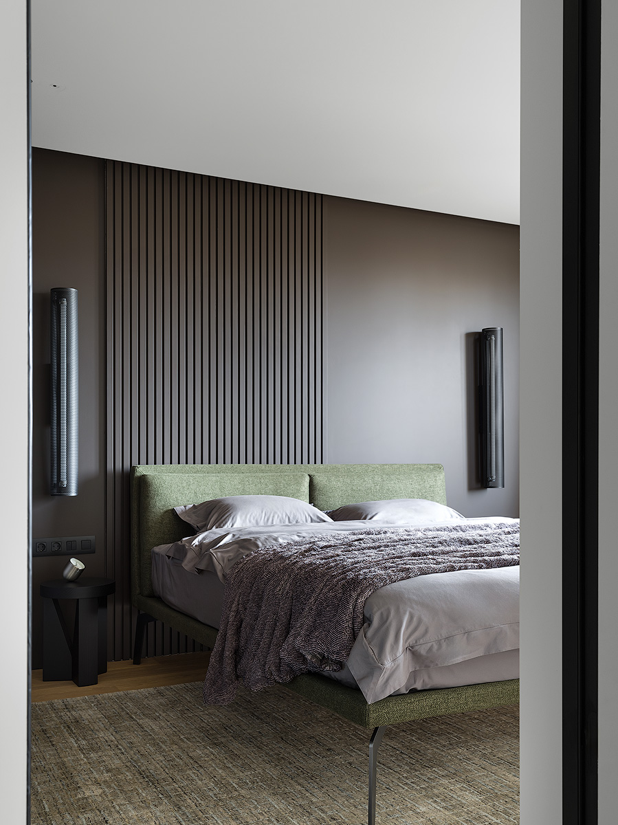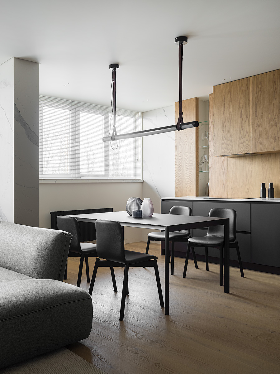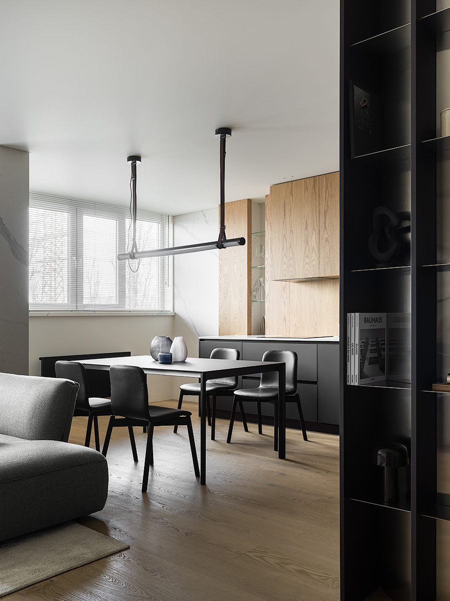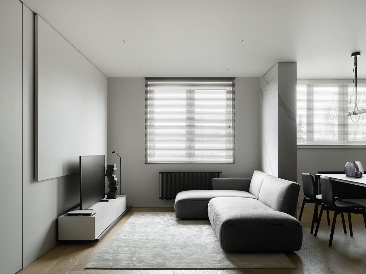 The blinds on the windows emphasize the graphic nature and purity of the interior. Only in the bedroom is softness added by textiles – curtains of a neutral gray shade, and a decorative bedspread that casually decorates the space.