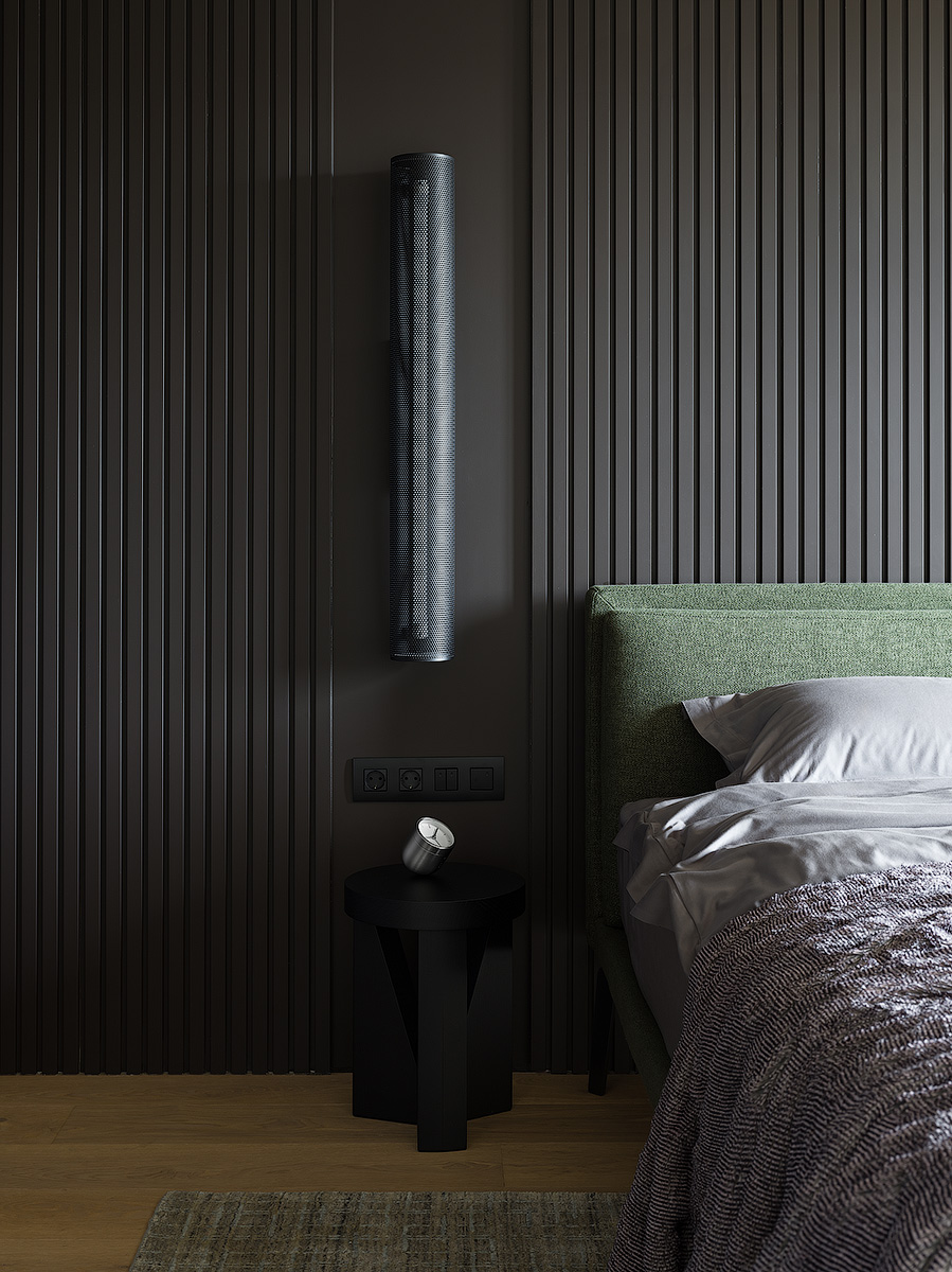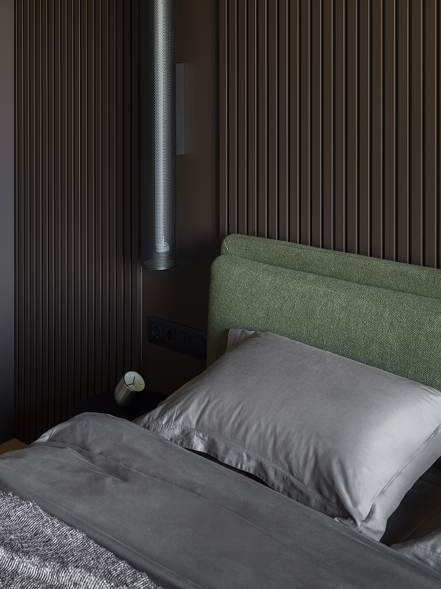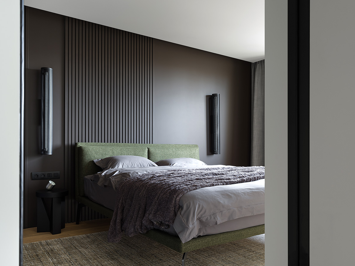 The blinds on the windows emphasize the graphic nature and purity of the interior. Only in the bedroom is softness added by textiles – curtains of a neutral gray shade, and a decorative bedspread that casually decorates the space.