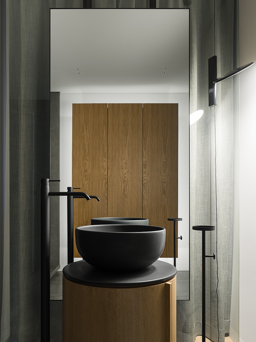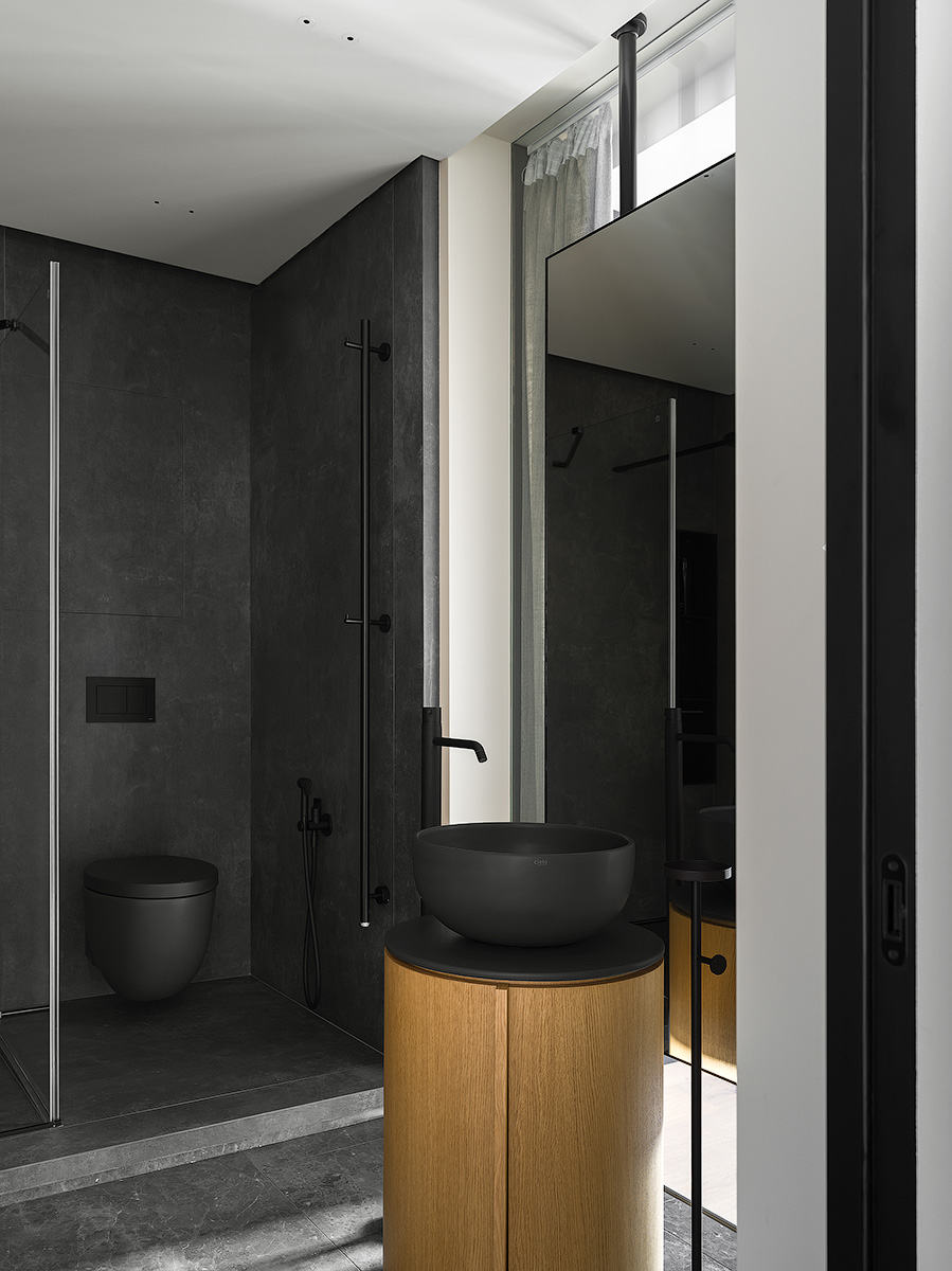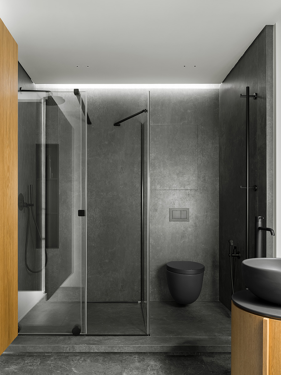 An original and bold solution is a window between the bathroom and the bedroom. The bathroom in gray shades, in a noble combination with natural wood. The shower on the podium gives a visual additional figure in the common space, for an additional effect it is made in a different tile.