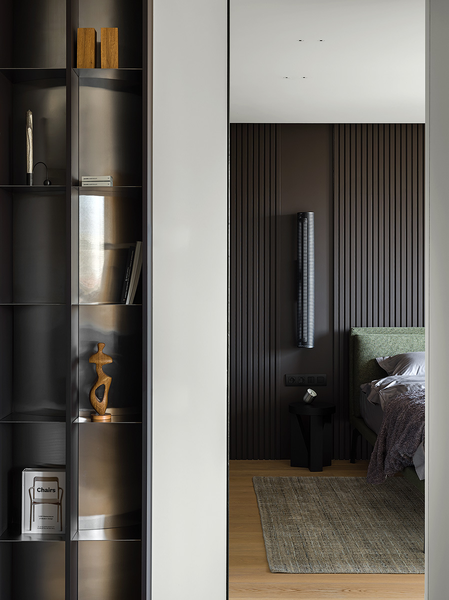 Modern apartment for a man of 69 sq.m. An interesting detail is the custom stainless steel shelves, which are located in the center of the apartment and separate the entrance, corridor and bathroom from the living room bedroom.