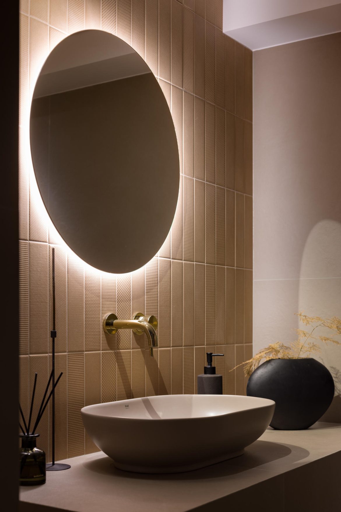 For this reason, we chose porcelain stoneware as the second primary material for furniture facades and countertops. To balance its solid presence, we incorporated warm brass in areas free from moisture and heavy use.