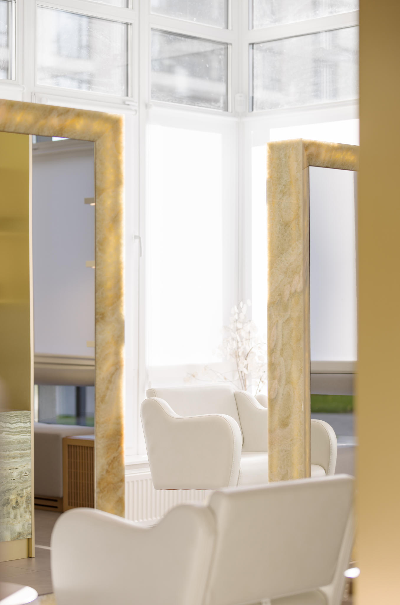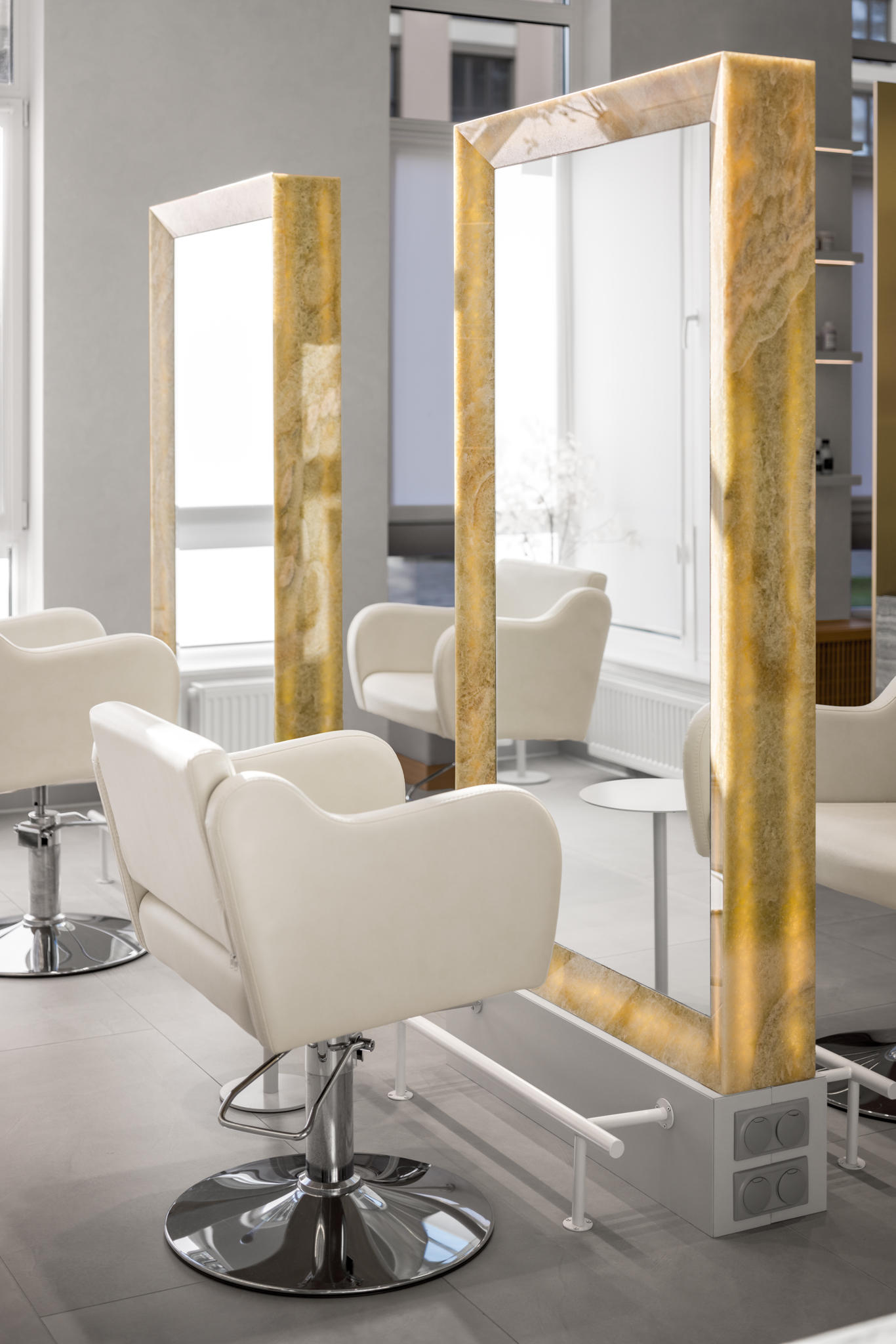 To maintain focus on the onyx without overwhelming the interior, we chose a light gray shade for the walls and floors, featuring a soft matte texture. We also designed and custom-made wooden shelving with rhythmic facades based on our sketches.