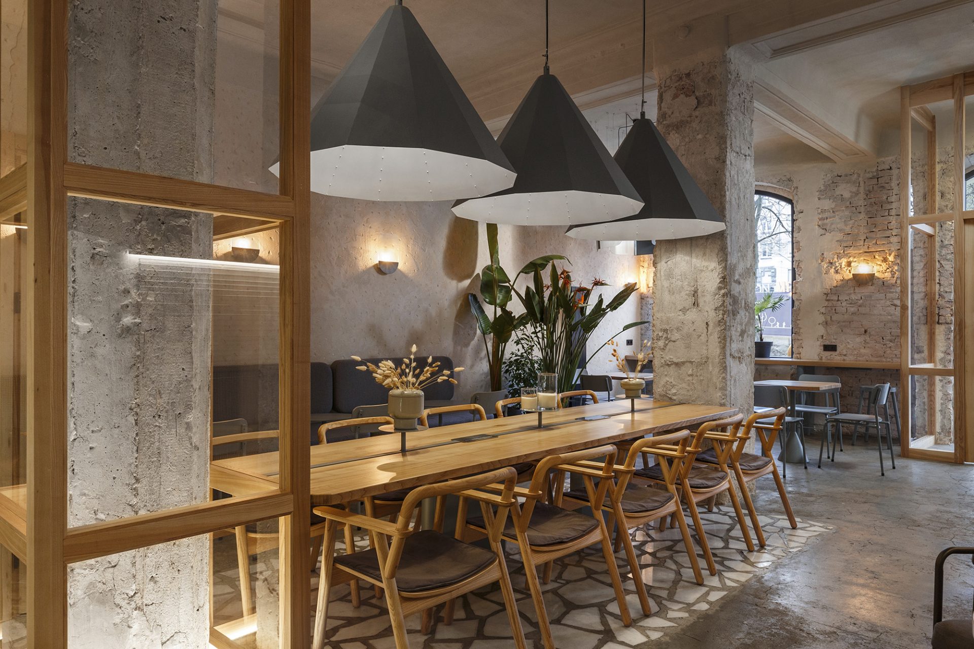 Previously, the room was a children’s center and finishing all the walls were sheathed with plasterboard, and the ceiling by Armstrong system. After dismantling, a beam with stucco decoration was found on the ceiling. And it was decided to leave it, as well as partially save Ekaterinoslav brick on the walls (with tinted). Brick is very organically combined with plaster on the walls. It was decided to make the central column in the hall an accent element, highlighting and taking in a glass box. The floor covering is a combination of concrete and crushed marble. Marble highlights the main functional areas of the Coffee House.