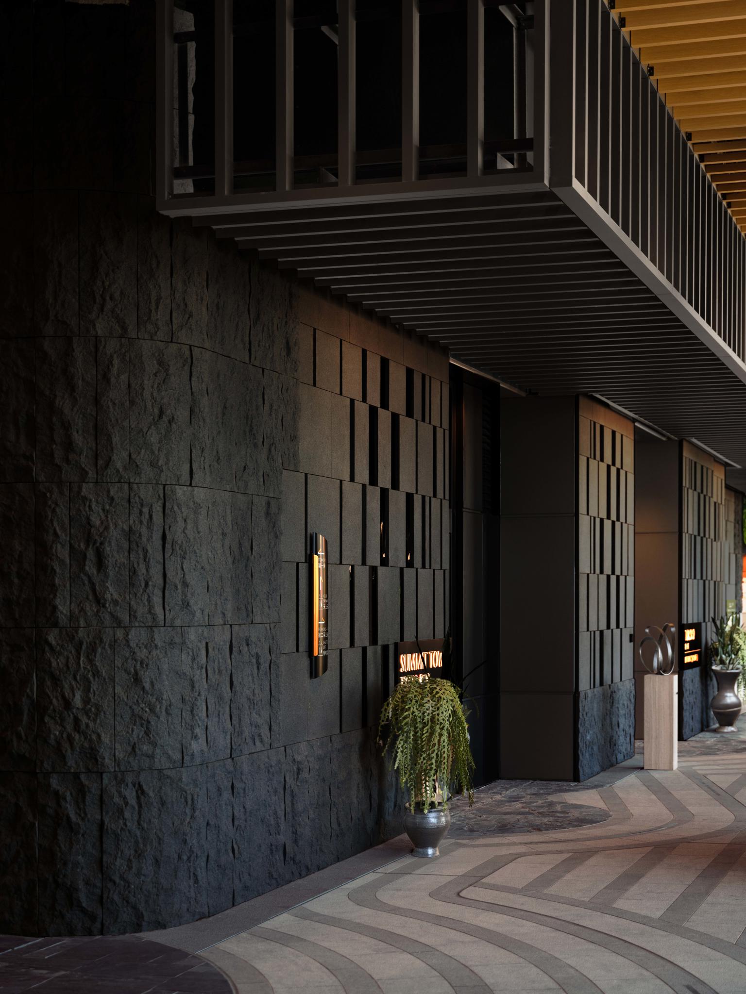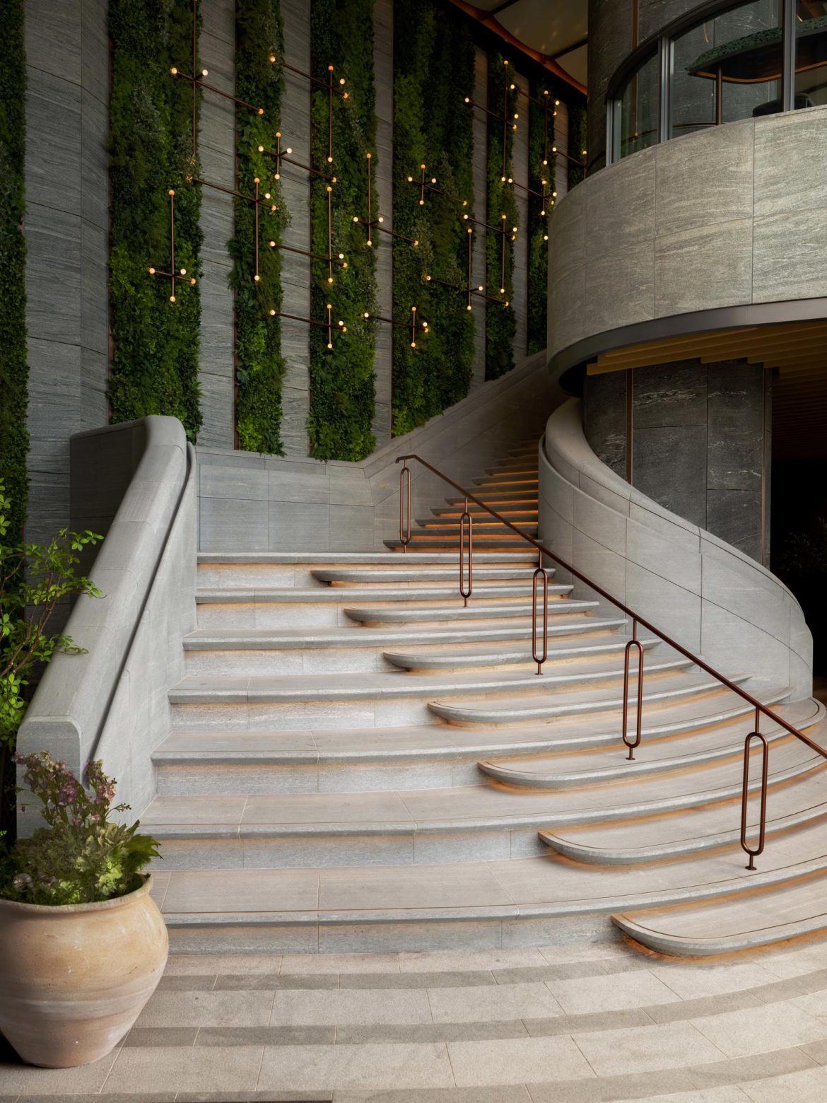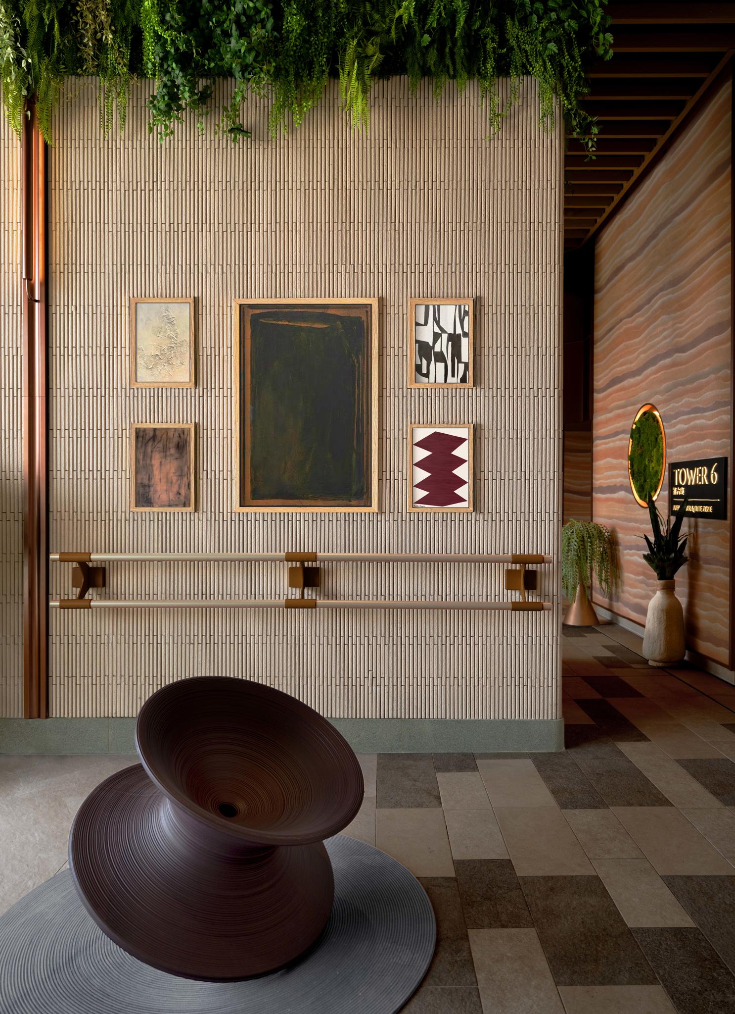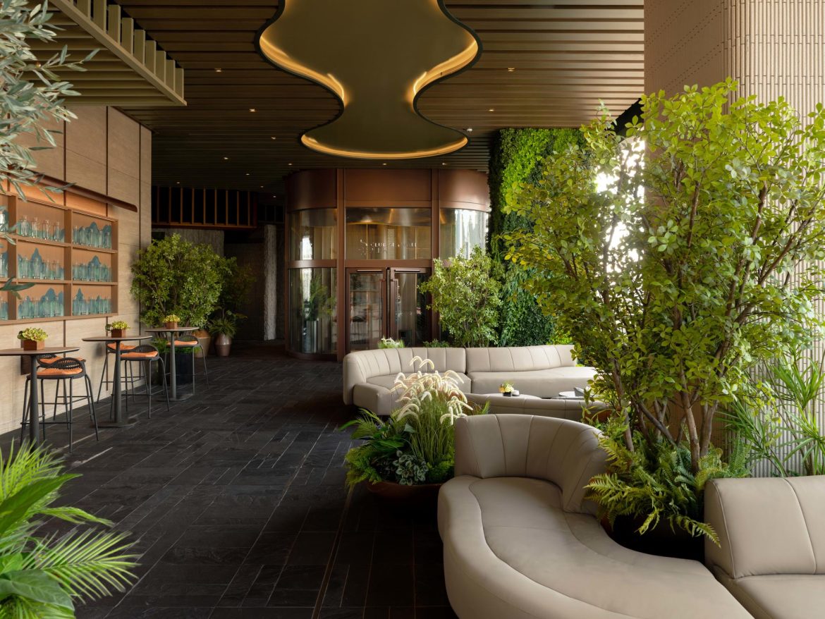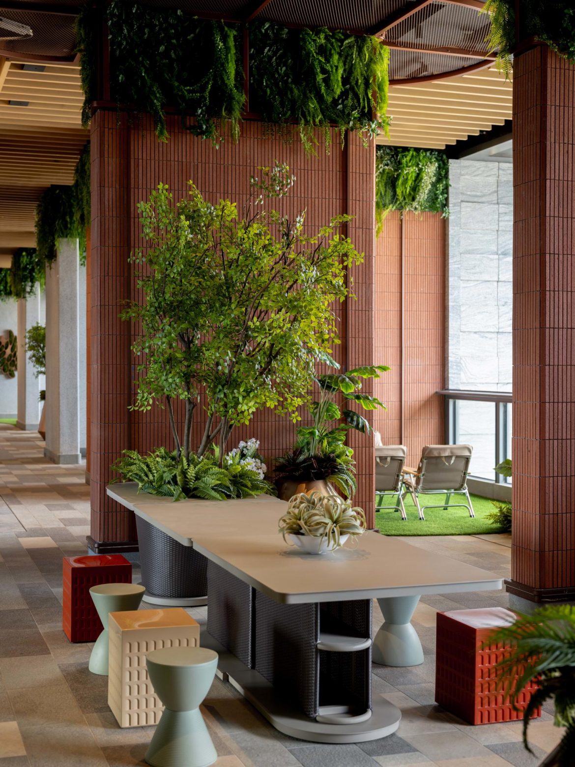 Conversely, the 31st floor adopts a different rhythm. Individual “room” are formed by the shear walls of apartment units. With wooden floors and rammed earth walls, the space invites a rustic warmth, while surrounding green walls and hanging decorations cultivate a tranquil atmosphere. This level features a tearoom, reading area, yoga studio, and a playground for children. These floating islands are connected by a curved central staircase and the “Landing Lounge.”