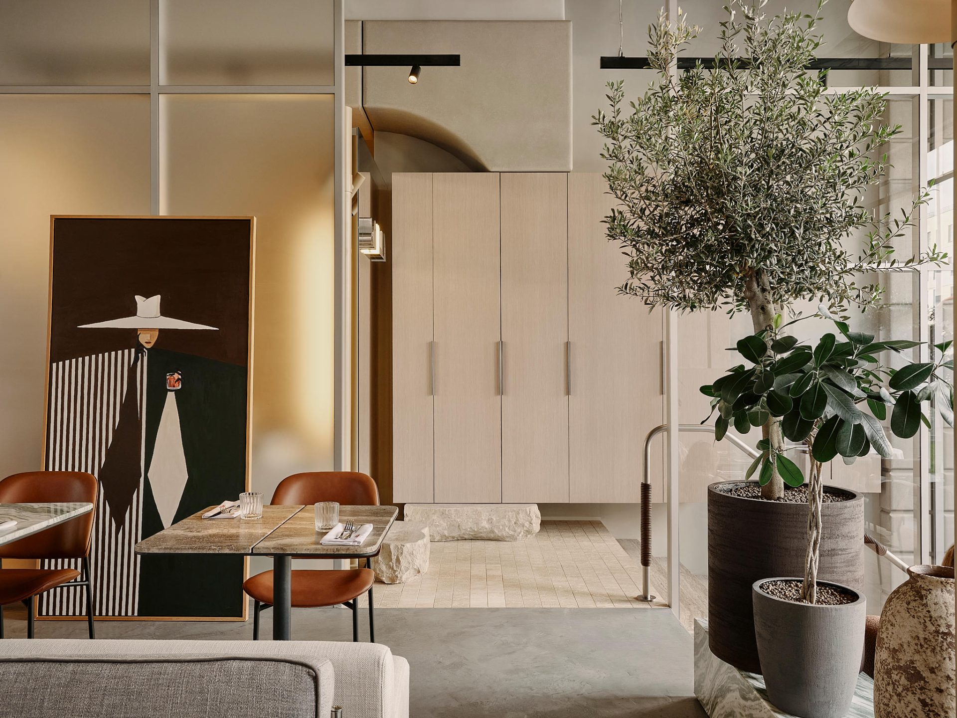 The central seating area evokes a lively city street lined with lampposts and trees. Here, symmetry is replaced by spontaneity, as if neighbours had brought out their own furniture to sit together in the shade. This effect is enhanced by the mix of facade elements along the wall: in one place, the kitchen mezzanine juts out; in another, the bar canopy or an arch takes shape. Though diverse in form and material, these elements align into a single streetscape – one that feels distinctly Milanese: elegant, yet with a dash of mischief.