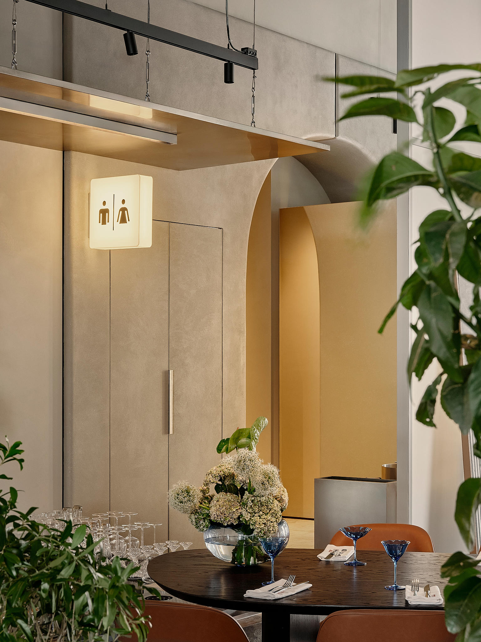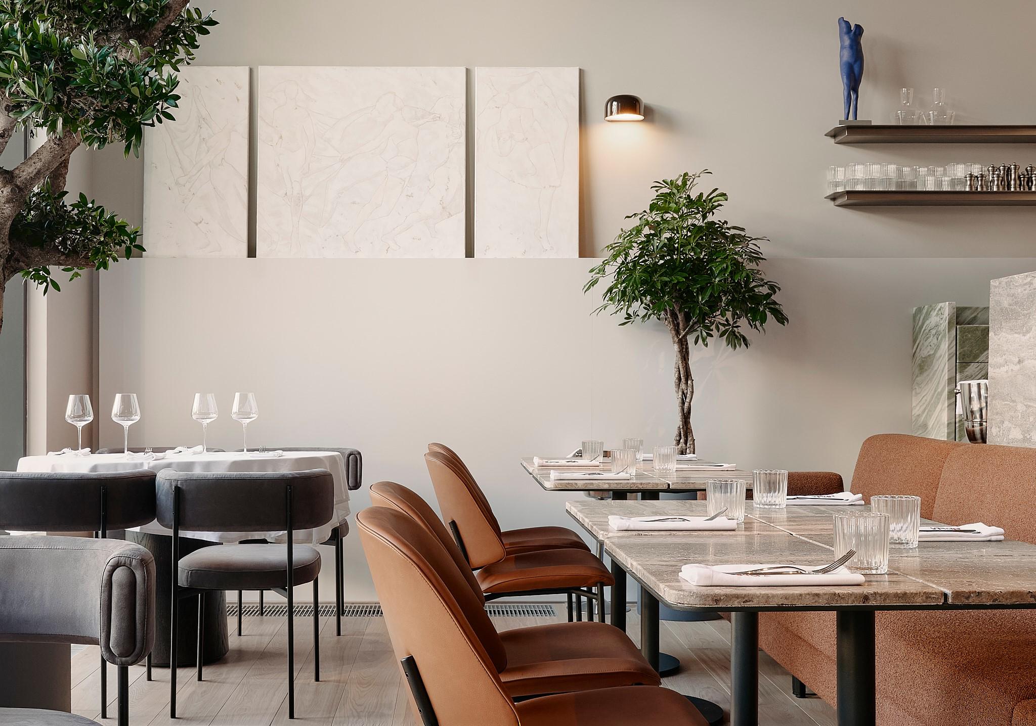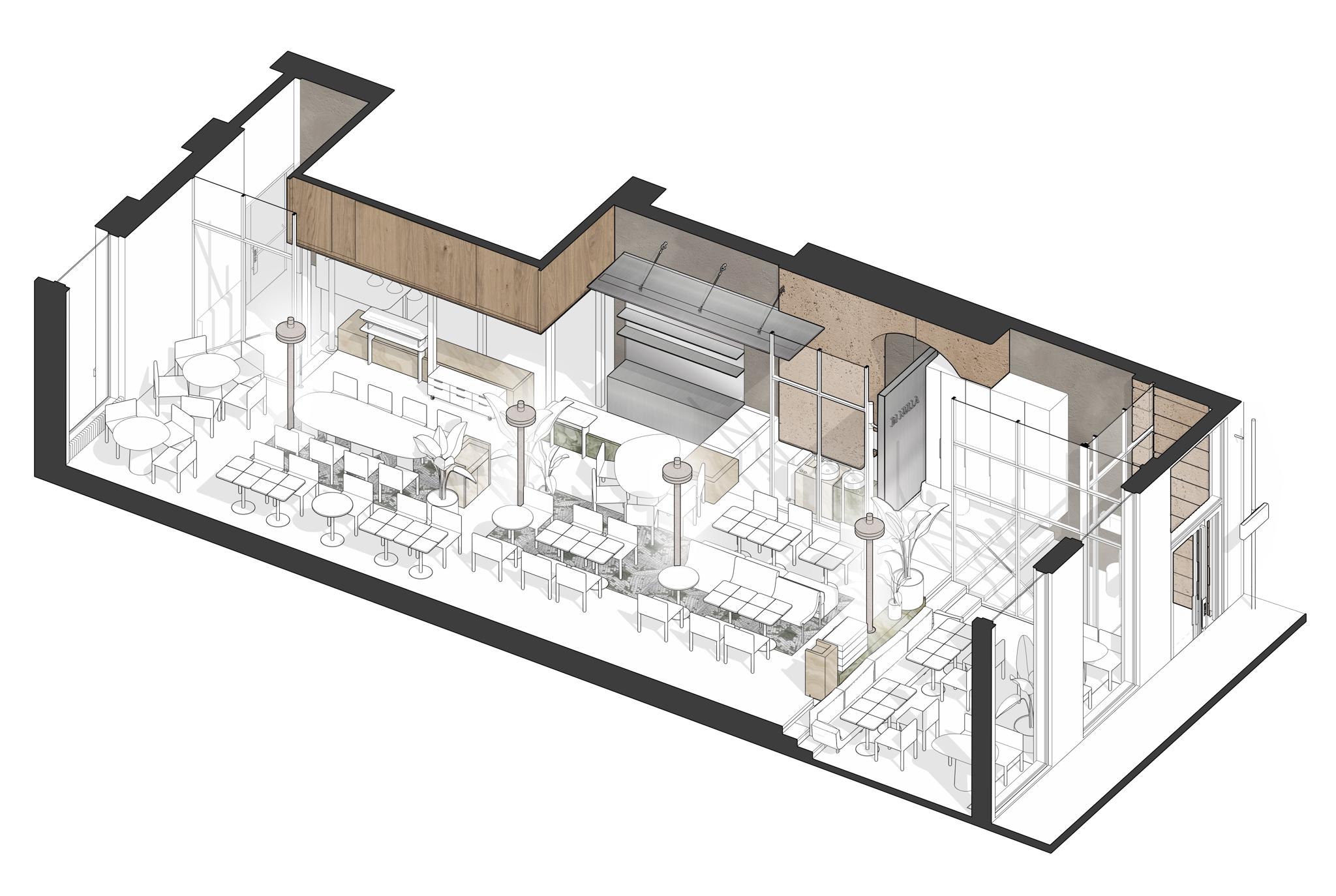 The central seating area evokes a lively city street lined with lampposts and trees. Here, symmetry is replaced by spontaneity, as if neighbours had brought out their own furniture to sit together in the shade. This effect is enhanced by the mix of facade elements along the wall: in one place, the kitchen mezzanine juts out; in another, the bar canopy or an arch takes shape. Though diverse in form and material, these elements align into a single streetscape – one that feels distinctly Milanese: elegant, yet with a dash of mischief.
