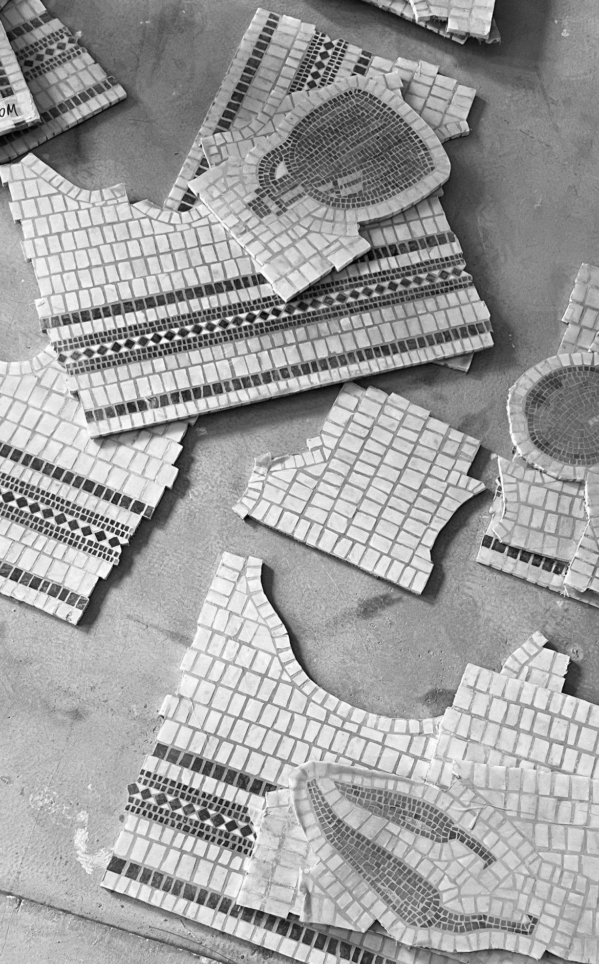 The furniture is deliberately eclectic, as if collected piece by piece from different private homes, reinforcing the feel of a lived-in street scene. The floor is laid with a custom mosaic that calls for a picnic: light, informal, and warm.