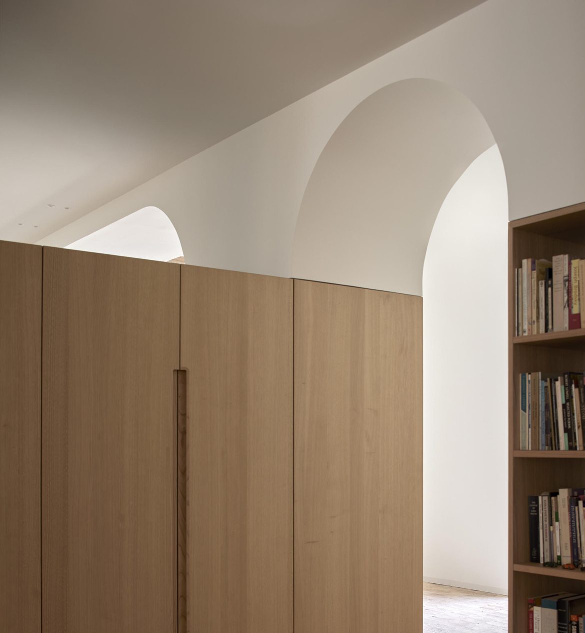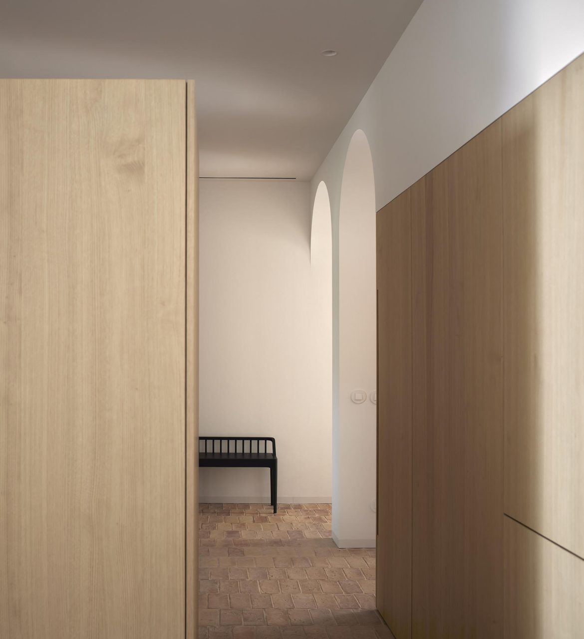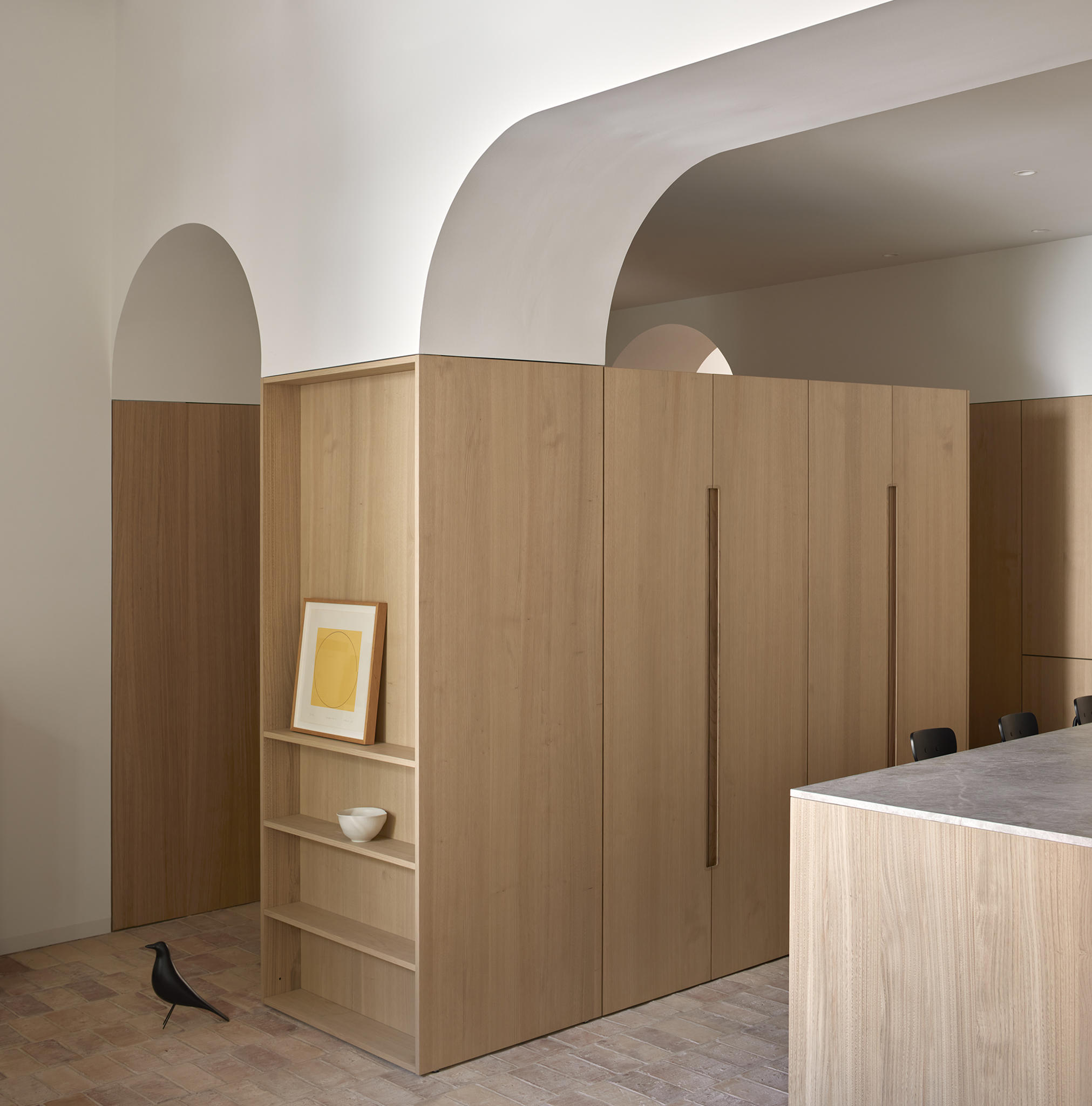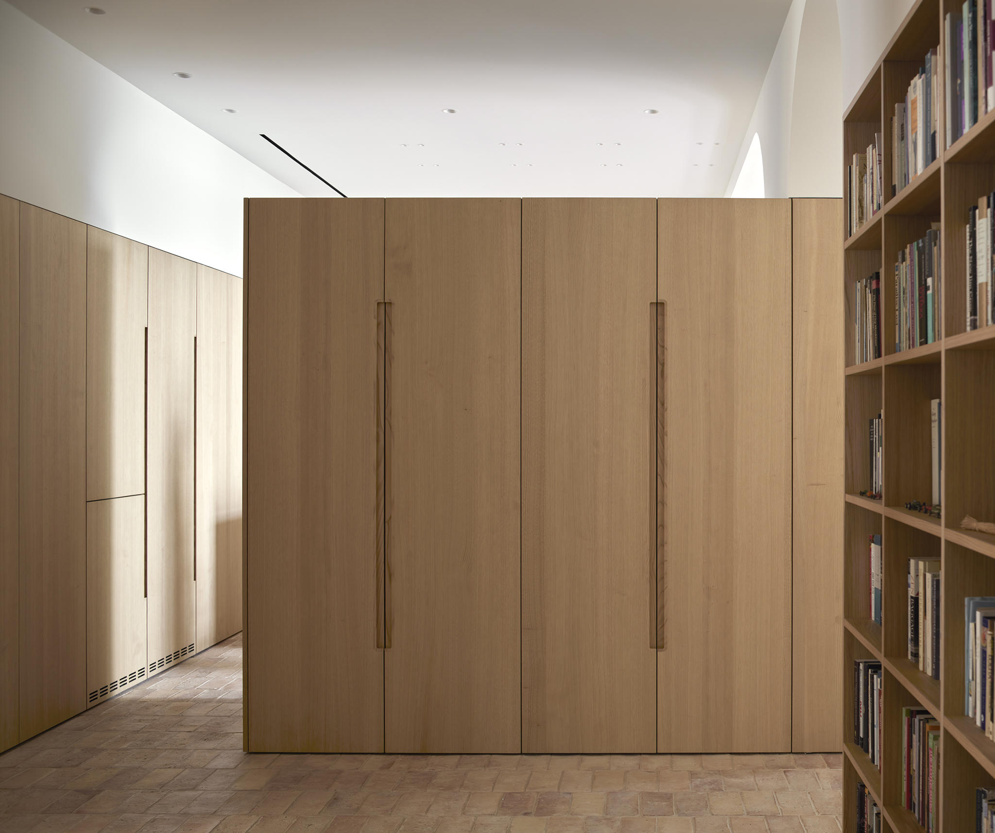 The materiality is complex and based on a complementary duality. On one side, the original construction, solid and heavy, remarks a central space like a Roman peristylum. This enclosed space is permeable to light, sight, and movement, allowing it to play with transitions across the spaces. Those preexisting elements have an abstract matte white finish for balancing the weight and making it atemporal. On the other side, the introducing elements have a more contemporary and sober approach. The floor and the custom-made cabinetry support all the functionality while keeping a warm feeling. This is achieved through a natural material palette, not only to enhance the noble character of the building but also to provide a complete haptic experience. Oak veneer on the integrated pieces of furniture, terracotta straw finish flooring, ivory tones from the quartzite that pair the wood tone with the white preexisting walls, and finally the brass accents. Altogether create a harmony of golden tones reflected in the white finish of the original construction, getting feedback one from the other and integrating the place’s history in the new narrative that will bring the new characters.