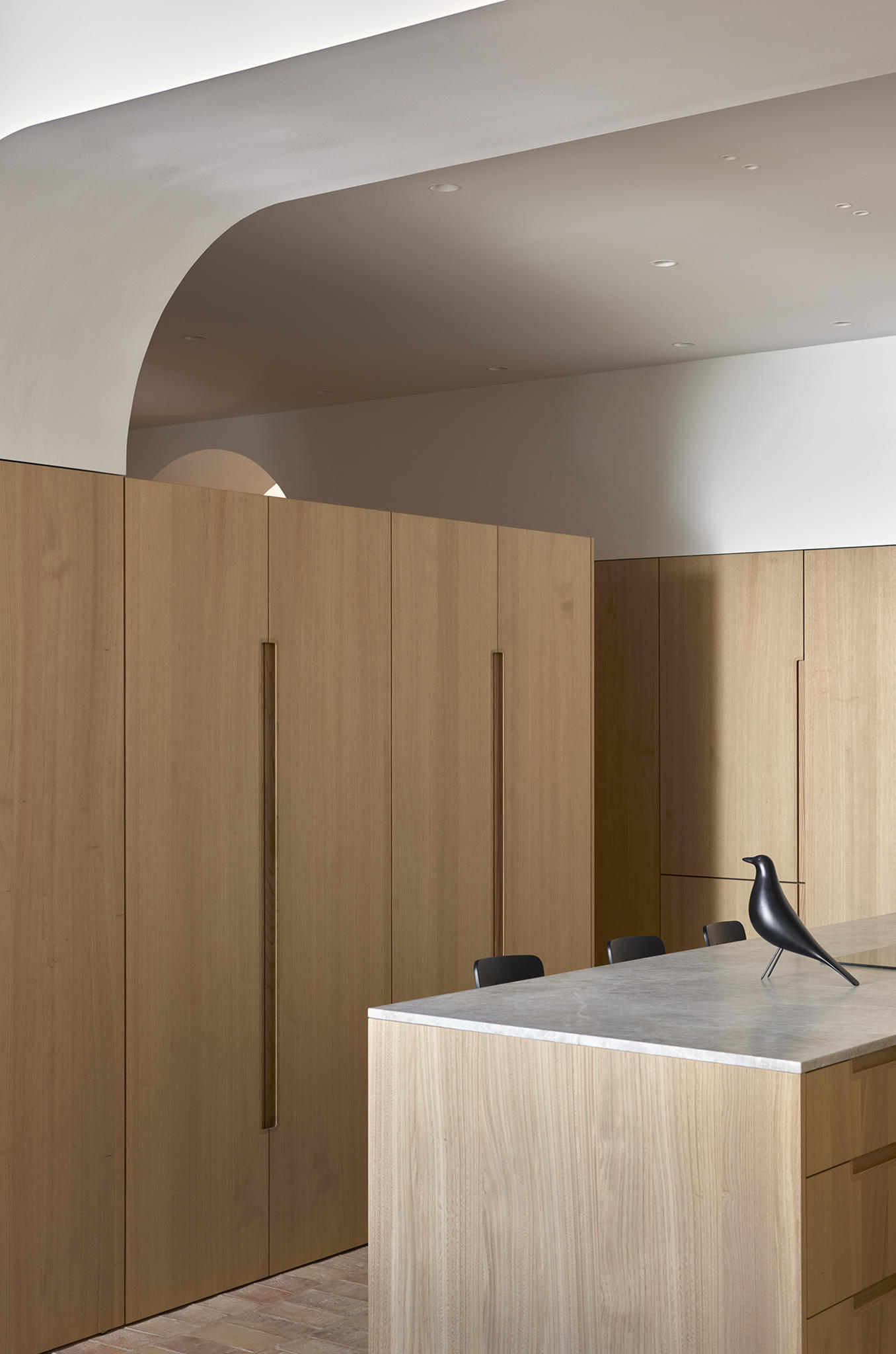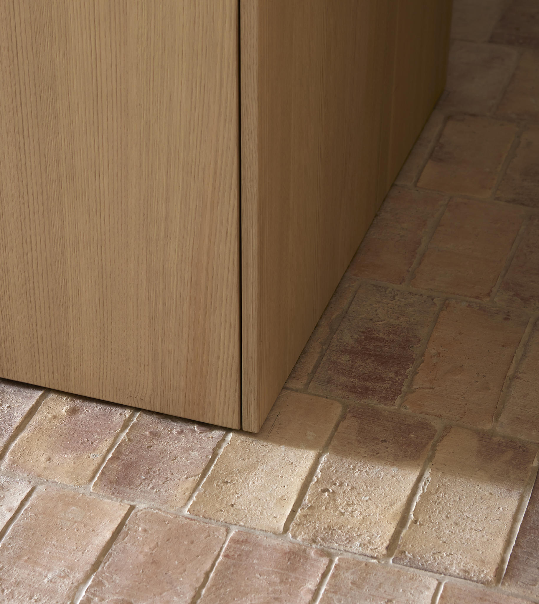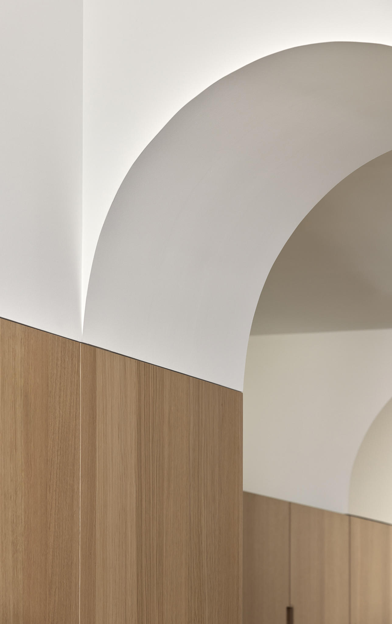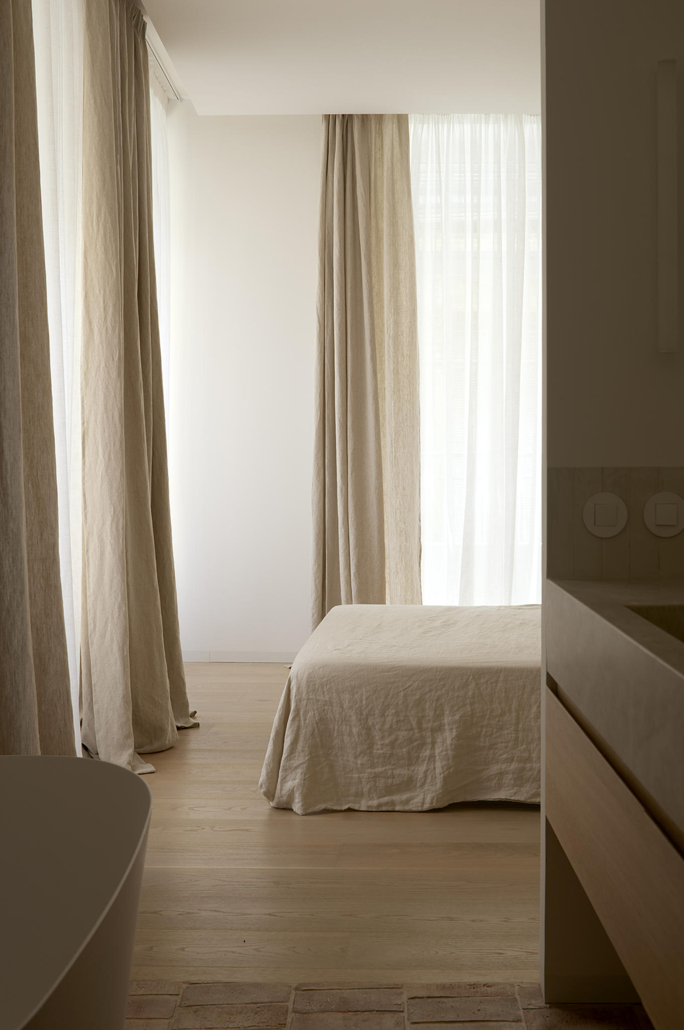 The materiality is complex and based on a complementary duality. On one side, the original construction, solid and heavy, remarks a central space like a Roman peristylum. This enclosed space is permeable to light, sight, and movement, allowing it to play with transitions across the spaces. Those preexisting elements have an abstract matte white finish for balancing the weight and making it atemporal. On the other side, the introducing elements have a more contemporary and sober approach. The floor and the custom-made cabinetry support all the functionality while keeping a warm feeling. This is achieved through a natural material palette, not only to enhance the noble character of the building but also to provide a complete haptic experience. Oak veneer on the integrated pieces of furniture, terracotta straw finish flooring, ivory tones from the quartzite that pair the wood tone with the white preexisting walls, and finally the brass accents. Altogether create a harmony of golden tones reflected in the white finish of the original construction, getting feedback one from the other and integrating the place’s history in the new narrative that will bring the new characters.