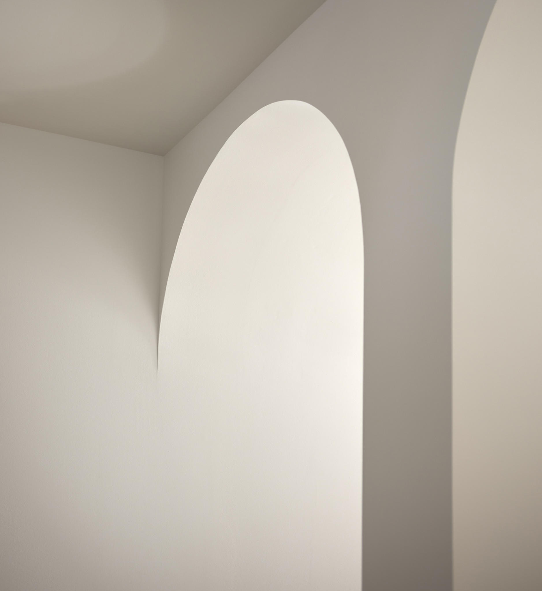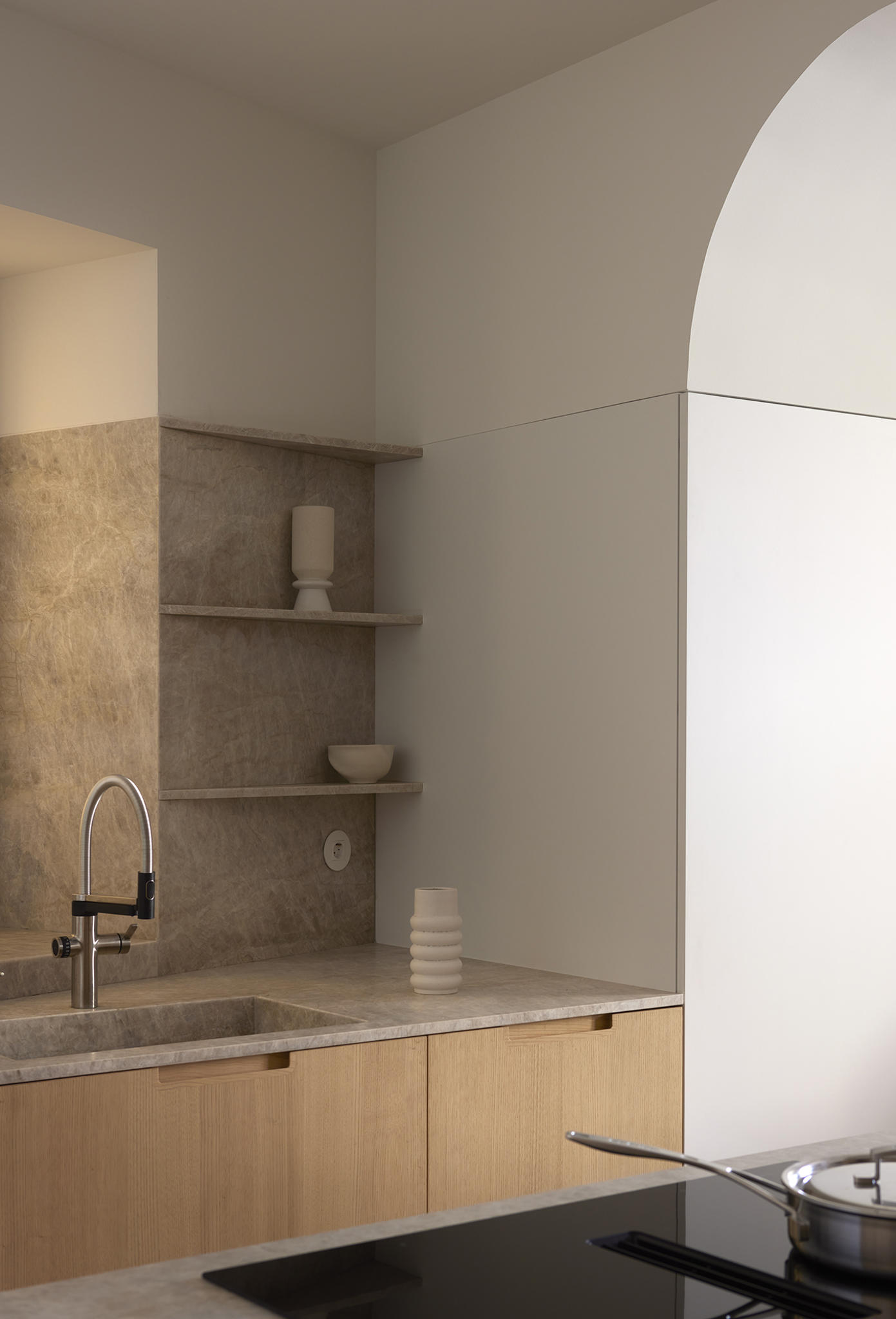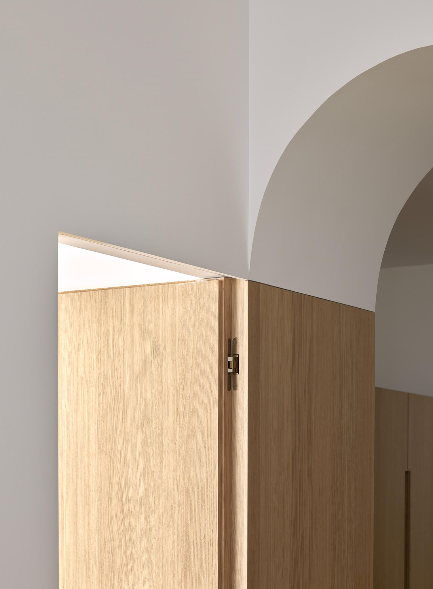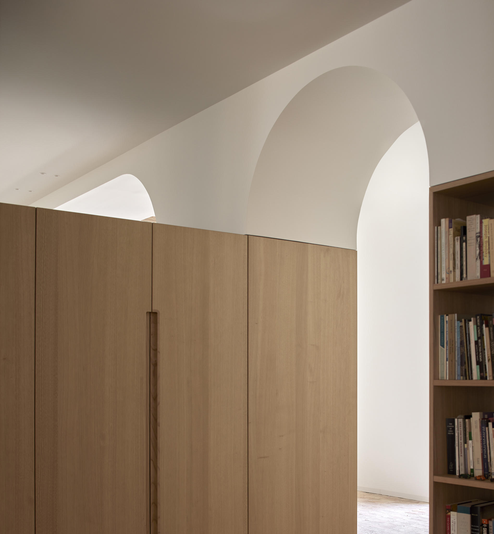 The materiality is complex and based on a complementary duality. On one side, the original construction, solid and heavy, remarks a central space like a Roman peristylum. This enclosed space is permeable to light, sight, and movement, allowing it to play with transitions across the spaces. Those preexisting elements have an abstract matte white finish for balancing the weight and making it atemporal. On the other side, the introducing elements have a more contemporary and sober approach. The floor and the custom-made cabinetry support all the functionality while keeping a warm feeling. This is achieved through a natural material palette, not only to enhance the noble character of the building but also to provide a complete haptic experience. Oak veneer on the integrated pieces of furniture, terracotta straw finish flooring, ivory tones from the quartzite that pair the wood tone with the white preexisting walls, and finally the brass accents. Altogether create a harmony of golden tones reflected in the white finish of the original construction, getting feedback one from the other and integrating the place’s history in the new narrative that will bring the new characters.