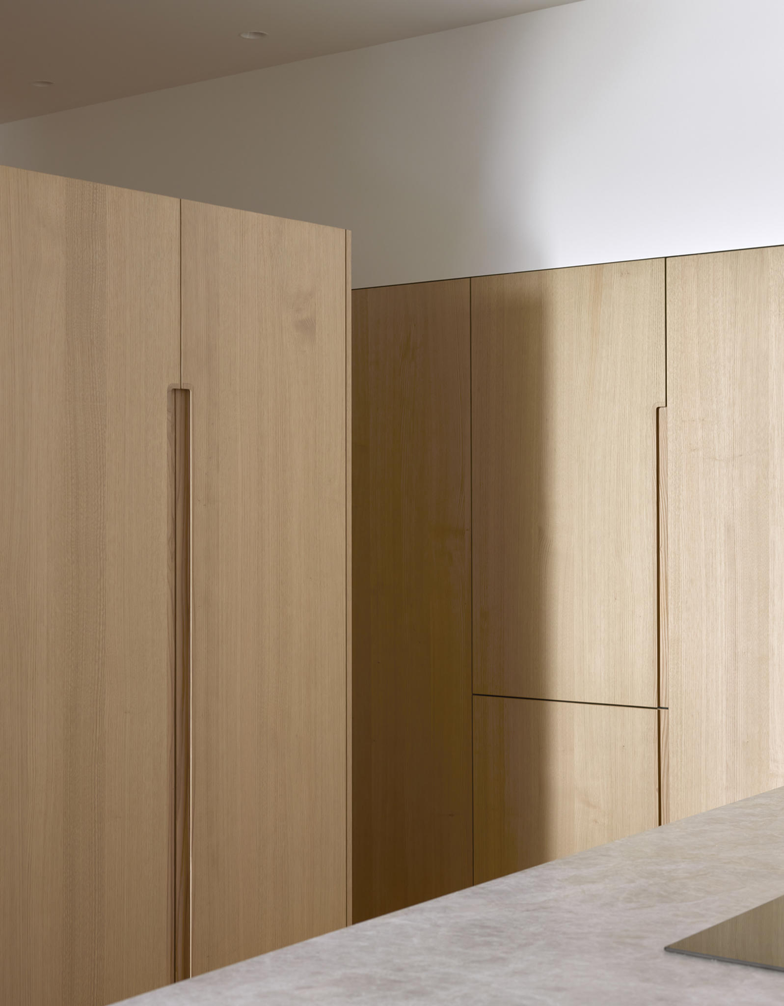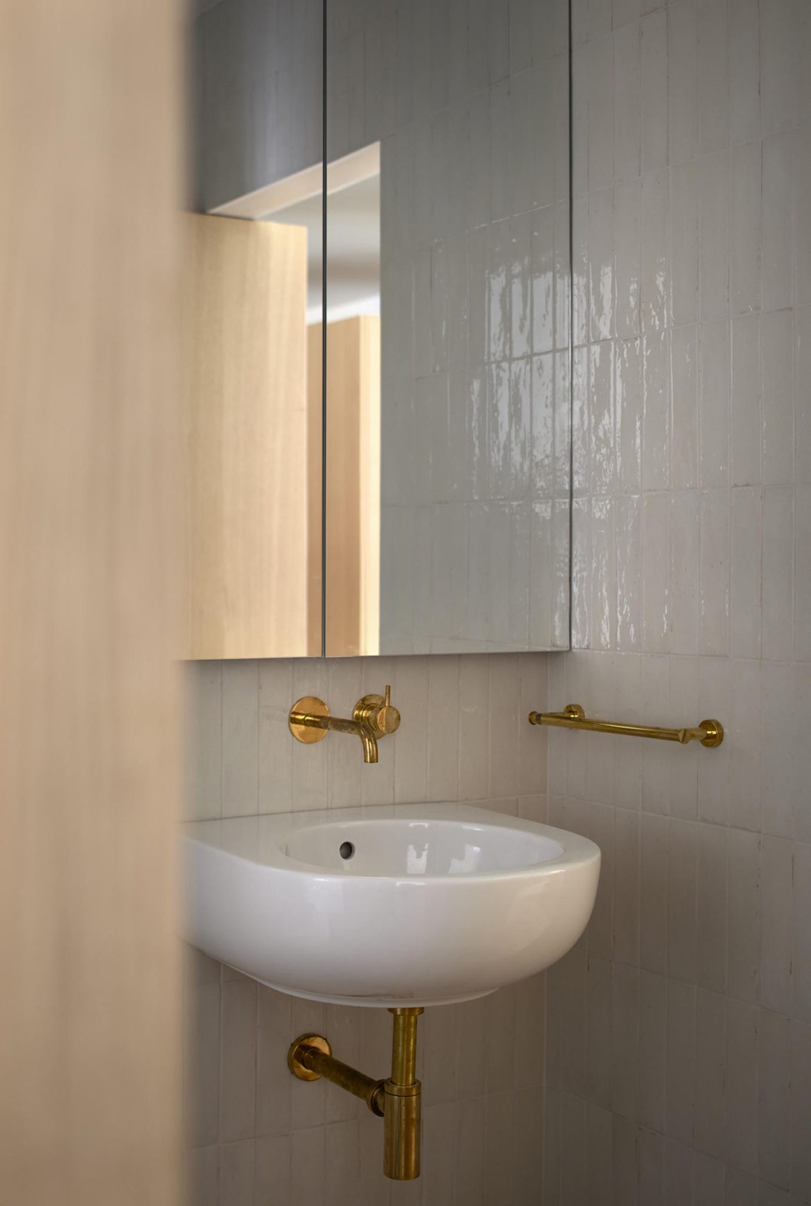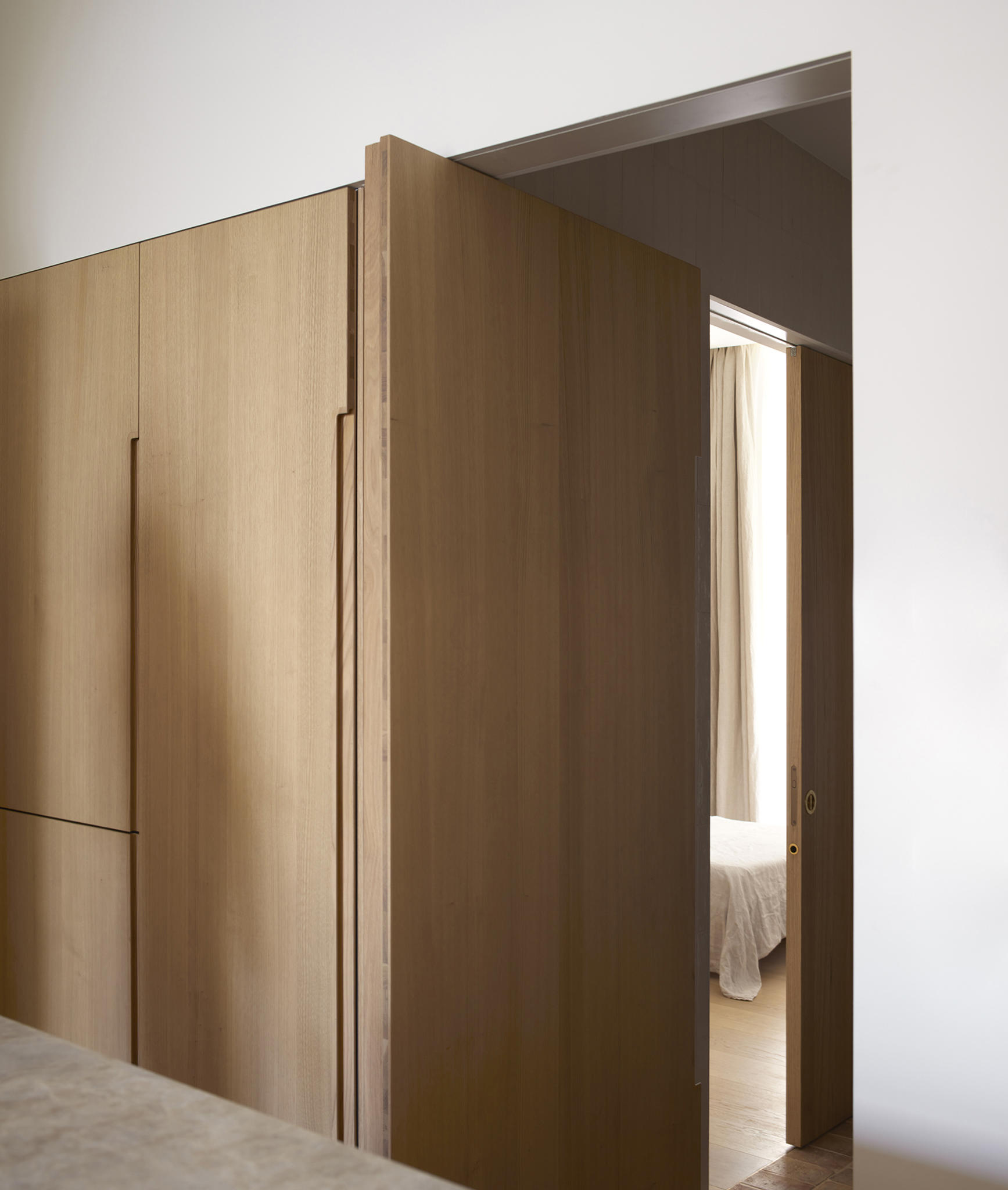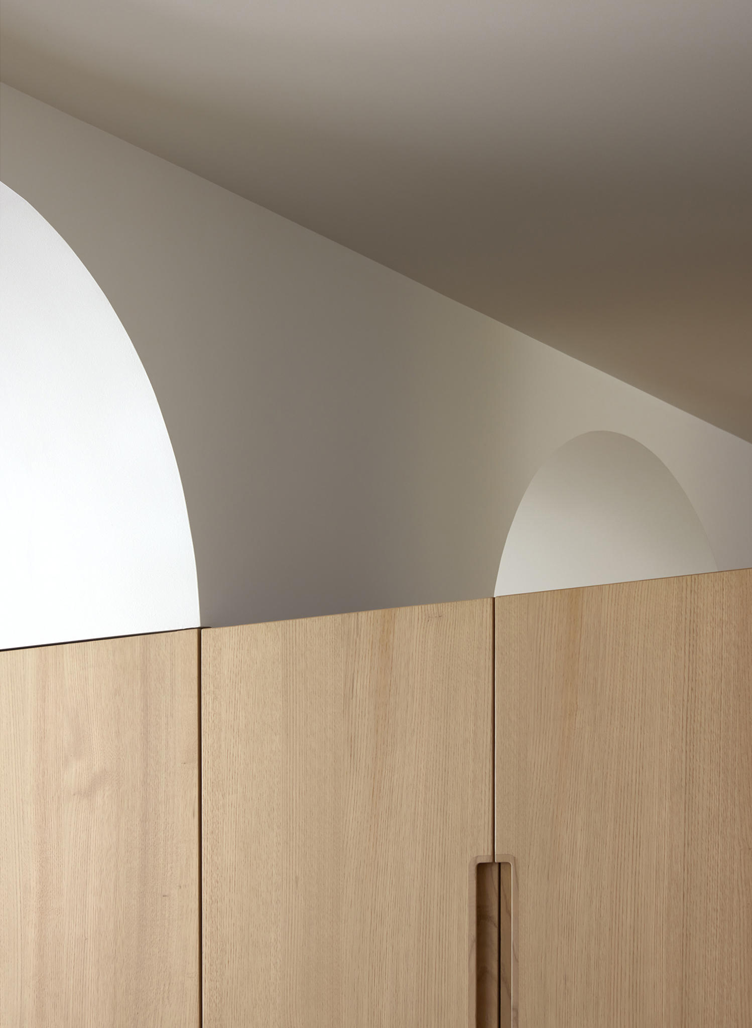 The materiality is complex and based on a complementary duality. On one side, the original construction, solid and heavy, remarks a central space like a Roman peristylum. This enclosed space is permeable to light, sight, and movement, allowing it to play with transitions across the spaces. Those preexisting elements have an abstract matte white finish for balancing the weight and making it atemporal. On the other side, the introducing elements have a more contemporary and sober approach. The floor and the custom-made cabinetry support all the functionality while keeping a warm feeling. This is achieved through a natural material palette, not only to enhance the noble character of the building but also to provide a complete haptic experience. Oak veneer on the integrated pieces of furniture, terracotta straw finish flooring, ivory tones from the quartzite that pair the wood tone with the white preexisting walls, and finally the brass accents. Altogether create a harmony of golden tones reflected in the white finish of the original construction, getting feedback one from the other and integrating the place’s history in the new narrative that will bring the new characters.