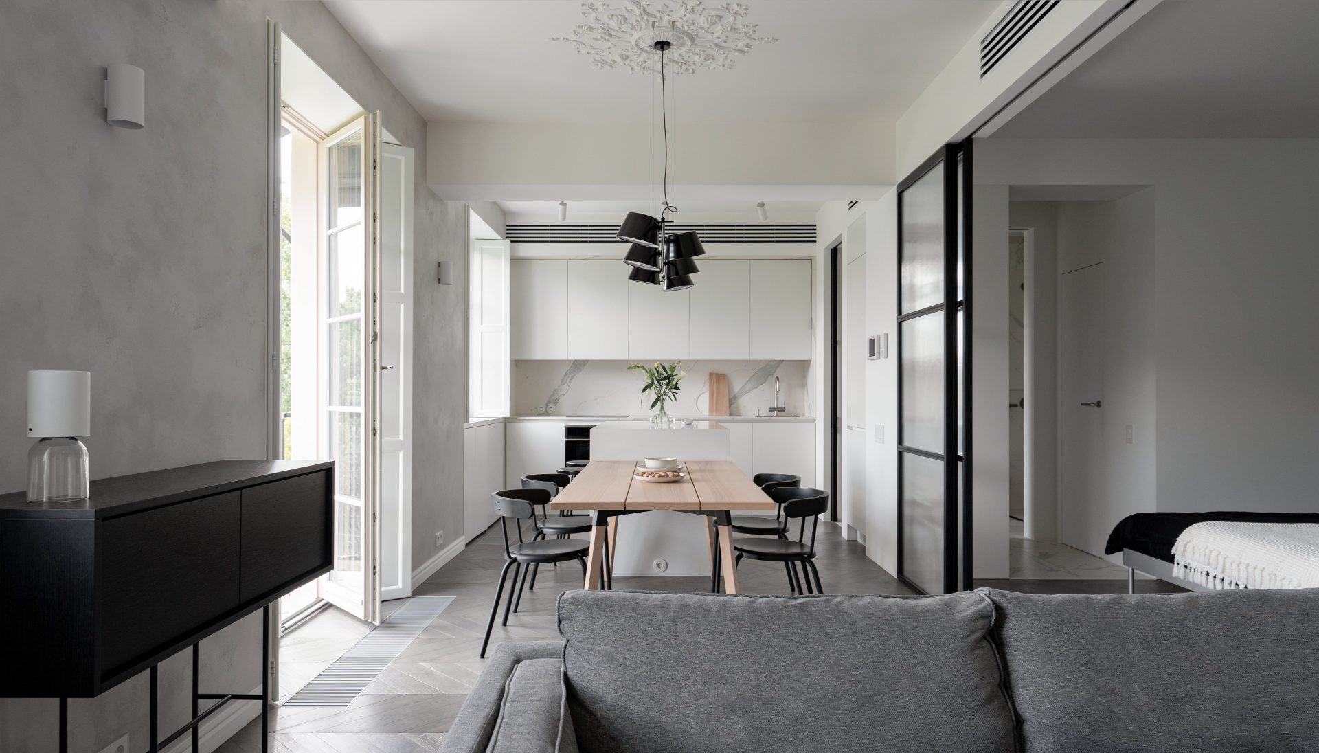 The basis of the planning decisions was the idea of open space, we made the entire space of the apartment as a whole, with a conventional division into zones. In this case, we left the possibility of making the rooms private, using sliding partitions which can separate the bedroom and bathroom areas. However, when the partitions are open, the apartment becomes one big space that is visible through several visual axes. The mood of this interior is set not by the colors, as the interior is almost monochrome, but by the details, which have references to the cozy small apartments in the center of Paris. Shutters, open balcony with awning, stucco, furniture on neat thin legs, parquet with “French herringbone” – all these details soften the rather minimalistic design and form the character of the apartment.
