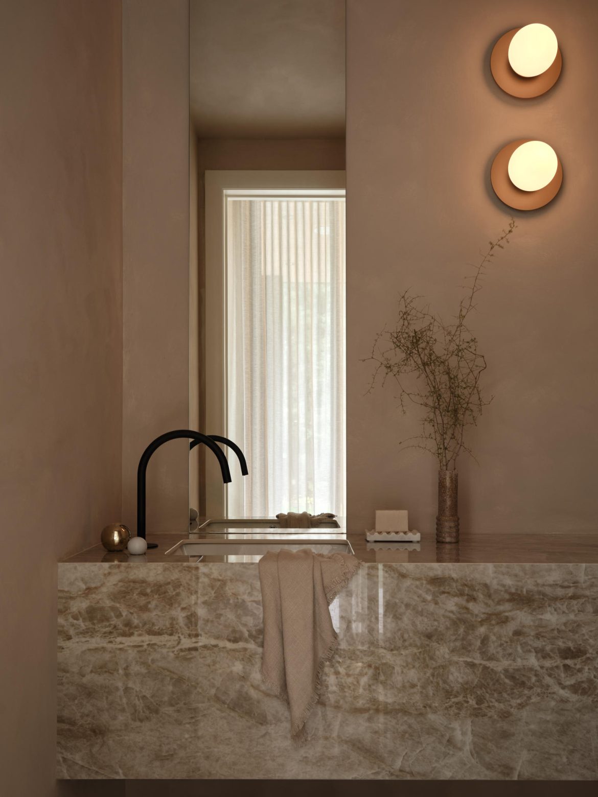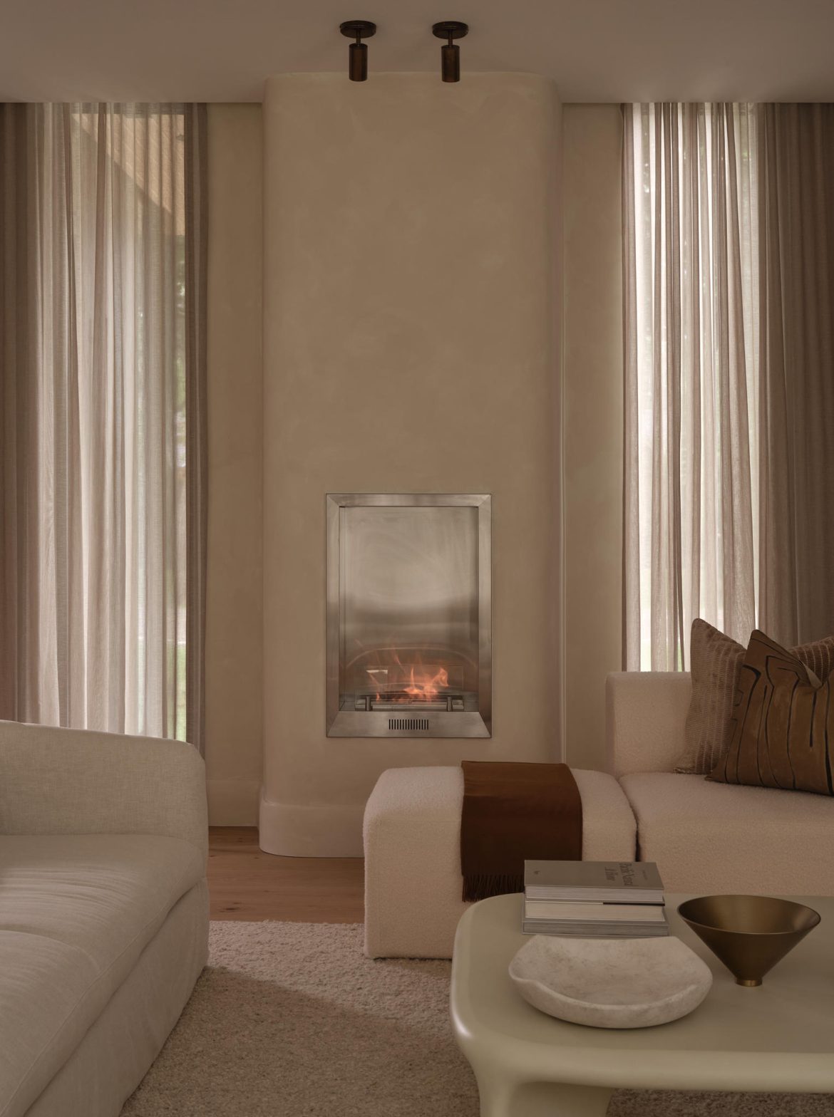 The project features seamless millwork integration and a consistent use of natural textures. Warm wood tones, Arabescato marble, and natural textures are layered with linen, sheers, and soft curvature to create an enveloping, tactile atmosphere. Curved elements—seen in the custom hood fan, the stair-integrated media unit, and the gentle arc of the fireplace wall—bring a sense of movement and softness to the home’s linear foundation.