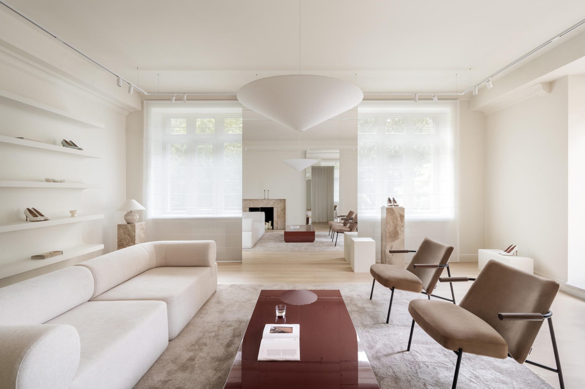 Material choices balance tactility and elegance: matte wood and textiles bring warmth, while polished marble and the glossy statement coffee table inject sophistication and dynamism. The latter, produced after several rounds of lacquering and sanding to achieve a flawless finish, became so central that its deep hue was later adopted into the brand’s visual identity.