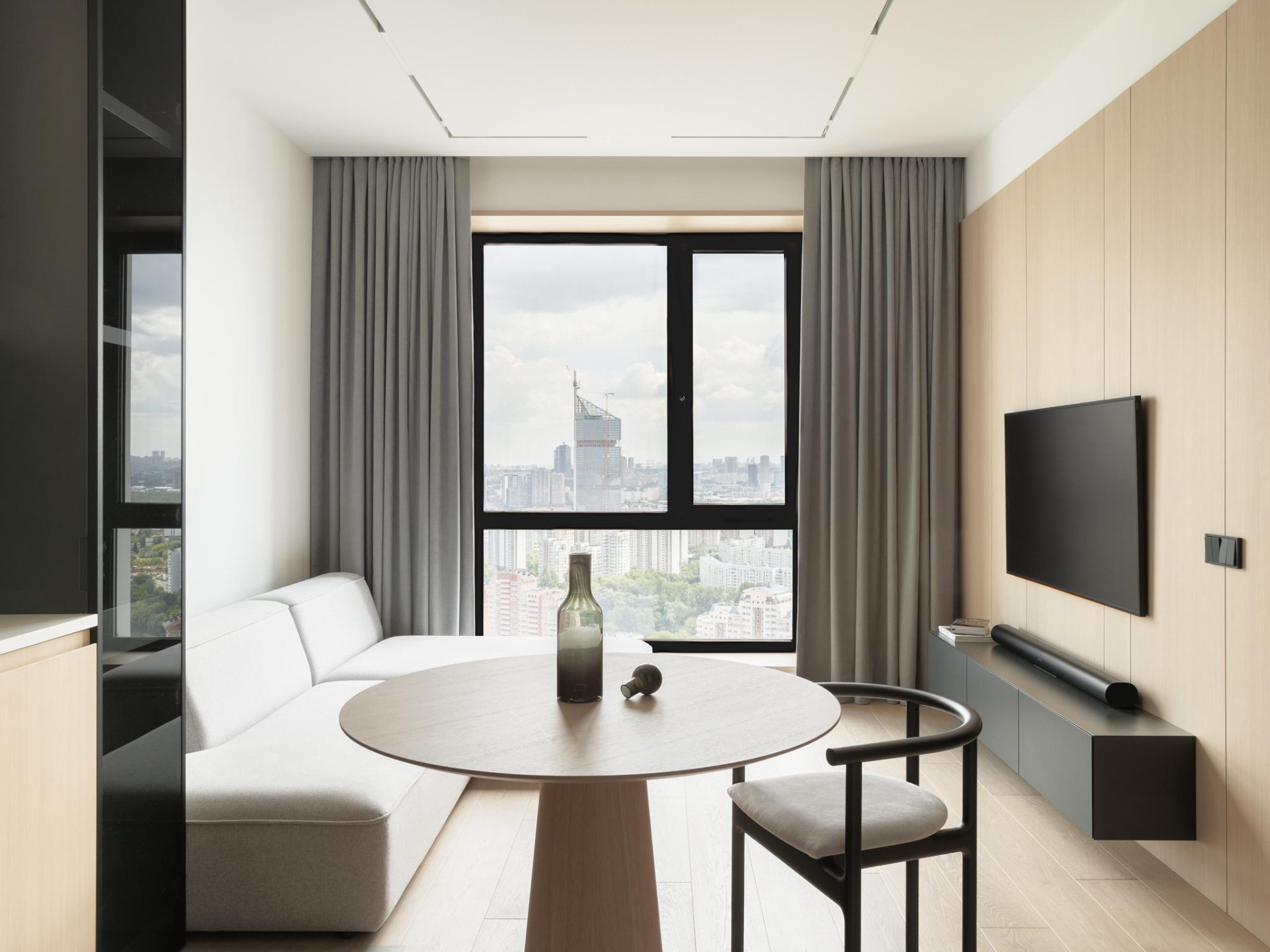 The window side jambs, faced with veneered MDF panels, have become the distinctive feature of this apartment. They serve to draw extra attention to the beautiful sights of Moscow.