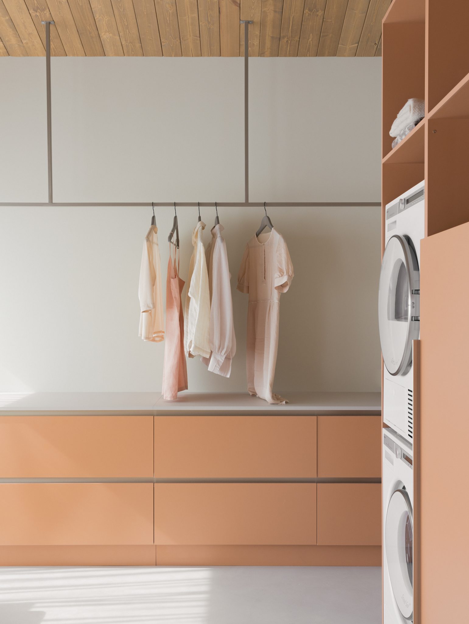 The interior palette remains soft and organic, intentionally understated to keep the focus on the panoramic forest views. Bold touches—such as an orange Antonio Lupi sink and vibrant laundry room cabinetry—inject character and liveliness. Vintage lighting fixtures, ceramics by Ekaterina Popova, and artworks by contemporary artists—including a linocut by V. Nasedkin and a painting by E. Bortnikov—are thoughtfully integrated into the space with quiet intention.