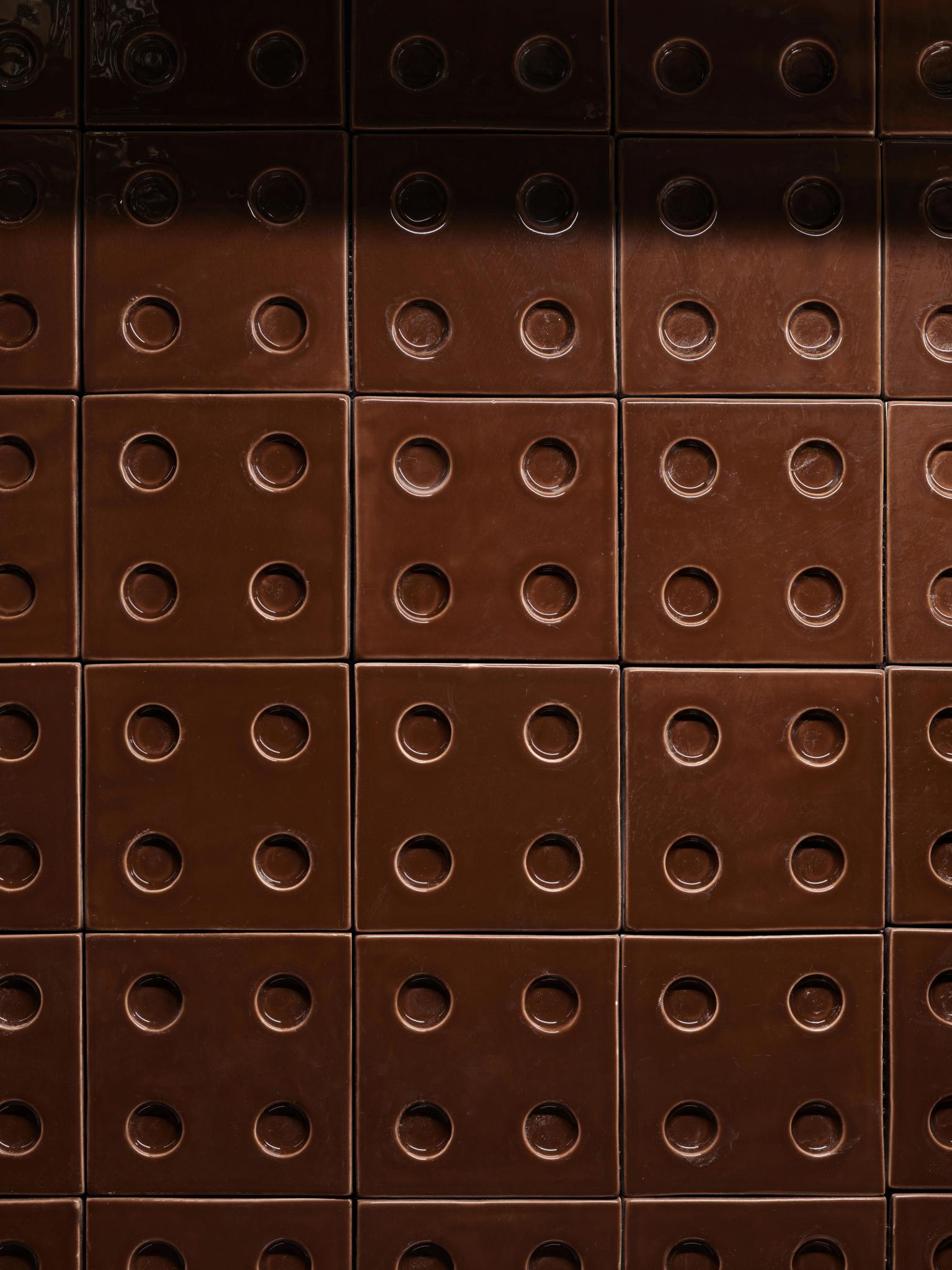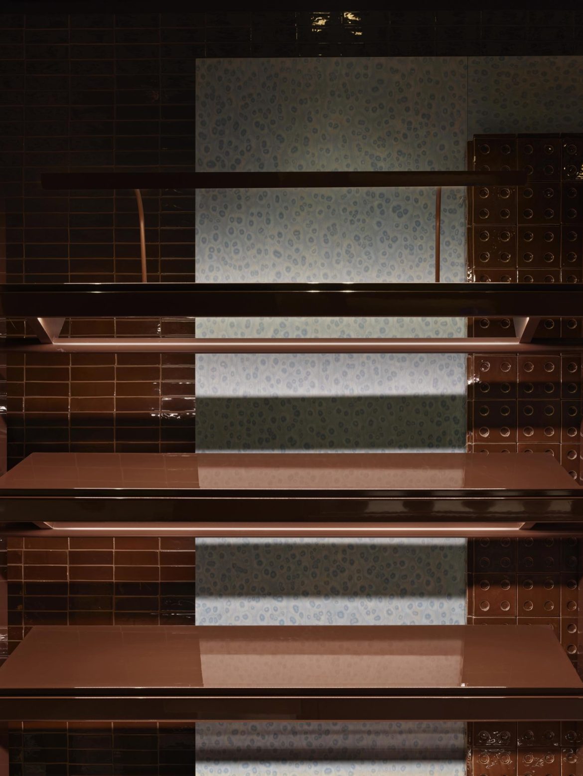 Material selection is deliberate and controlled. High-gloss, deep-toned ceramic tiles wrap the perimeter, producing a reflective, almost lacquered envelope that enhances depth and amplifies light. This darker shell is contrasted with mineral-textured surfaces and pale, patterned stone bases that ground the central island. The island itself is conceived as a monolithic volume—precise, edged, and elevated—functioning simultaneously as display, service counter, and spatial anchor.