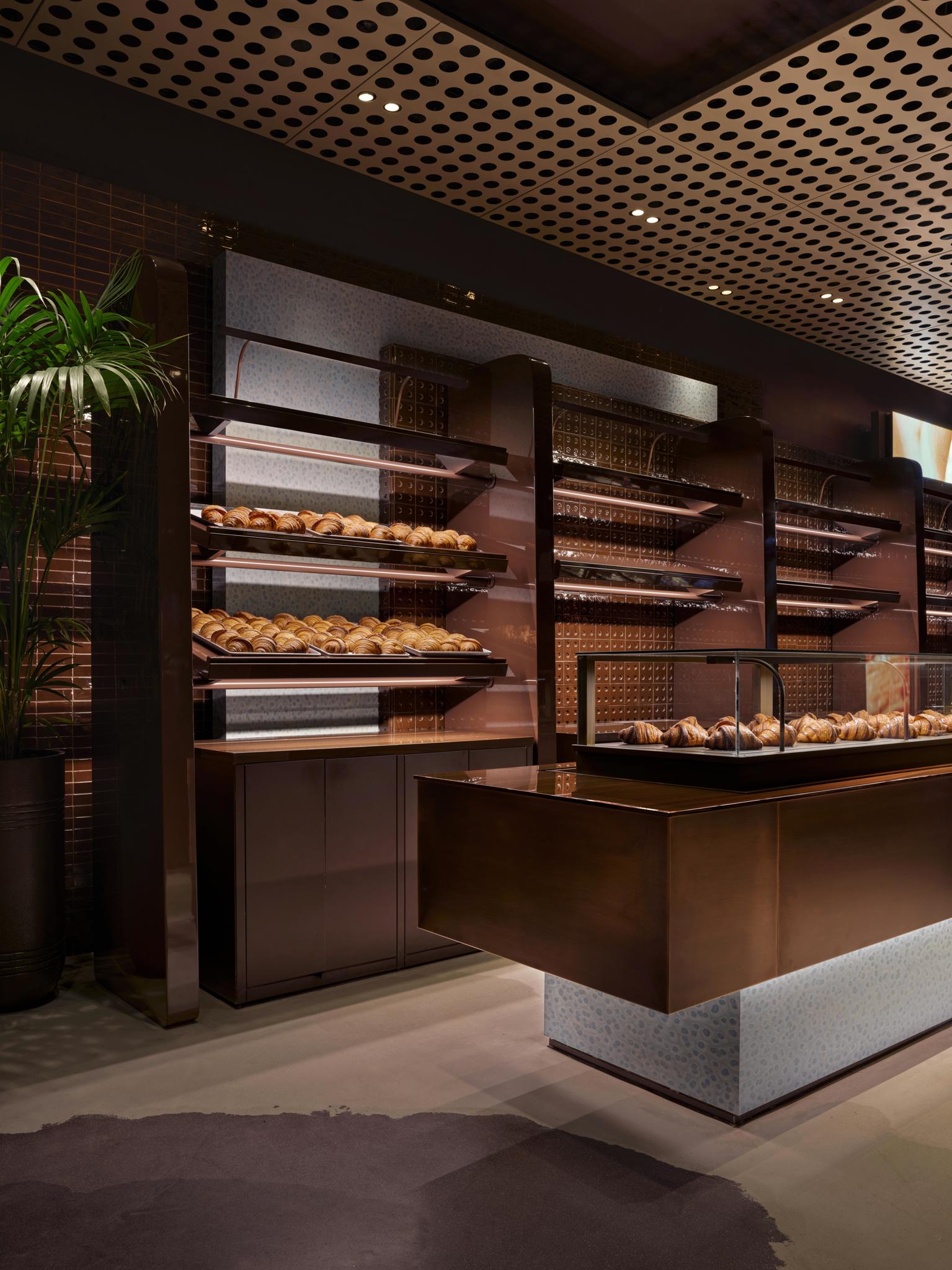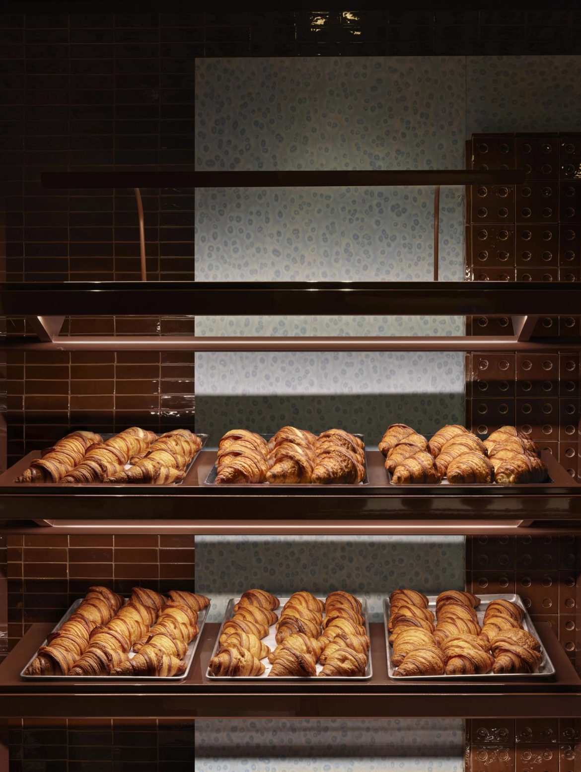 The interior is organized along a strong longitudinal axis. Custom-designed shelving units form a continuous wall datum, integrating storage, display, and lighting within a single architectural element. These vertical frames operate as rhythmic structural bays, establishing order while allowing flexibility in product presentation. The shelving planes, illuminated from beneath, emphasize horizontality and create a stratified visual field that directly references the layered structure of laminated dough.