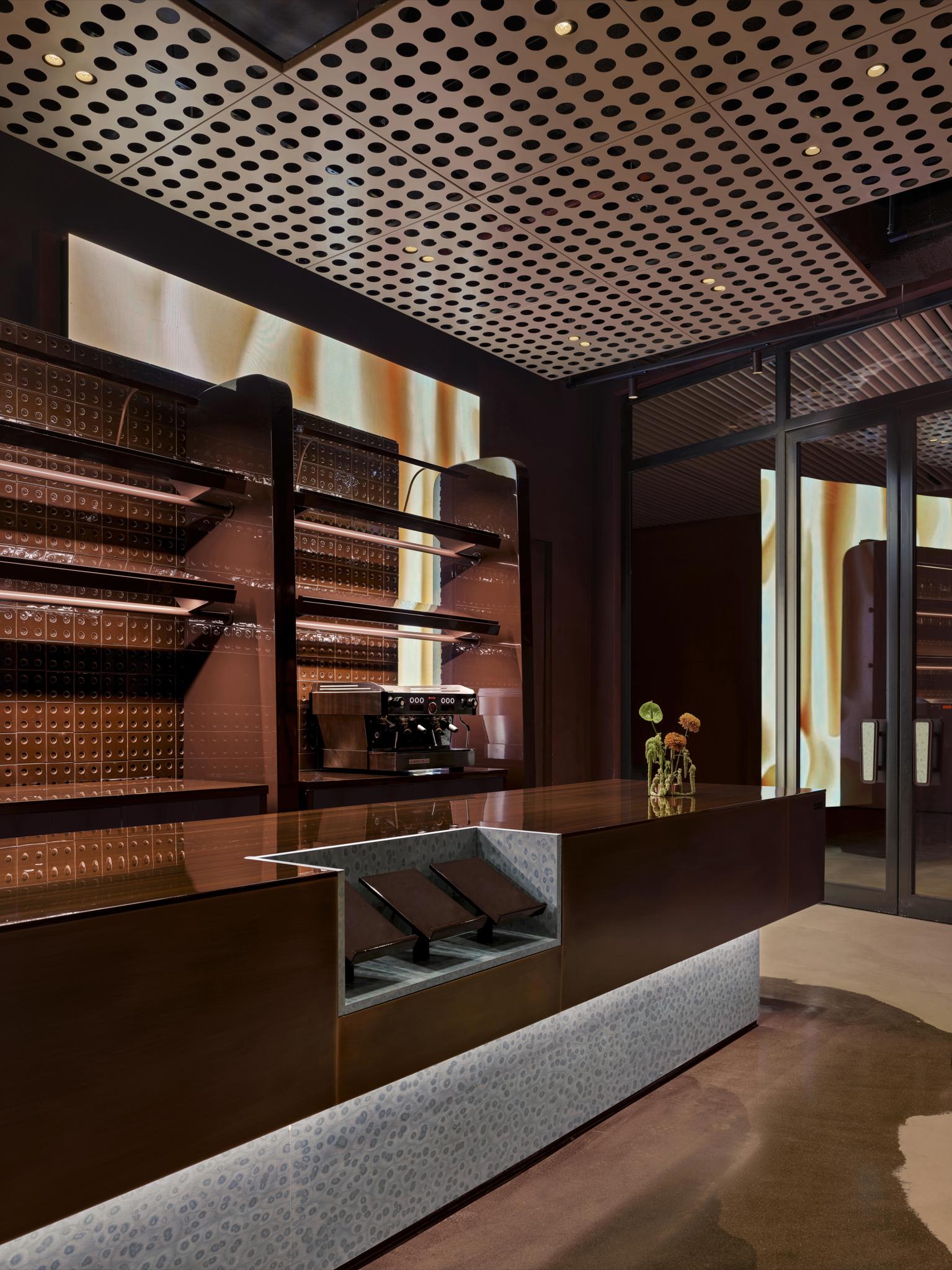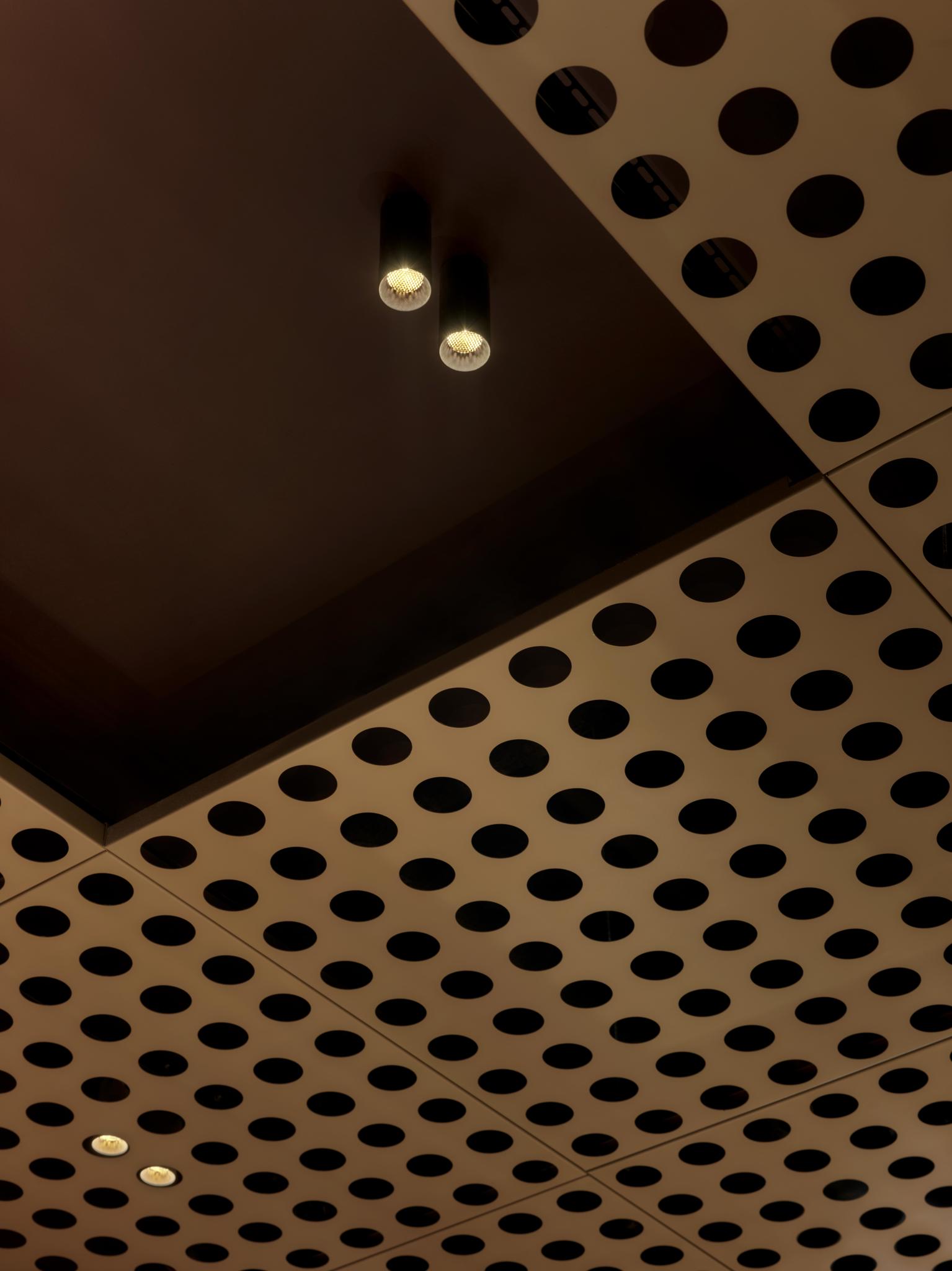 The perforated ceiling system introduces a secondary layer of order. Its repetitive circular grid conceals technical infrastructure while reinforcing the project’s modular discipline. Integrated lighting is recessed and restrained, allowing the illuminated product shelves and vertical light panels to act as primary luminous elements within the space.