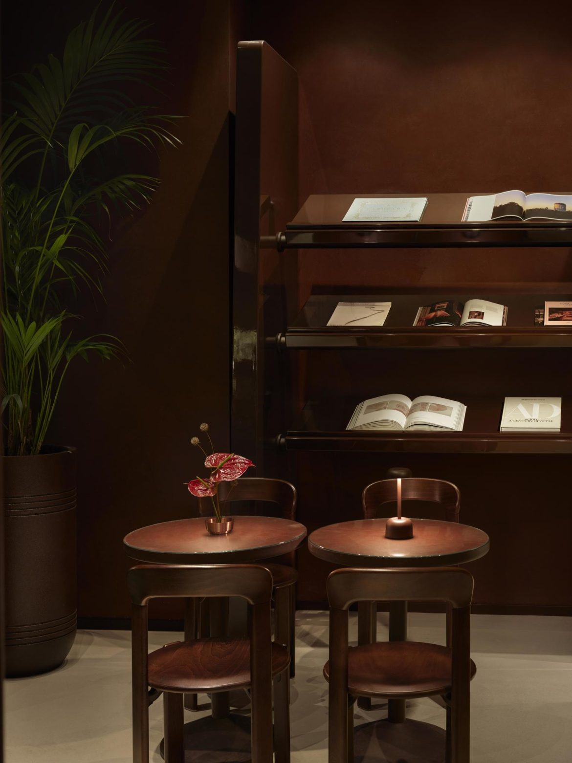 The seating zone is treated as an extension of the architectural palette, rather than as a separate environment. Compact wooden chairs and mineral-finished tables maintain material continuity, while the layout preserves a clear circulation corridor along the central axis. The result is a spatial hierarchy that prioritizes product visibility without compromising user comfort.