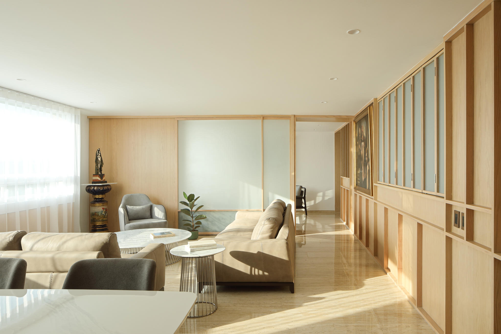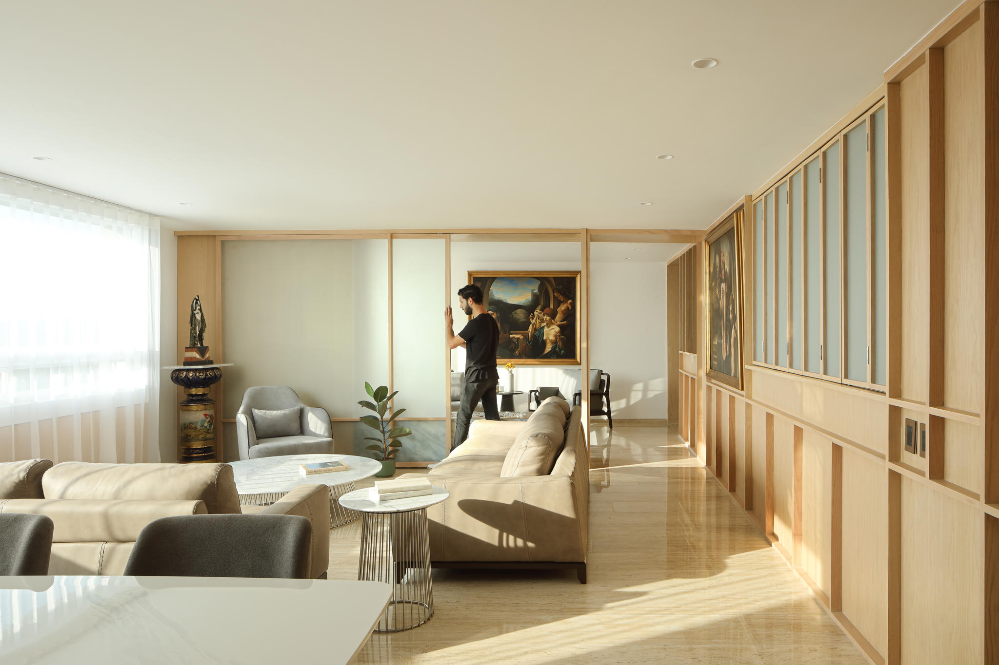 PH Sierra Vertientes is the complete renovation of a penthouse in Lomas de Chapultepec, a home that has been entirely transformed into a bright, spacious environment connected to both art and its surroundings. The project originated from a private commission that sought to reorganize a two level apartment to prioritize an open and comfortable living space with a clear relationship between the interior and the landscape.