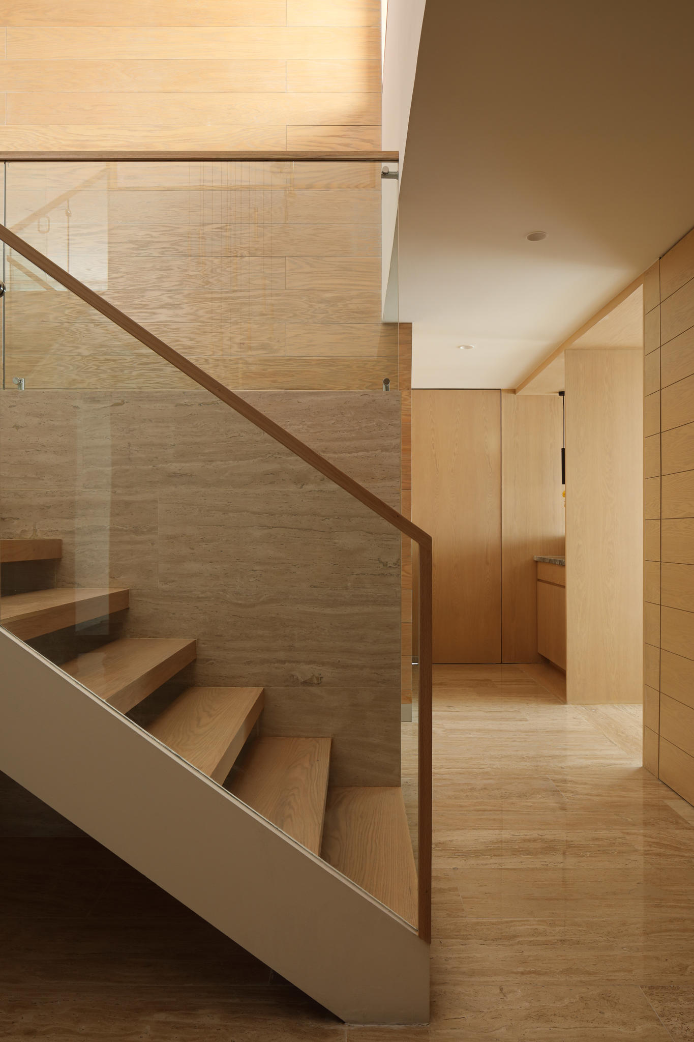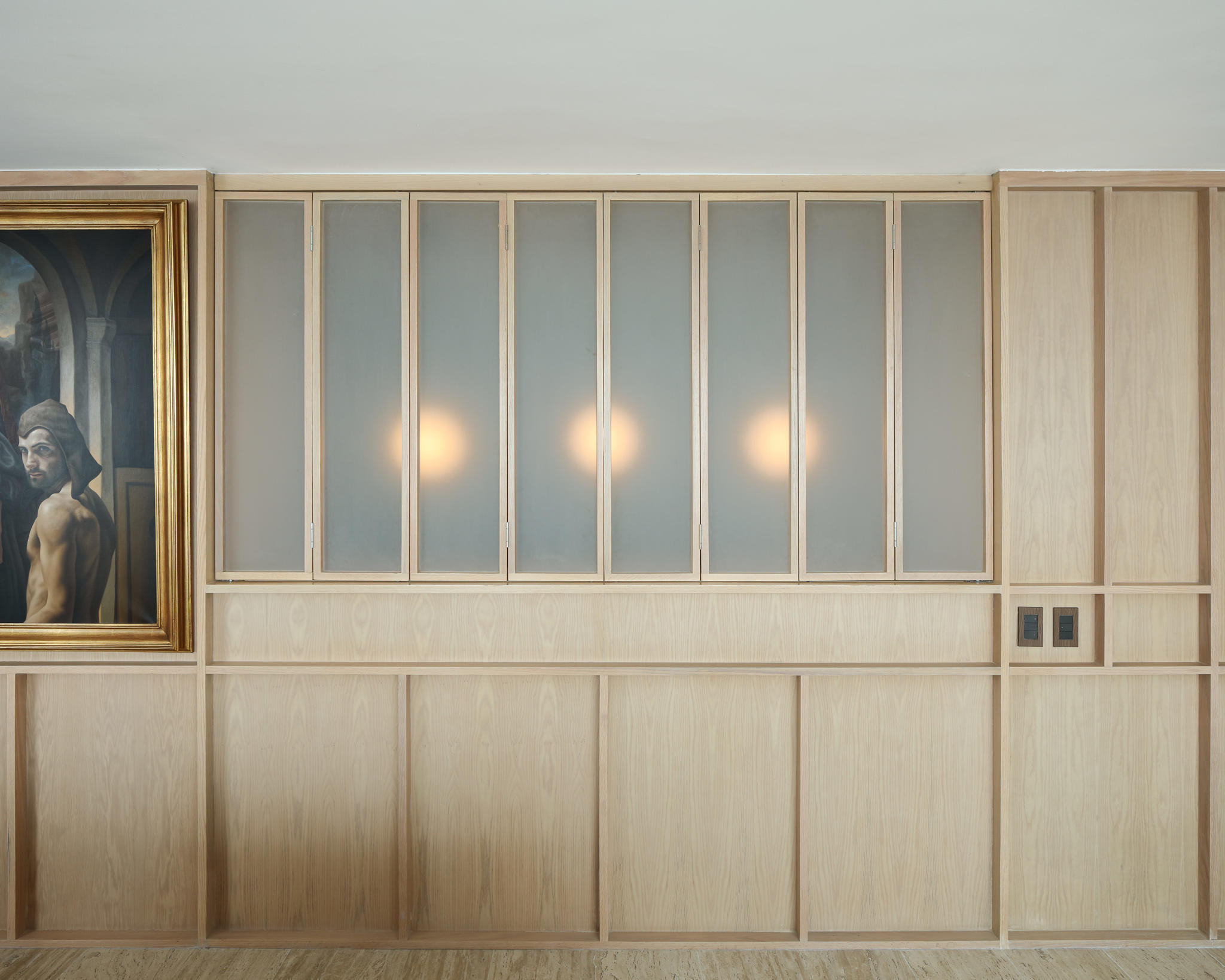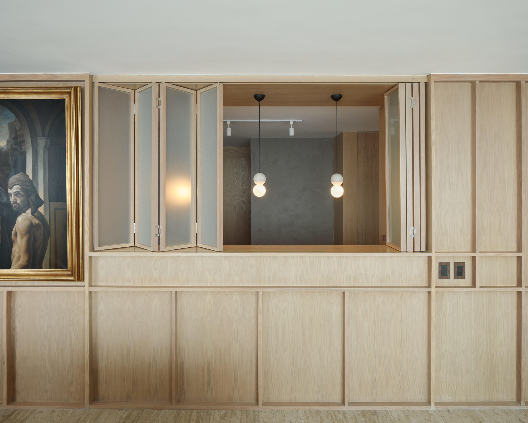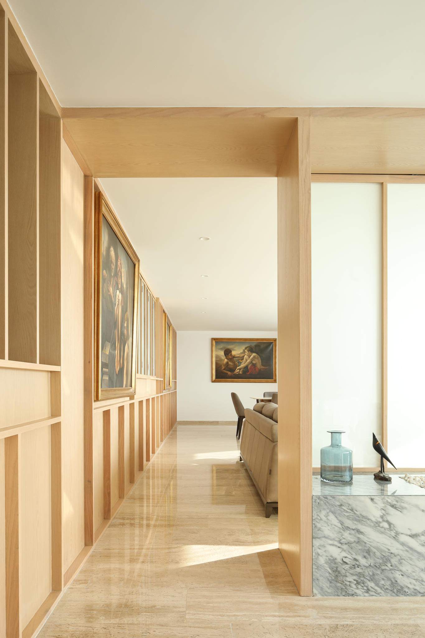 One of the key requirements was to transform the living and dining rooms into a domestic gallery. Light wood surfaces, precise planes, and well directed lighting create a serene context for displaying the art collection, generating a path where each piece finds its own place.