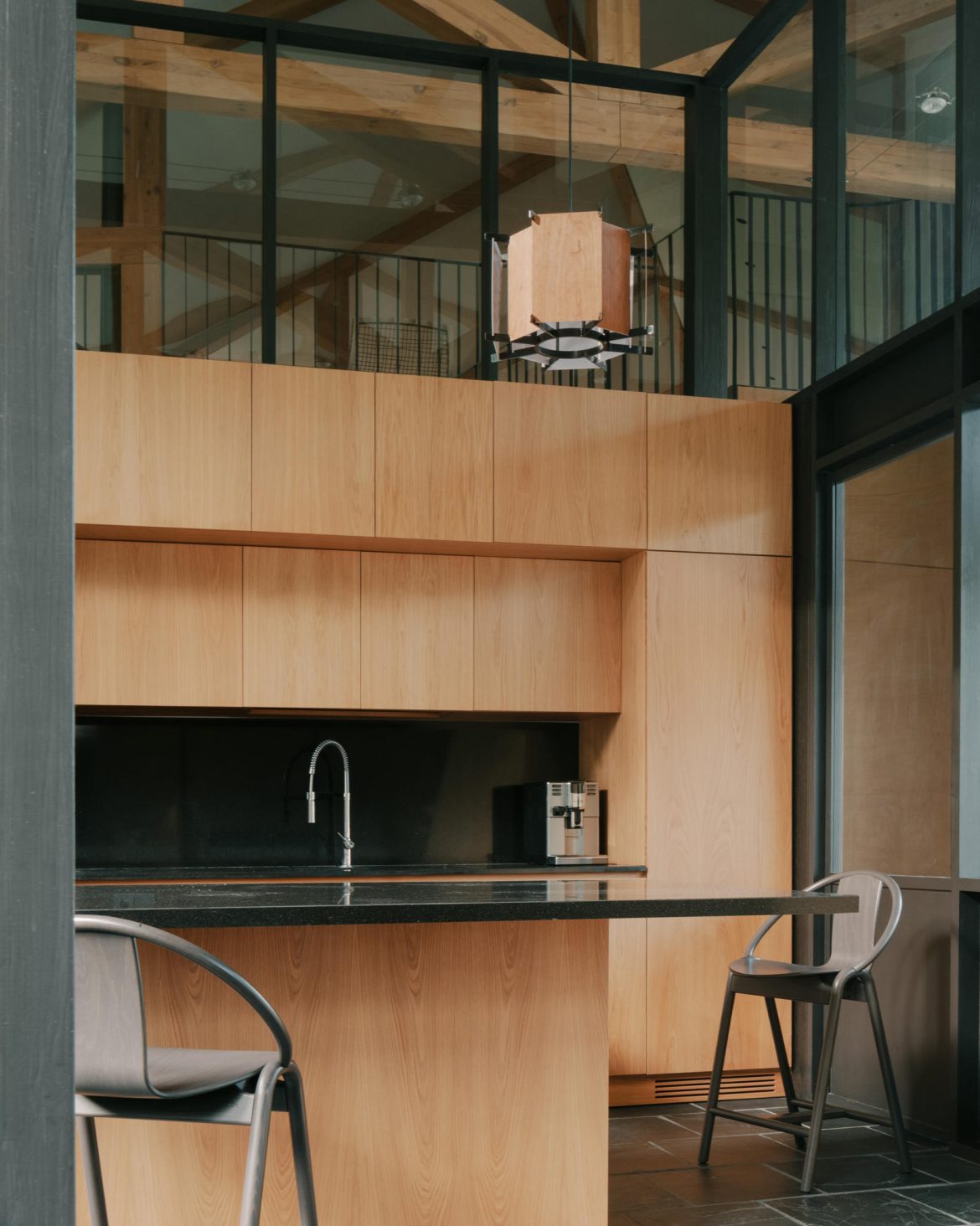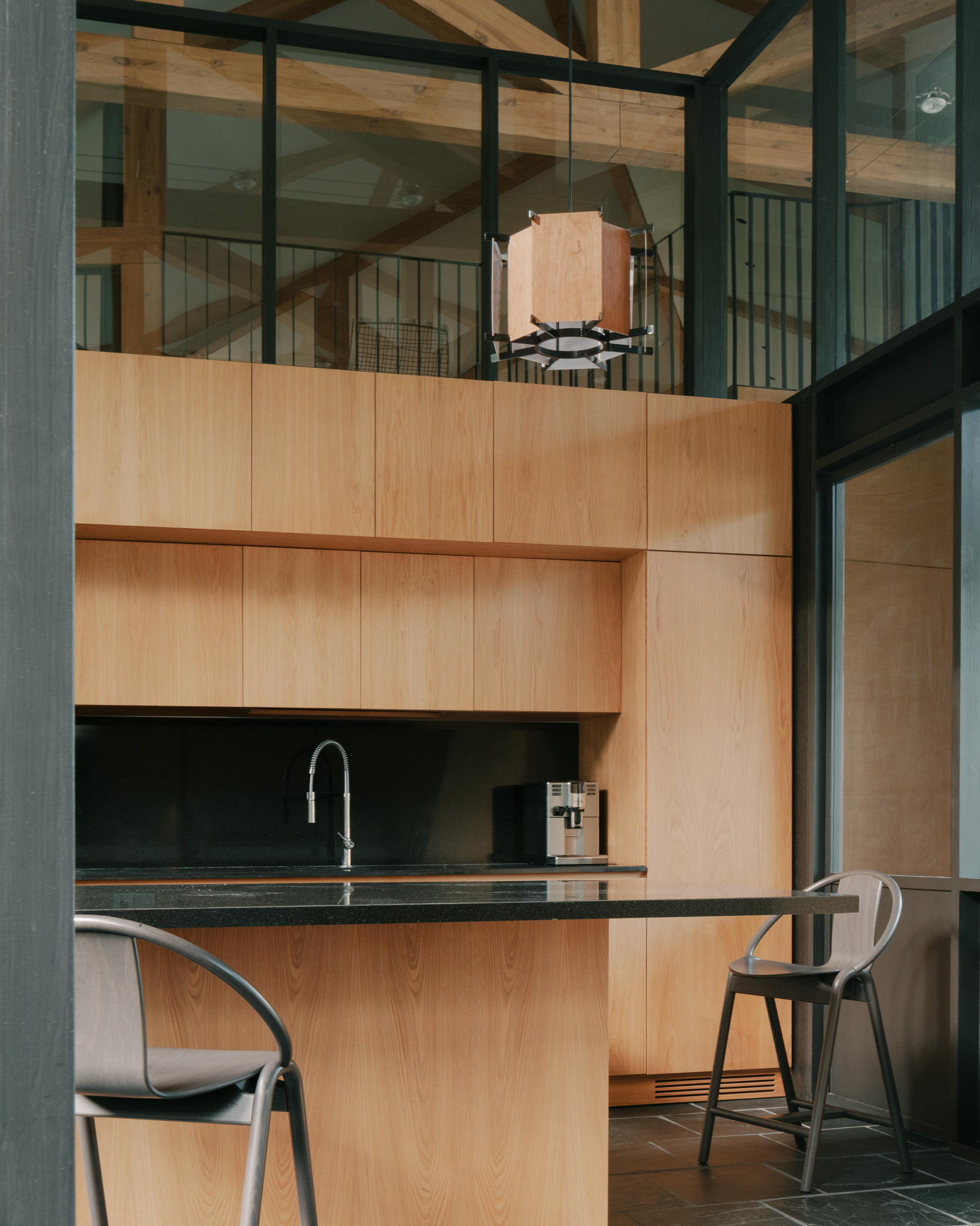 The interior is defined by a balance between rough and refined materials. Finishes are chosen for their texture and visual contrast, ranging from raw surfaces to polished details. This careful material selection results in an interior that feels cohesive, while offering variation in tone and feel.