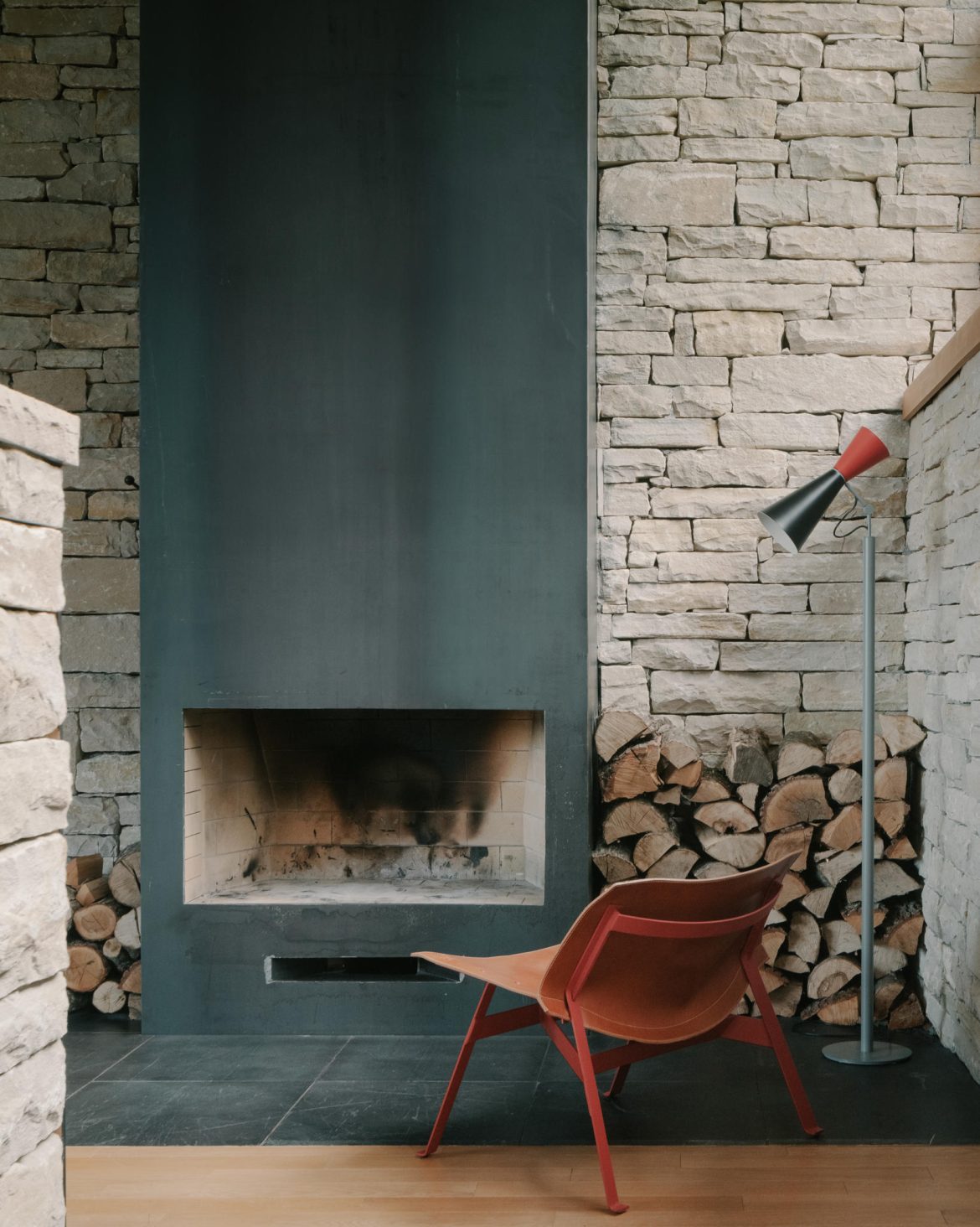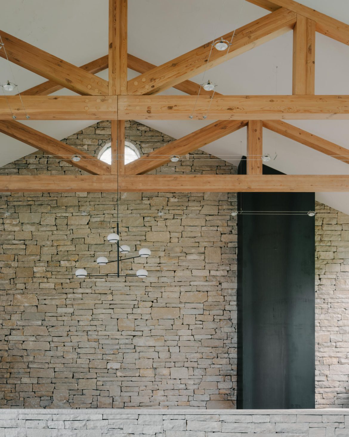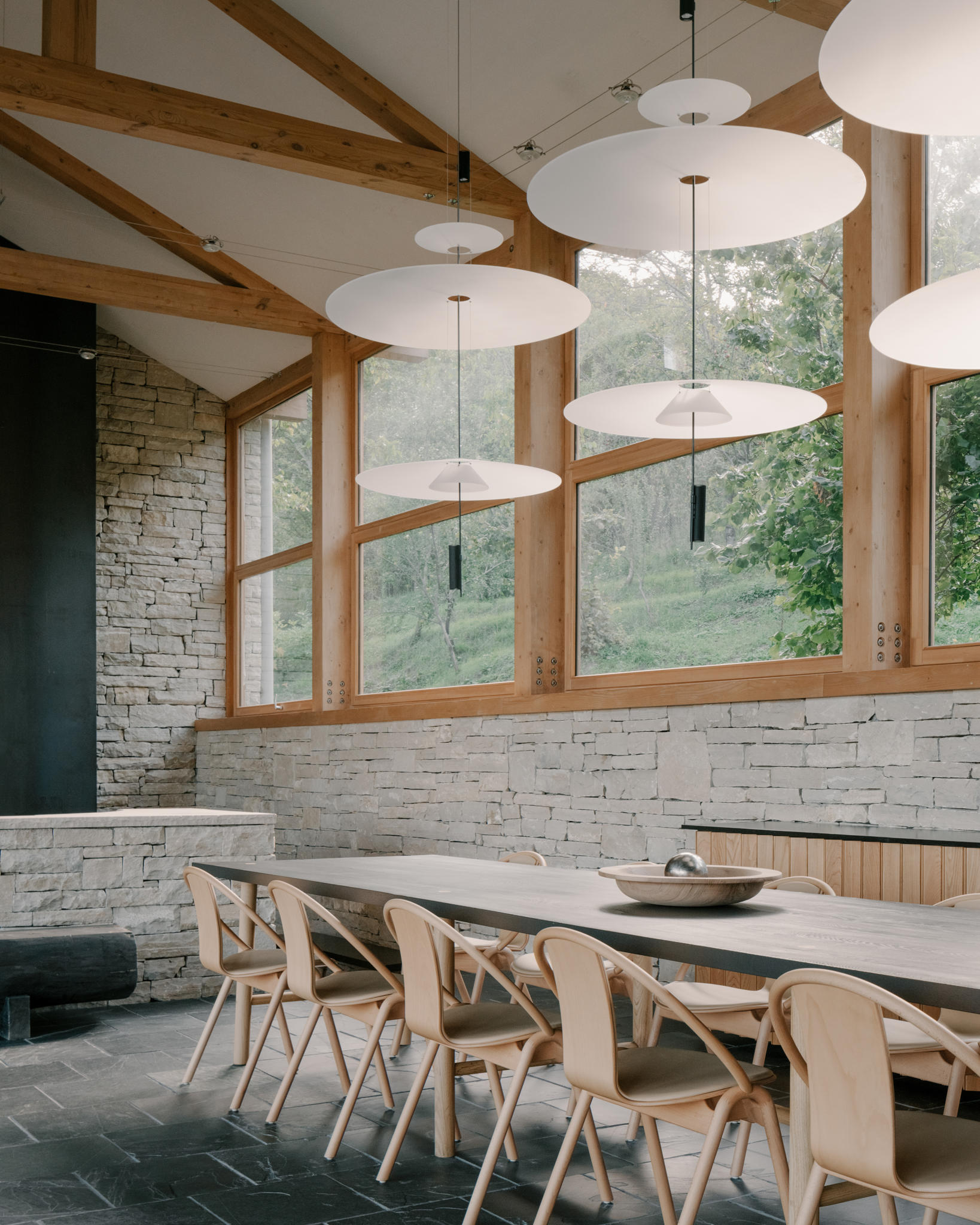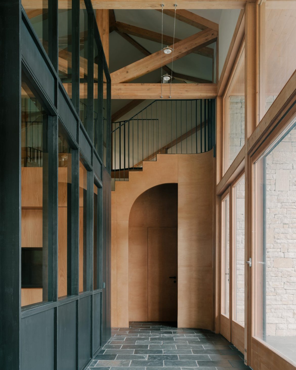 Natural materials are central to the project’s design approach. The use of stone and wood throughout the house contributes to a warm and grounded atmosphere. Large-format apertures in the façade open the building to its surroundings, allowing light and views to enter the space and creating a strong relationship between the architecture and the landscape.