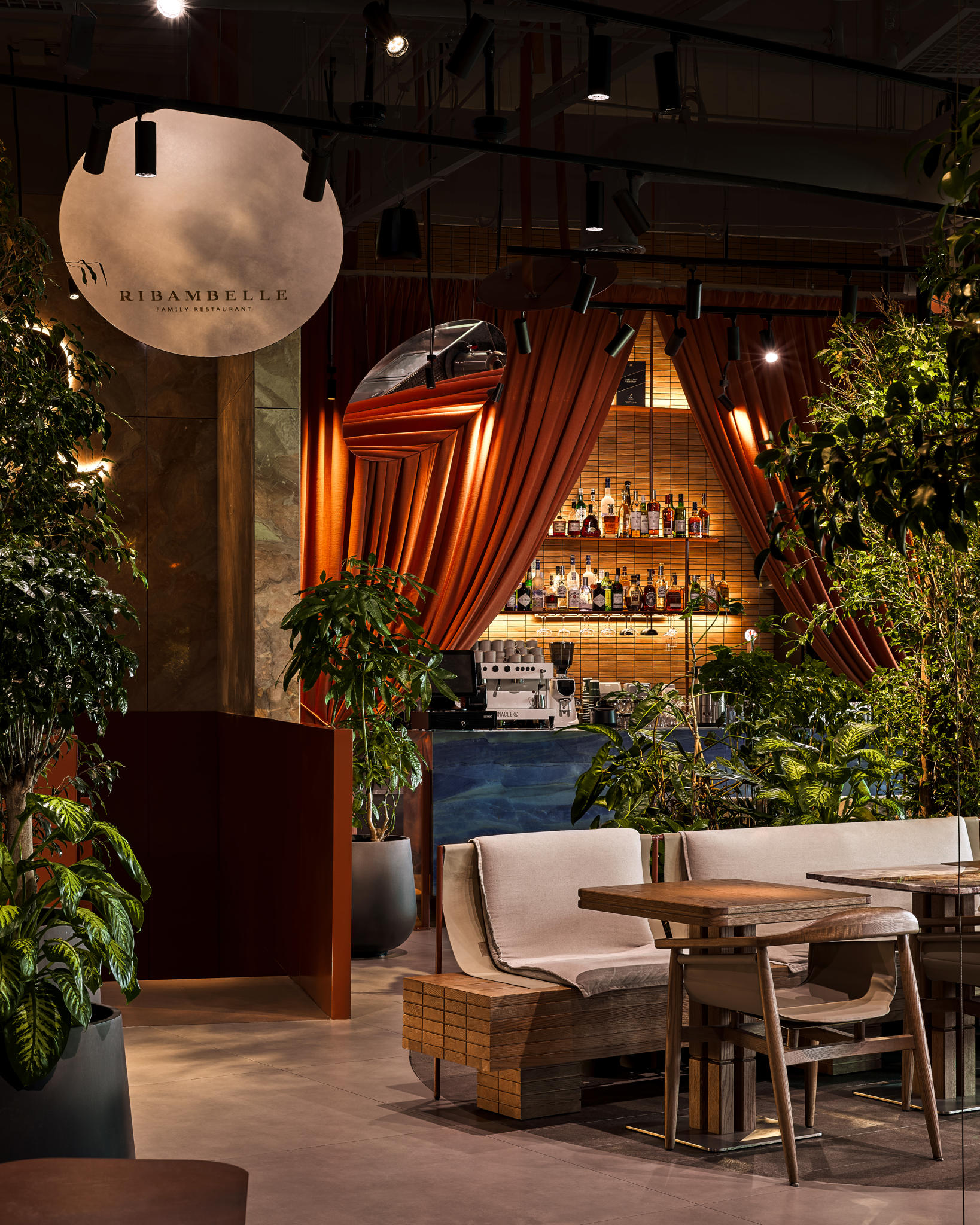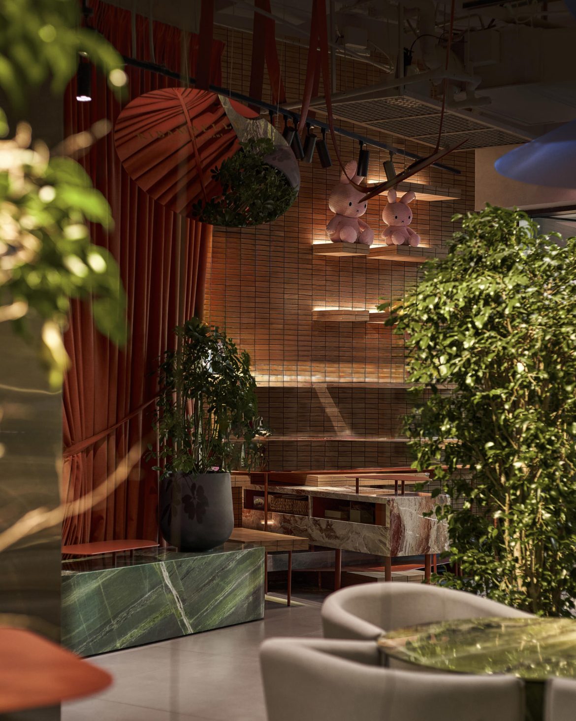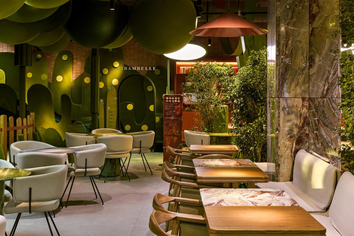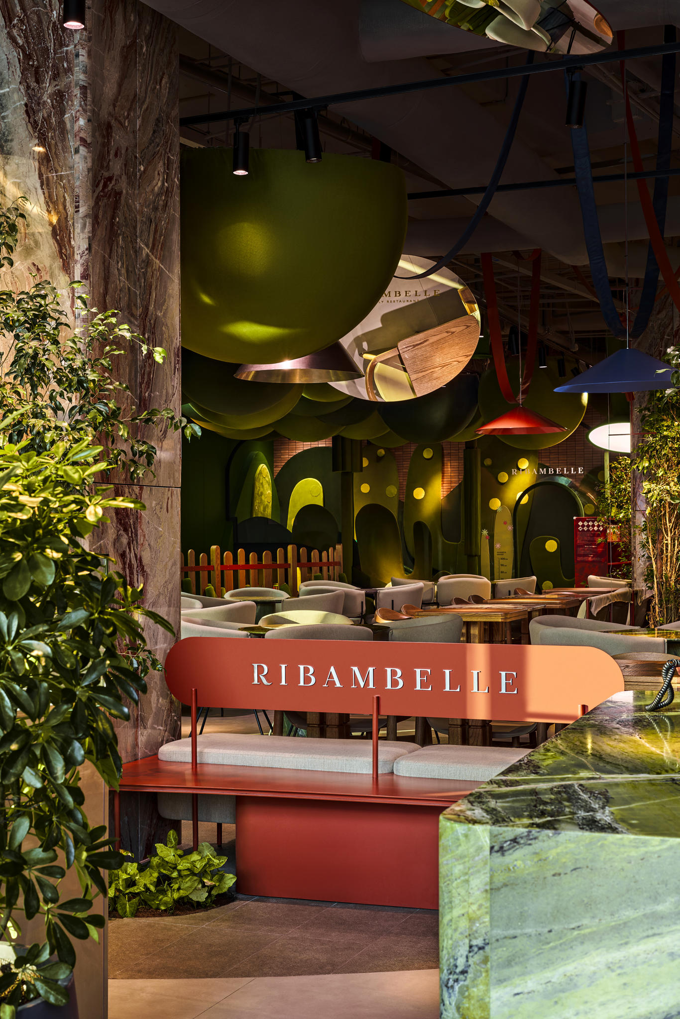 The visual concept of Ribambelle is based on the idea of making a natural oasis in the glass jungle of Dubai, where there are practically no green recreational areas. Hence, here we have recreated a secluded park drenched in greenery.