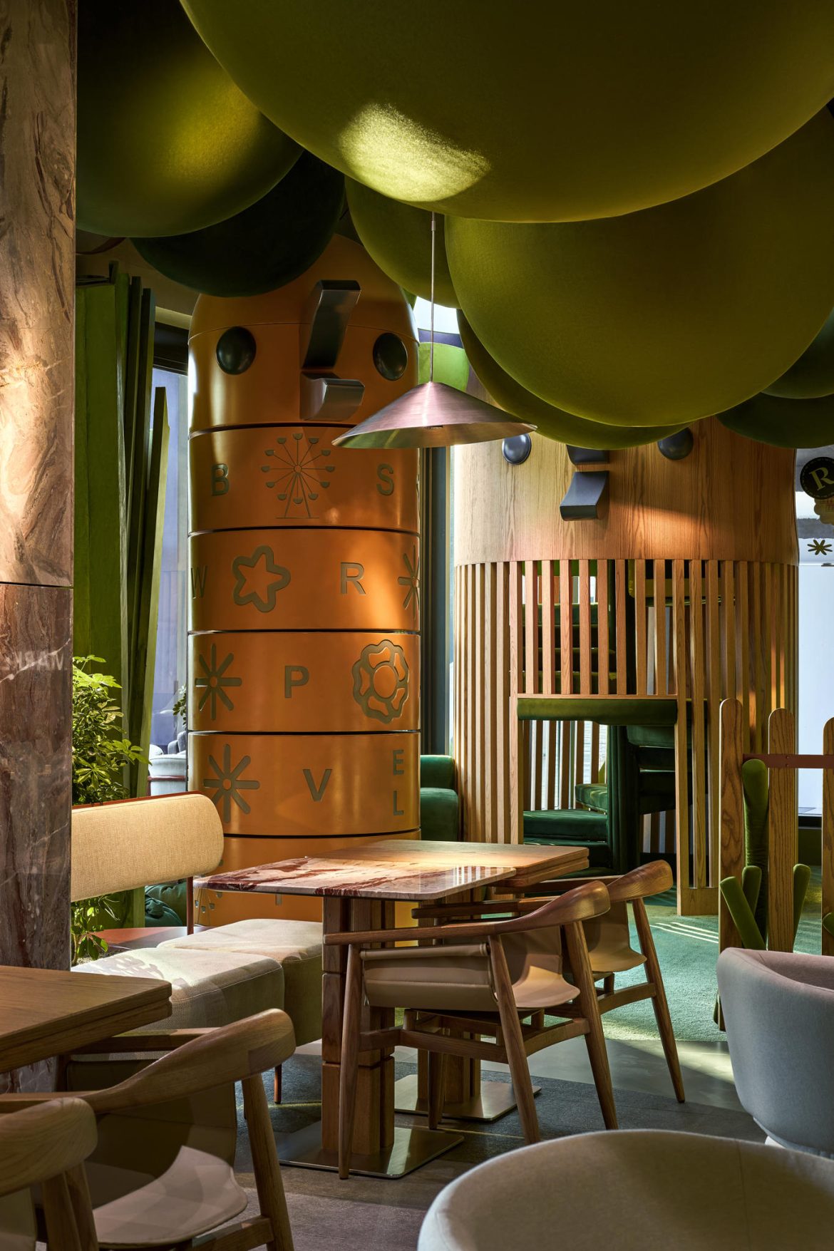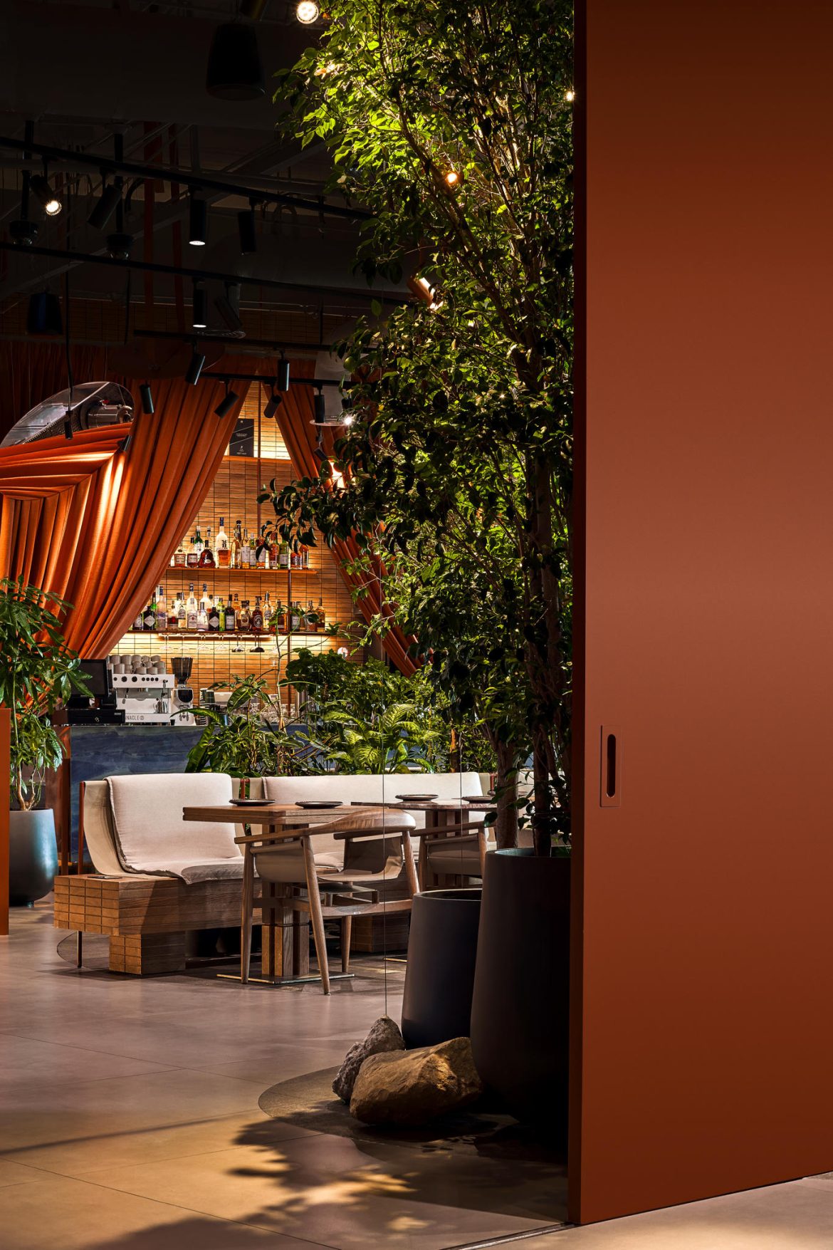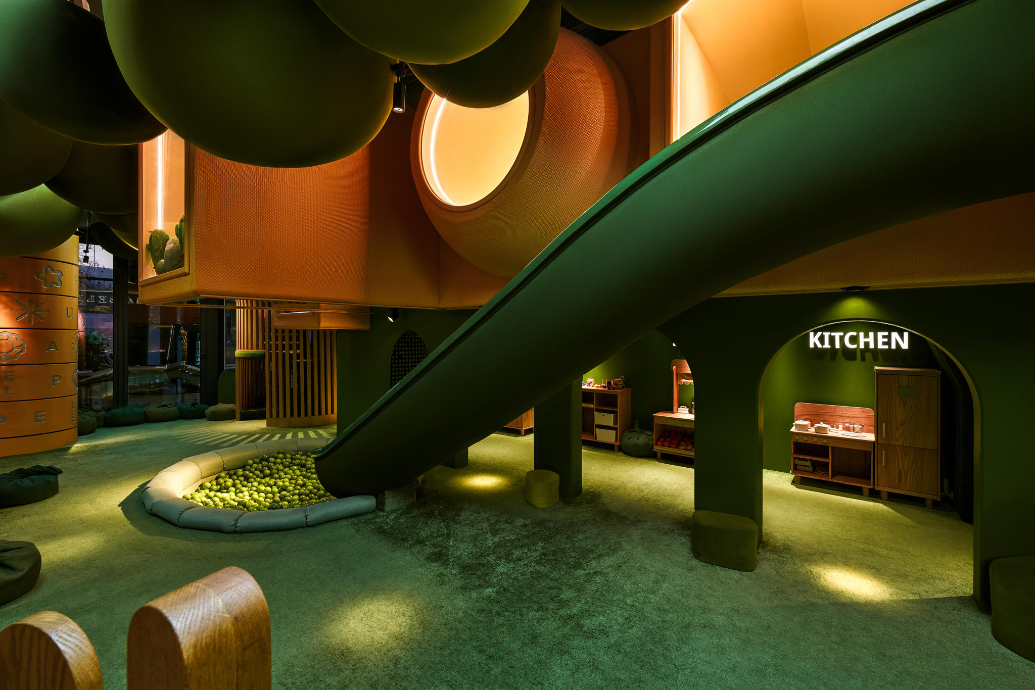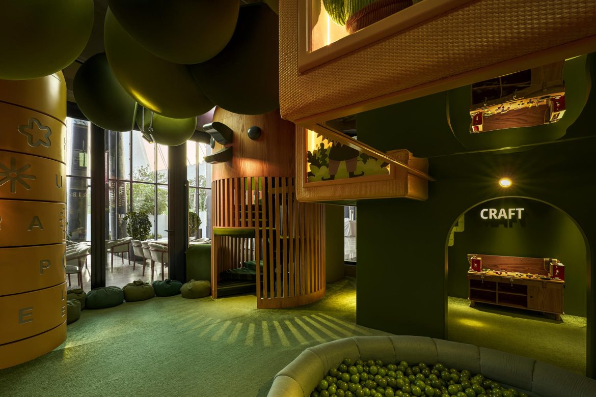 The restaurant area is decorated in natural colours with live plants, vines-lights hanging from the ceiling, and mirrors that create the effect of sun rays passing through the foliage due to reflection. The living plants in the main restaurant area gradually turn into a plush fairy-tale forest in the children’s area.