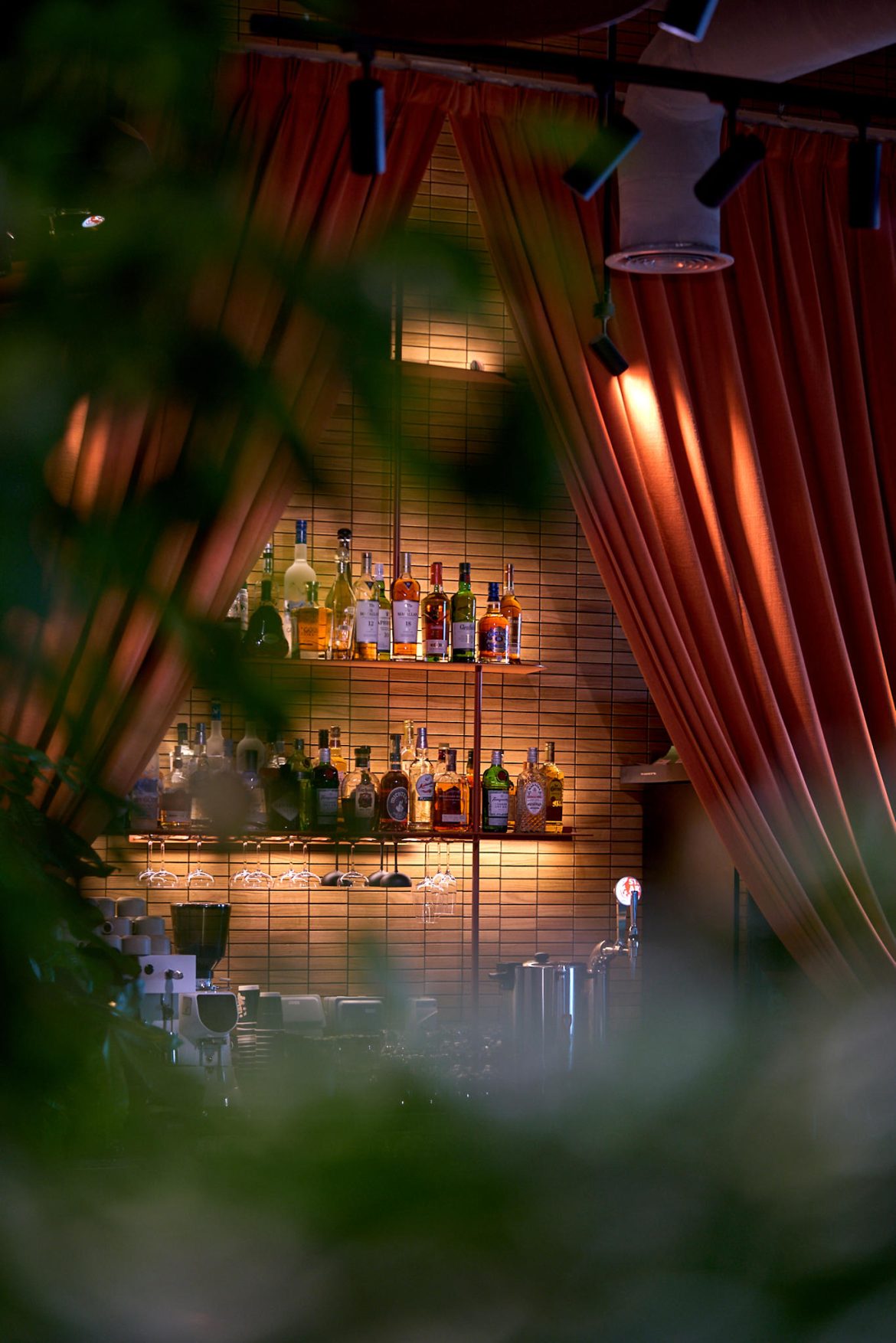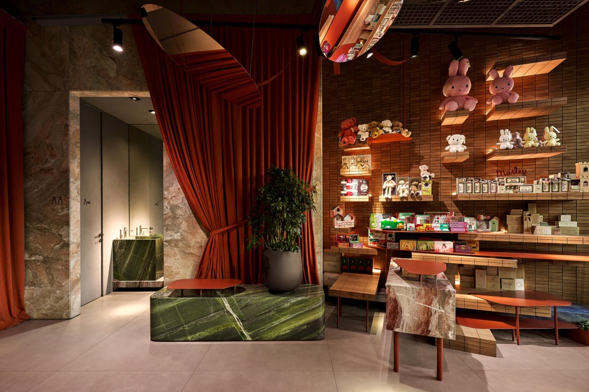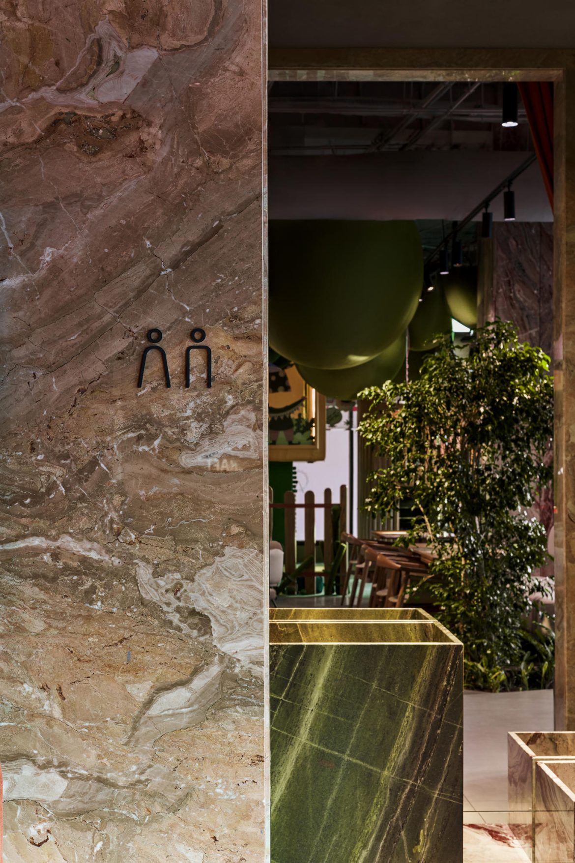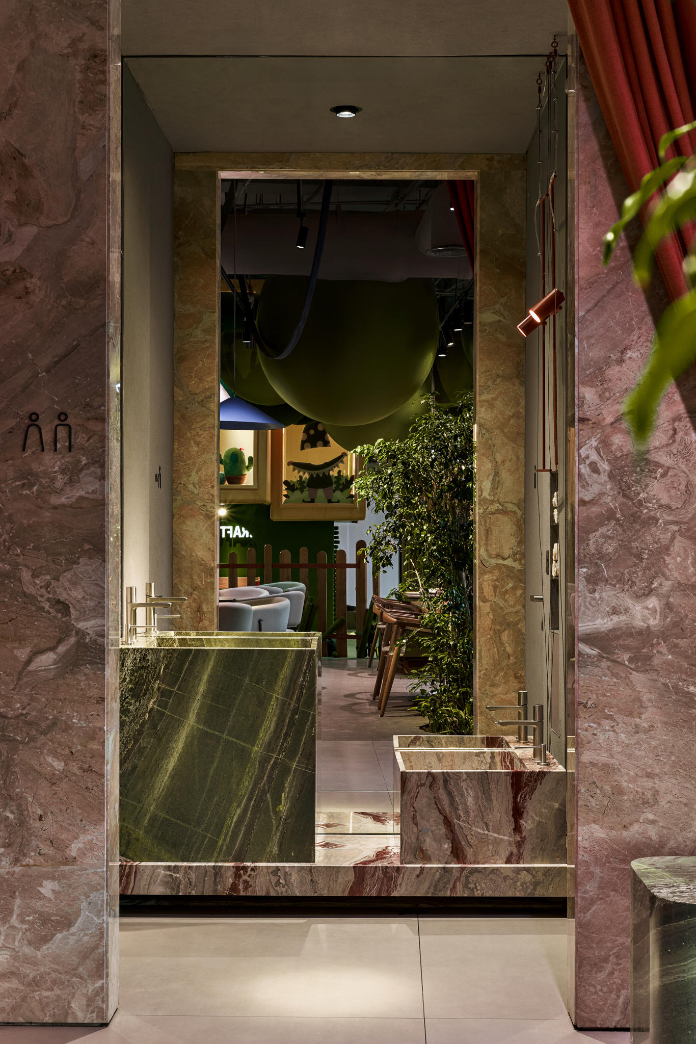 The restaurant area is decorated in natural colours with live plants, vines-lights hanging from the ceiling, and mirrors that create the effect of sun rays passing through the foliage due to reflection. The living plants in the main restaurant area gradually turn into a plush fairy-tale forest in the children’s area.
