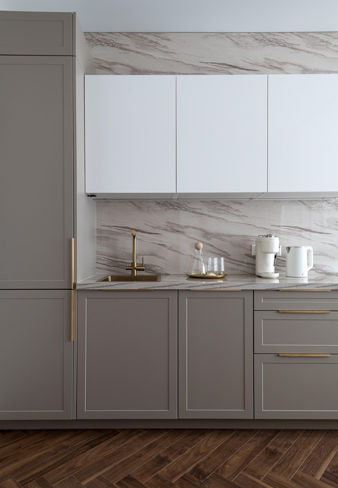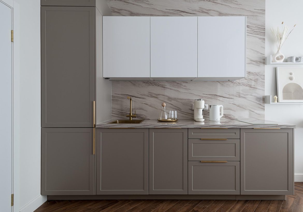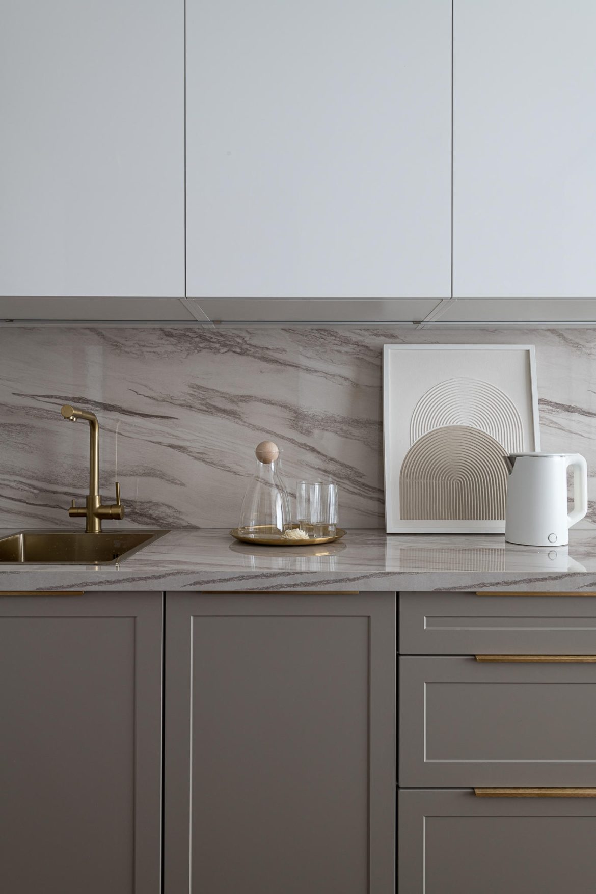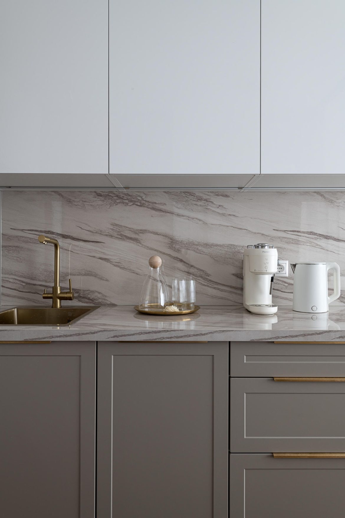 The kitchen is simple, functional, and stylish. The cabinets have a velvety texture, and the panels extend to the ceiling—a trendy seamless wall design. The pattern is carefully chosen so that the veins align perfectly, creating a seamless composition. Built-in appliances (dishwasher, microwave with grill, cooktop, and frost-free refrigerator) are concealed behind the cabinet doors. The sink is finished in a sophisticated gold color, resistant to scratches and tarnishing.
