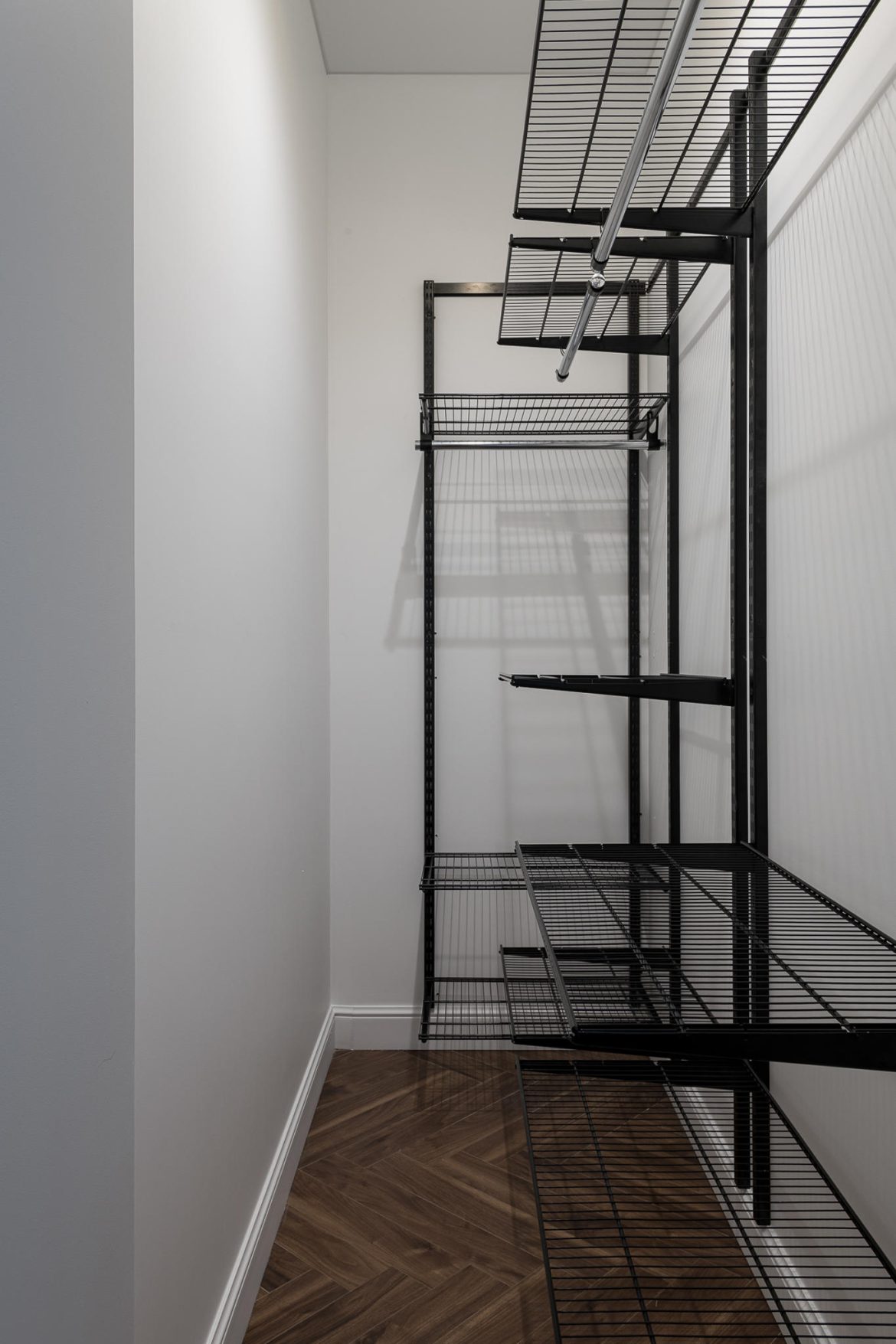 The walk-in closet is a hidden gem of the apartment. It’s thoughtfully designed down to the last detail: high shelves for suitcases, open niches for long garments, and a space for household items. It accommodates everything while remaining invisible from the