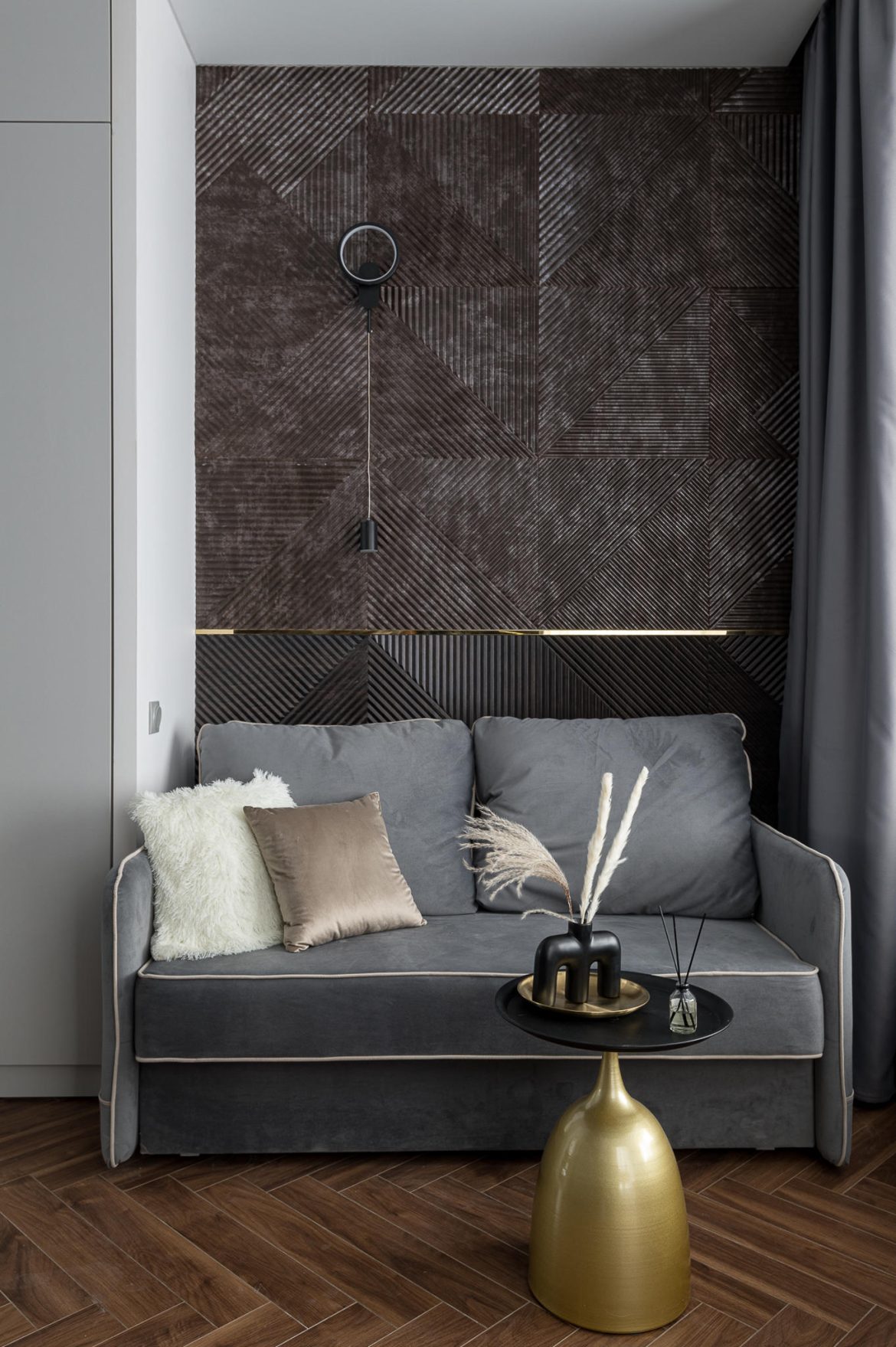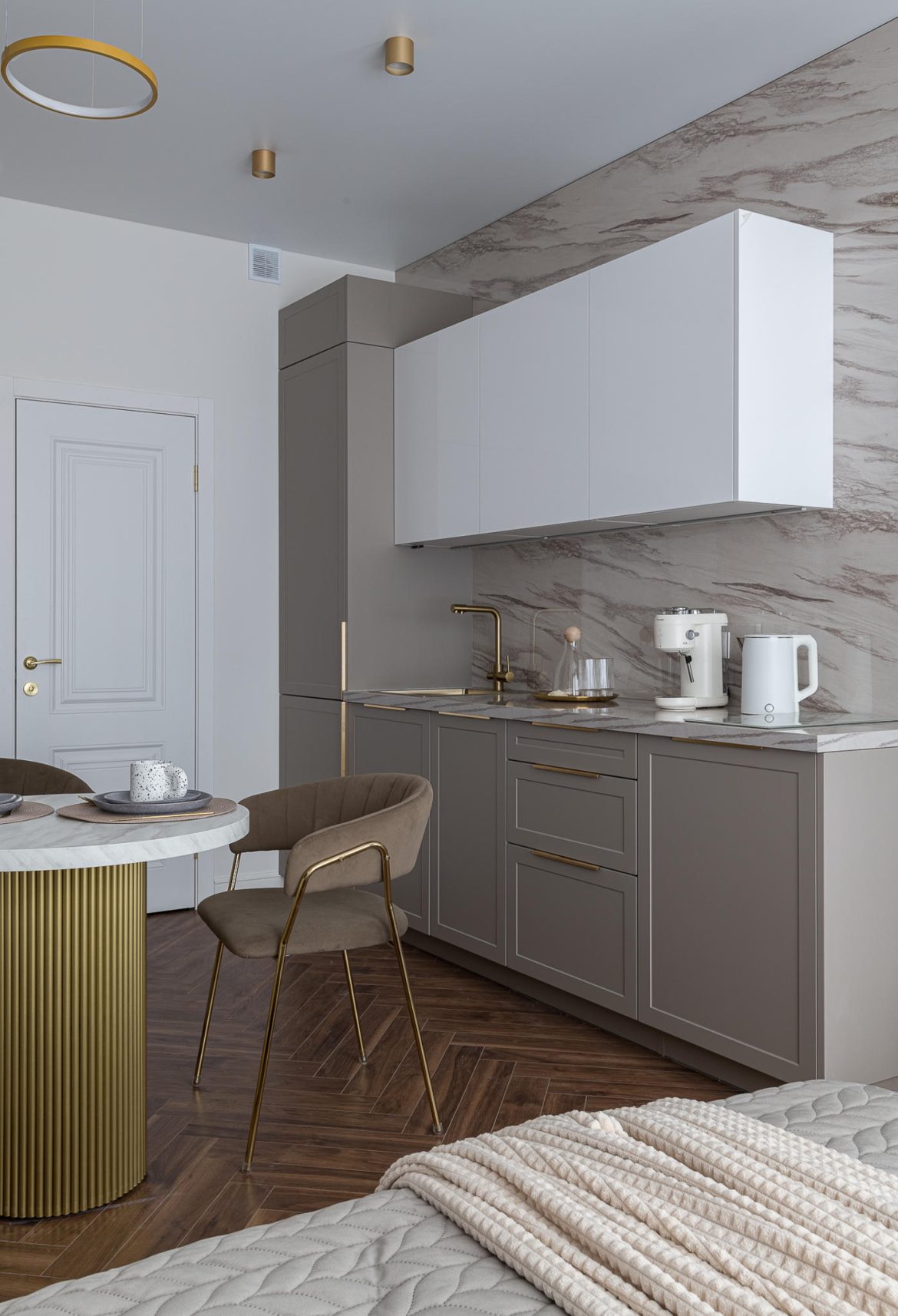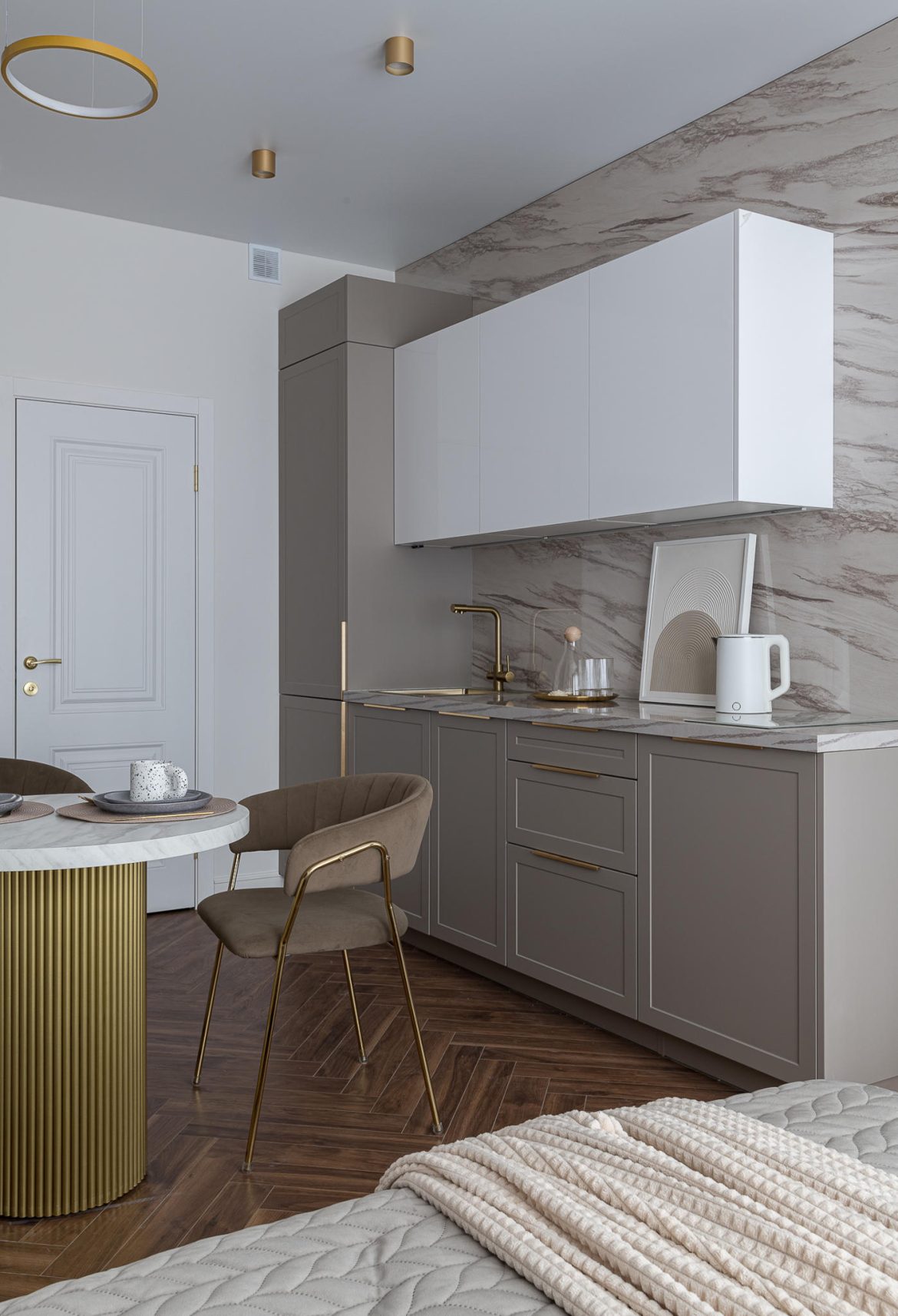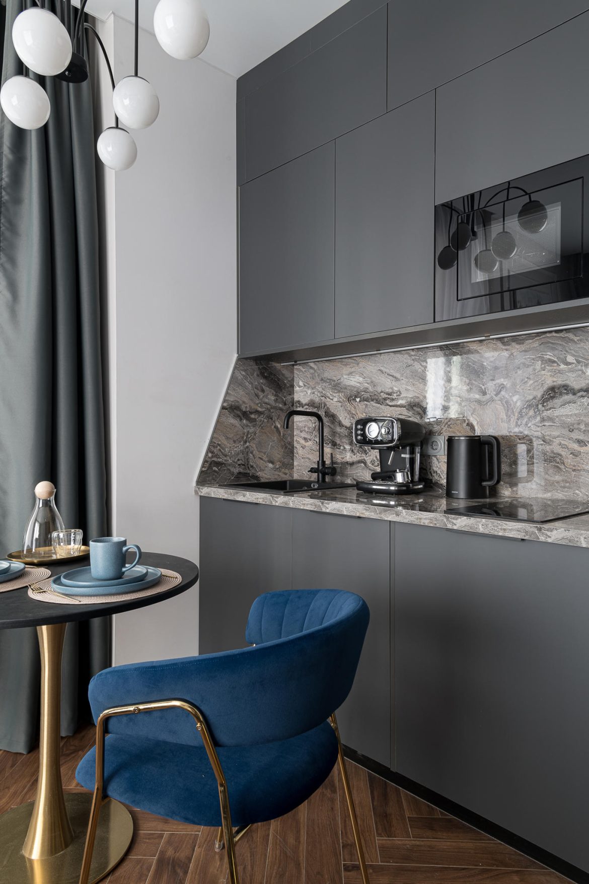 The second apartment continues the idea of luxurious compactness, taking the best from the first studio: a sense of high class, impeccable geometric lines, and a harmony of textures and materials. Here, too, every detail has been carefully considered, from the lighting to the storage system, but a single color scheme completely transforms the apartment.