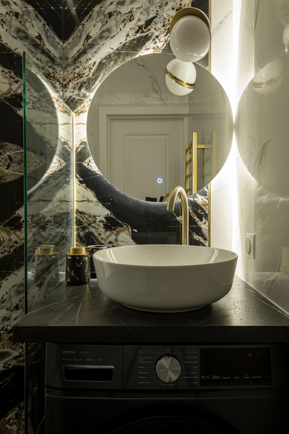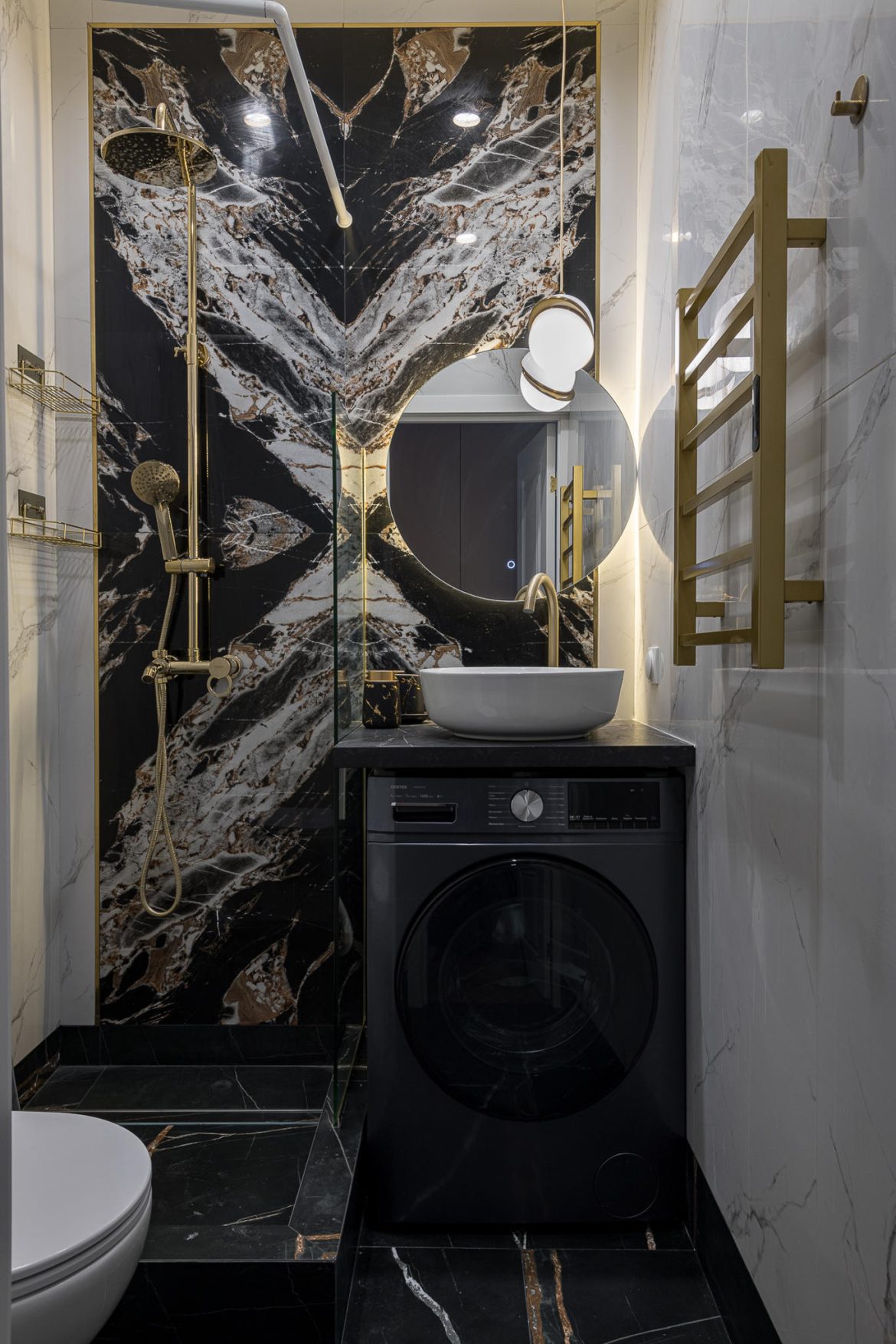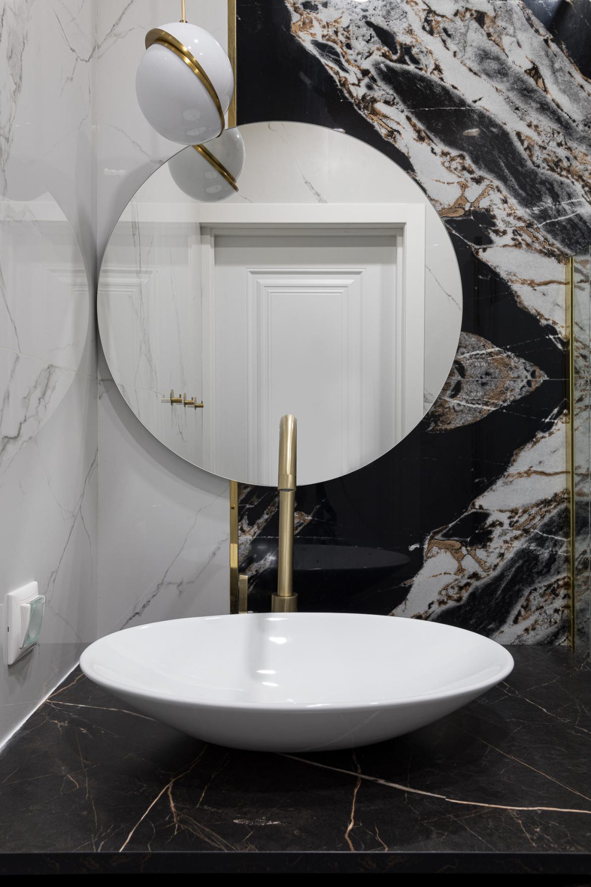 The bathroom is like a luxury hotel. Particular attention is paid to the symmetrical pattern of the porcelain tile slabs: the mirrored marble texture creates a symmetrical effect that looks particularly expensive. Gold accents along the tile edges emphasize luxury, yet in a discreet, sophisticated manner. All surfaces that come into contact with the feet are made of matte, non-slip porcelain tile, while the rest of the tiles are glossy, creating a play of reflections and light.