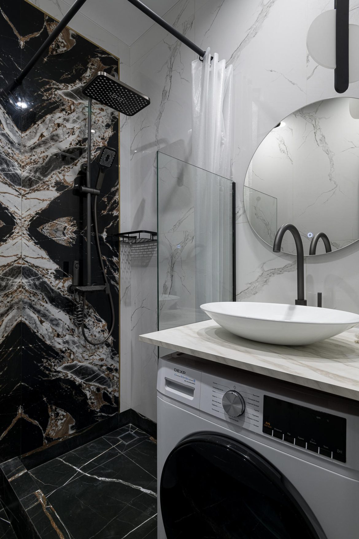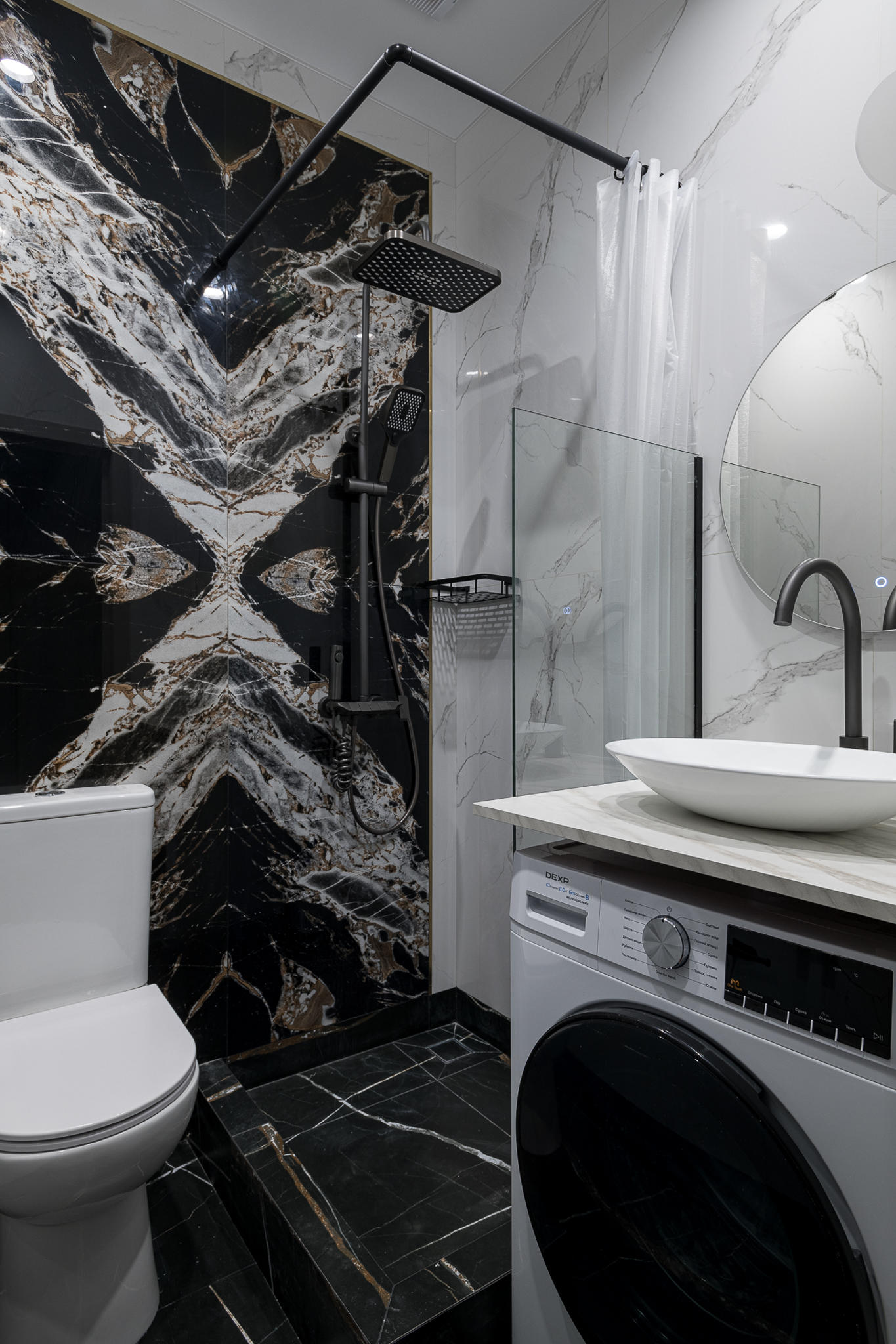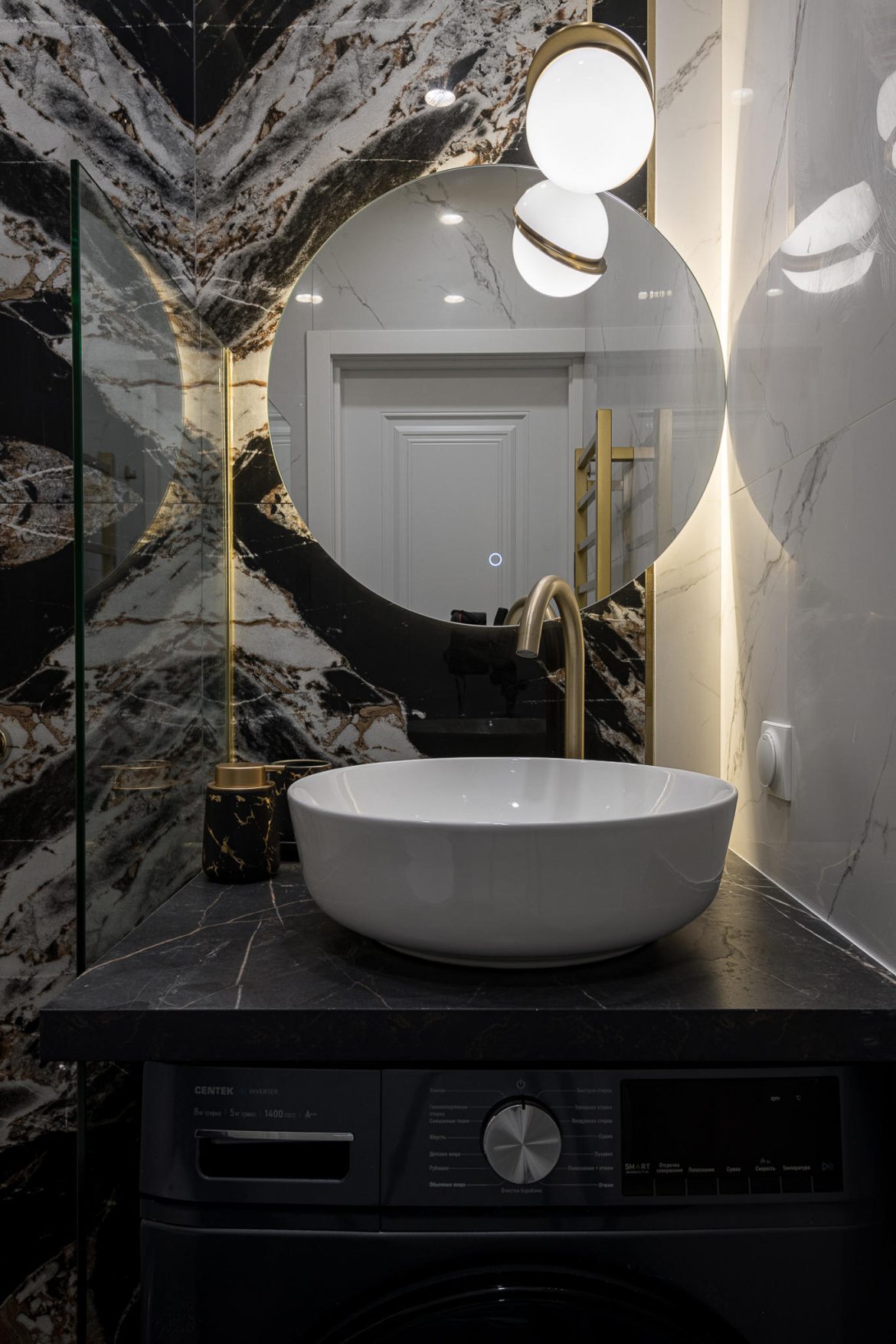 The bathroom is like a luxury hotel. Particular attention is paid to the symmetrical pattern of the porcelain tile slabs: the mirrored marble texture creates a symmetrical effect that looks particularly expensive. Gold accents along the tile edges emphasize luxury, yet in a discreet, sophisticated manner. All surfaces that come into contact with the feet are made of matte, non-slip porcelain tile, while the rest of the tiles are glossy, creating a play of reflections and light.