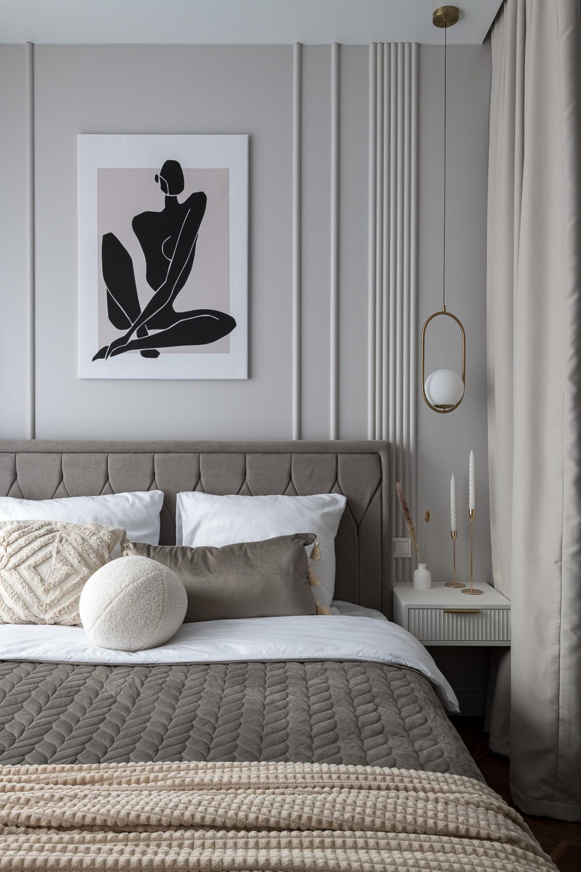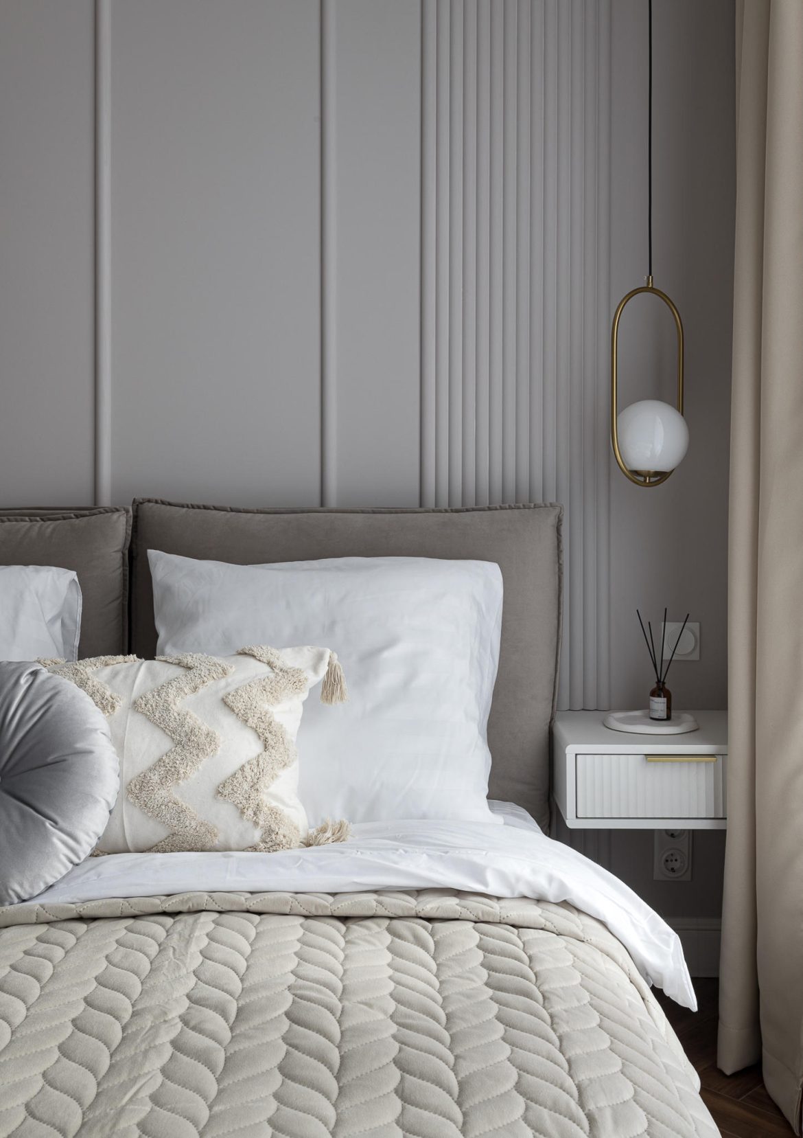 The bed is designed to appear to float above the floor. The structure is hidden, and the bed itself appears to float—an expression of lightness, aesthetics, and a technologically advanced approach. Above the bed is a simple decorative panel and a stylish textured molding solution. The bedside tables are mounted to the wall, creating a floating effect