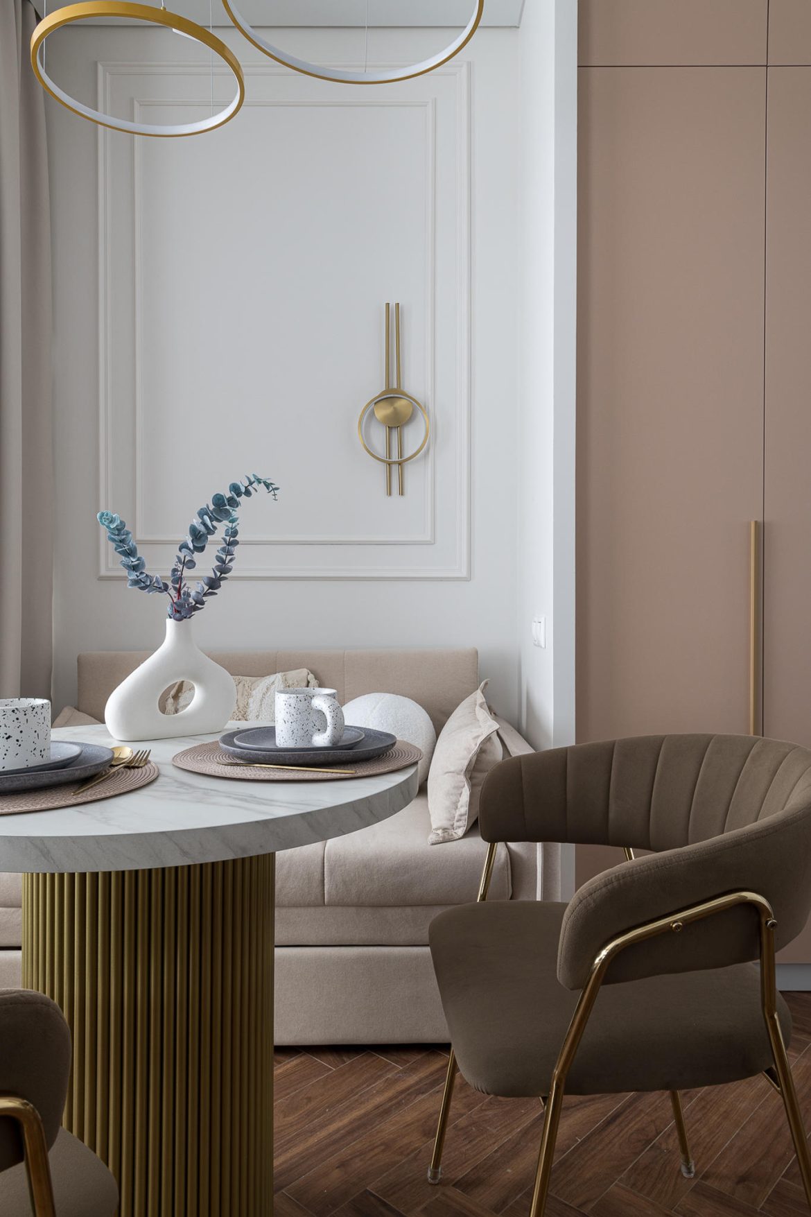 The dining area is a special highlight. A round white table with a textured gold column base and cappuccino-colored chairs with soft upholstery. This space is perfect for a romantic dinner, morning coffee, or a cozy evening reading session.
