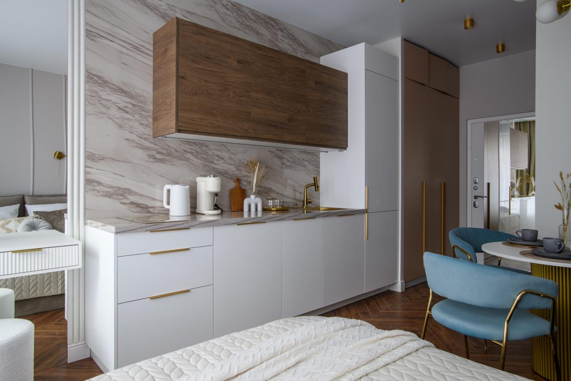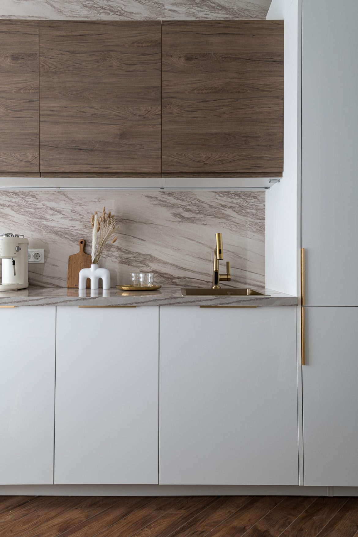 The white matte kitchen cabinets are complemented by wooden upper cabinets – a contrast that adds warmth and naturalness to the composition. Gold accents are also retained throughout the interior, emphasizing the overall style of glossy, understated luxury.