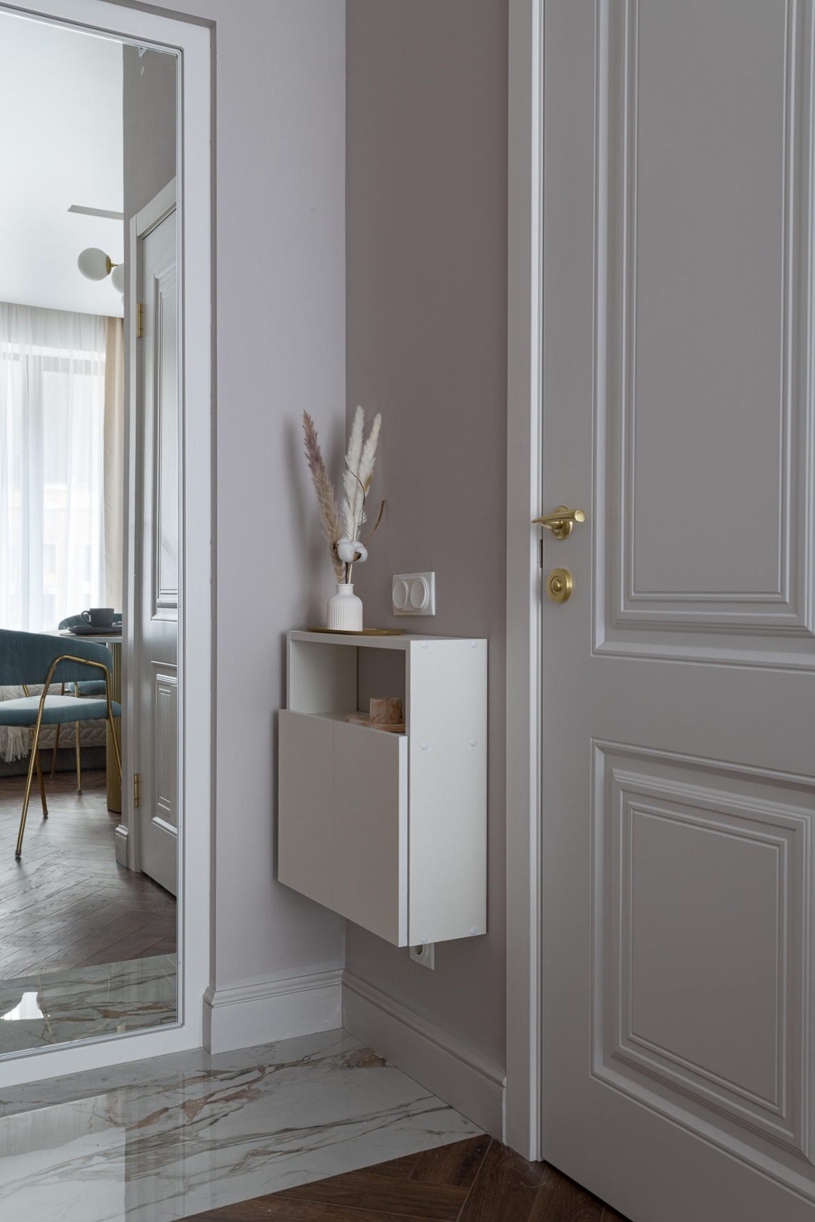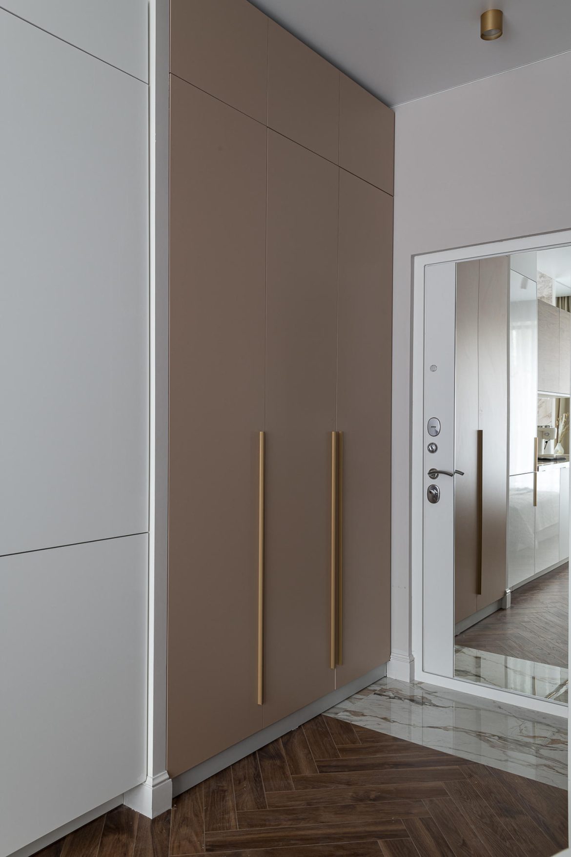 The entrance door is massive, weighing 130 kg, with three levels of security and a large mirror on the inside. It reflects light, visually expanding the space, and is conveniently located next to the wardrobe.