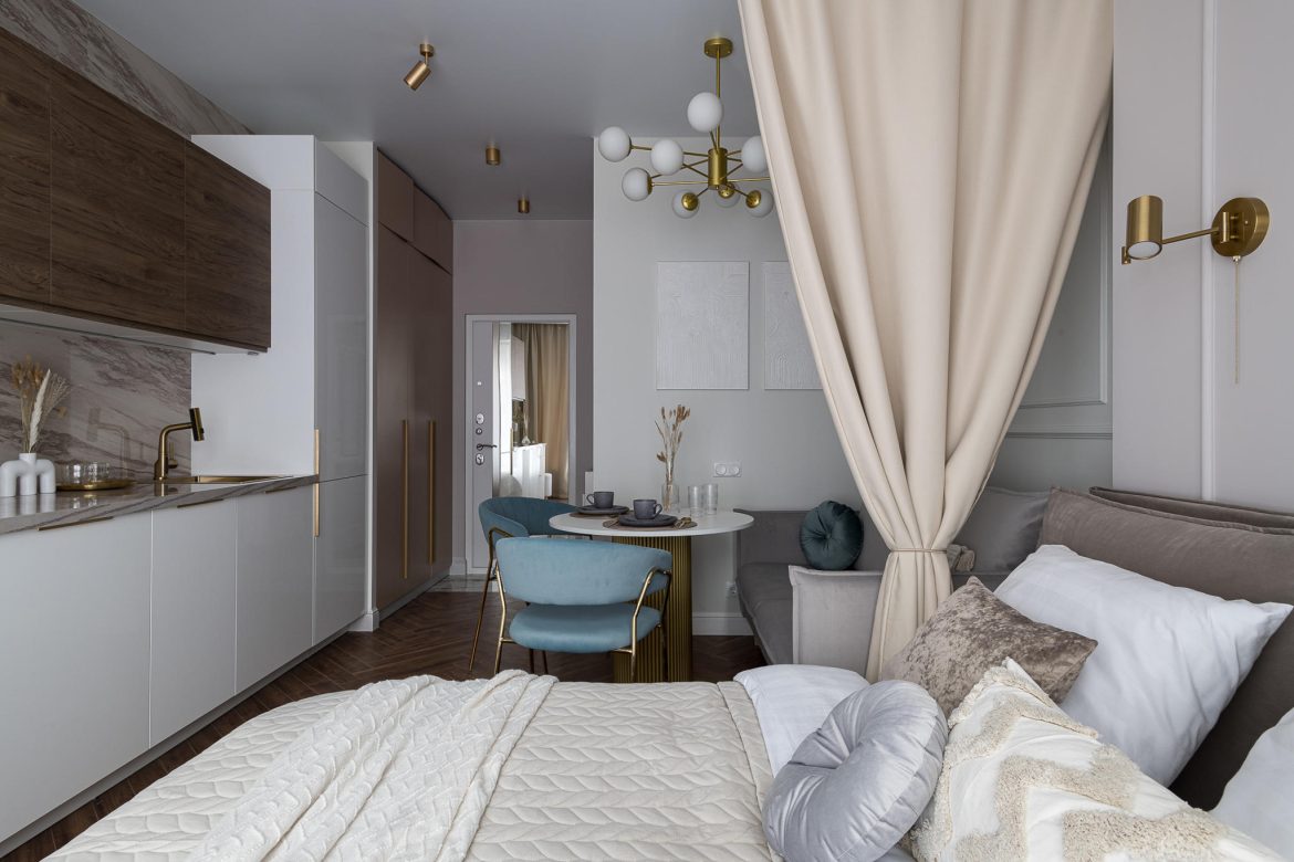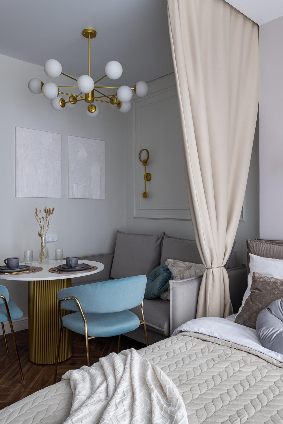 One of the most pleasing features is the mirror opposite the bed. Waking up, a person sees themselves reflected in the room, filled with morning light. This creates a sense of inner dialogue with the space and energizes them for the day. Apartment 2 is another stylish example of how to create not just a compact home, but an atmospheric, bright, and inspiring space that makes living a pleasure.