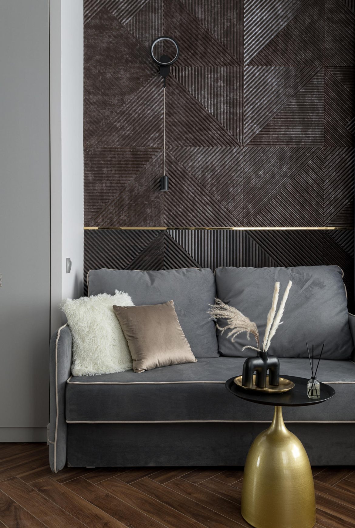 This apartment is not about compromise. It is bold, expressive, and completely self- sufficient. Here, dark shades and rich textures are not hidden, but rather resonate loudly – in the walls, in the furniture panels, in the mirrors, in the dramatic contrasts. The interior evokes emotions and creates an atmosphere of space in which you want to stay, retreat, feel, live, and create.