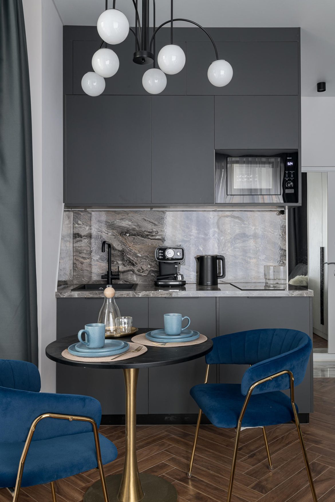 The dining area is a stage in itself in this apartment. A round table with two deep blue armchairs sits directly under the lamp, creating an intimate, almost theatrical composition. It’s the perfect spot for an evening dinner for two, with the city lights outside and the warmth of the chandelier reflected in the mirror.